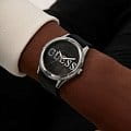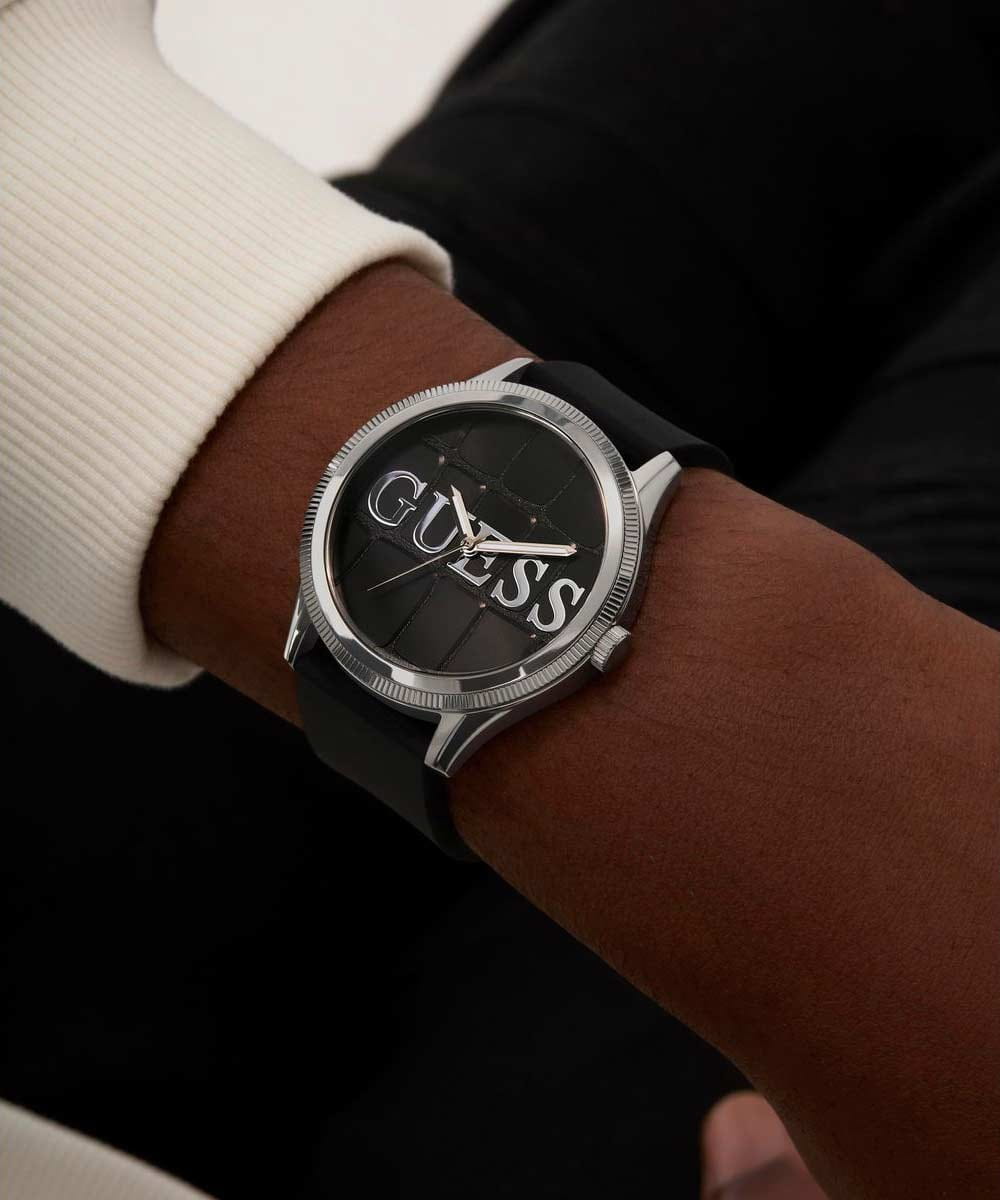 Изысканные мужские наручные часы Guess GW0887G1 станут стильным дополнением к вашему образу. Эти часы, оснащены надежным кварцевым механизмом, обеспечивающим точность и долговечность. Круглый корпус выполнен из прочной стали и украшен рифленым безелемБезельВнешний ободок, закрепляющий стекло. В спортивных часах так называется поворотное кольцо с делениями на циферблате, выполняет роль таймера – замеряет отрезки времени на шкале. Неподвижный безель – элемент декора. Однонаправленно вращающийся безель на дайверских часах позволяет фиксировать моменты погружения и выныривания на поверхность., придающим изделию особый шарм. Черный фактурный циферблат без меток дополнен логотипом бренда, что создает элегантный и современный вид. Рифленая заводная головка добавляет часам функциональности и эстетической завершенности. Силиконовый ремешок с классической застежкой обеспечивает комфортное прилегание к запястью и надежную фиксацию. Минеральное стеклоМинеральное стеклоМинеральное стекло представляет собой искусственно выращенный минерал кварца. Такое стекло отличается особой устойчивостью к повреждениям и царапинам. Уступает по некоторым качествам сапфировому стеклу. защищает циферблат от царапин и других повреждений, сохраняя его безупречный вид. Водозащита уровня 30WR гарантирует защиту от случайных брызг и дождя, что делает эти часы практичным аксессуаром для повседневной жизни.  Люминесцентное покрытиеЛюминесцентное покрытиеПозволяет считывать показания времени в темноте. Производители наносят на стрелки, часовые индексы, безель или поверхность циферблата светонакопительный состав, дающий холодное свечение. на стрелках обеспечивает отличную видимость в темноте.