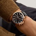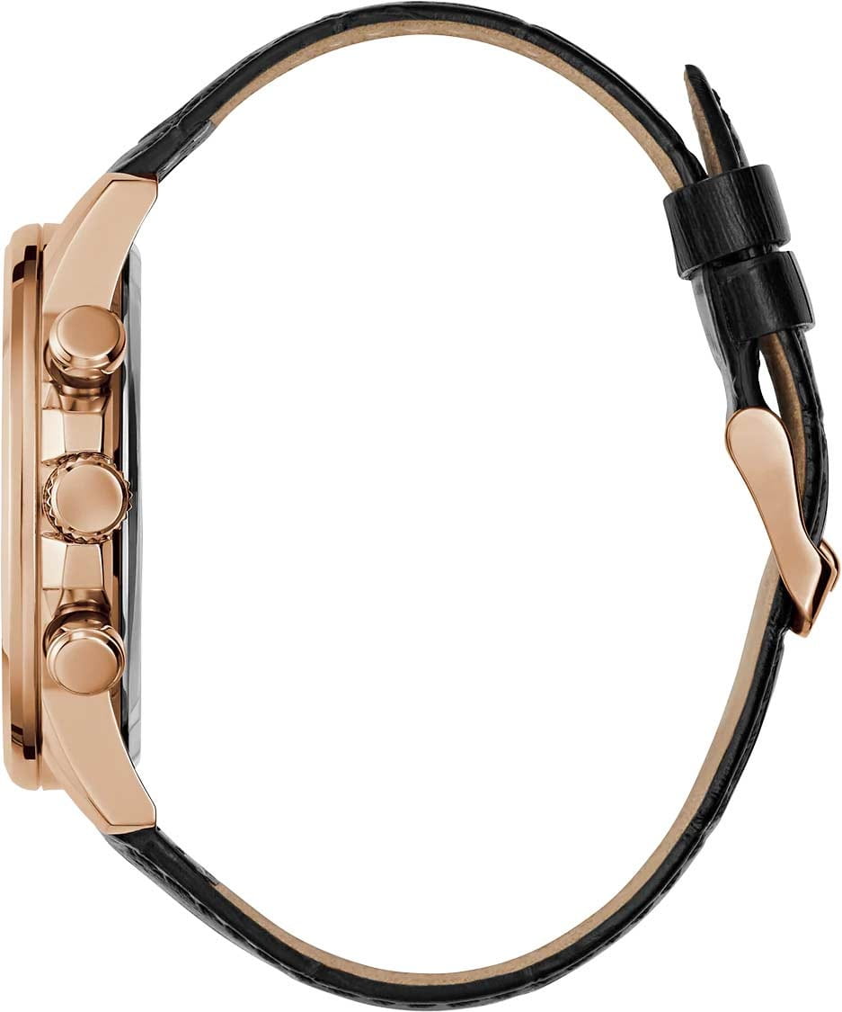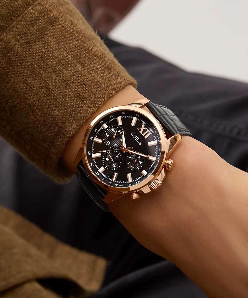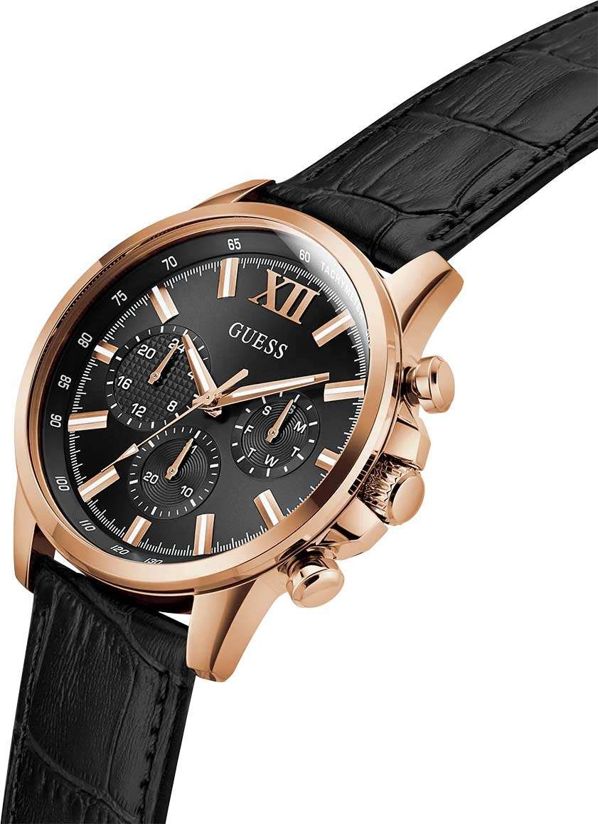 Стильные и функциональные часы Guess GW0901G5 оснащены кварцевым механизмом, что обеспечивает точность и надежность в использовании. Корпус выполнен из прочной стали с золотистым IP-покрытиемIP-покрытиеМетод ионного напыления. Демонстрирует повышенную устойчивость к истиранию, окислению и химическим веществам. Под воздействием высокого давления и температуры около 1500°C молекулы металла надёжно соединяются с частицами корпуса часов., придающей изделиям утонченный и современный вид. Черный циферблат украшен метками в виде штрихов и римской цифрой XII, обеспечивающими легкое считывание времени. Время отображается в двух форматах — 12-ти и 24-х часовом, что удобно для тех, кто привык к разным системам времени. Дополнительные циферблаты показывают дату и день недели, что позволяет всегда быть в курсе текущей даты без необходимости использования других устройств. Часы также оснащены тахиметромТахиметрРазмеченная шкала, располагается на ободке или безеле часов. Тахиметр позволяет рассчитать скорость на определённом участке пути, расстояние измеряется в километрах или милях., что добавляет им функциональности и может быть полезно для измерения скорости. Люминесцентное покрытиеЛюминесцентное покрытиеПозволяет считывать показания времени в темноте. Производители наносят на стрелки, часовые индексы, безель или поверхность циферблата светонакопительный состав, дающий холодное свечение. на стрелках и метках обеспечивает отличную видимость в темноте. Минеральное стеклоМинеральное стеклоМинеральное стекло представляет собой искусственно выращенный минерал кварца. Такое стекло отличается особой устойчивостью к повреждениям и царапинам. Уступает по некоторым качествам сапфировому стеклу. защищает циферблат от царапин и повреждений, а водозащита 50WR позволяет не волноваться о случайных контактах с водой, например, во время дождя. Кожаный черный ремешок с классической застежкой обеспечивает надежную фиксацию часов на руке и комфорт в ношении. Рифленая заводная головка с защитой добавляет изысканности и одновременно защищает механизм от повреждений. Эти часы идеально подойдут для тех, кто ценит стиль, функциональность и качество в одном аксессуаре.