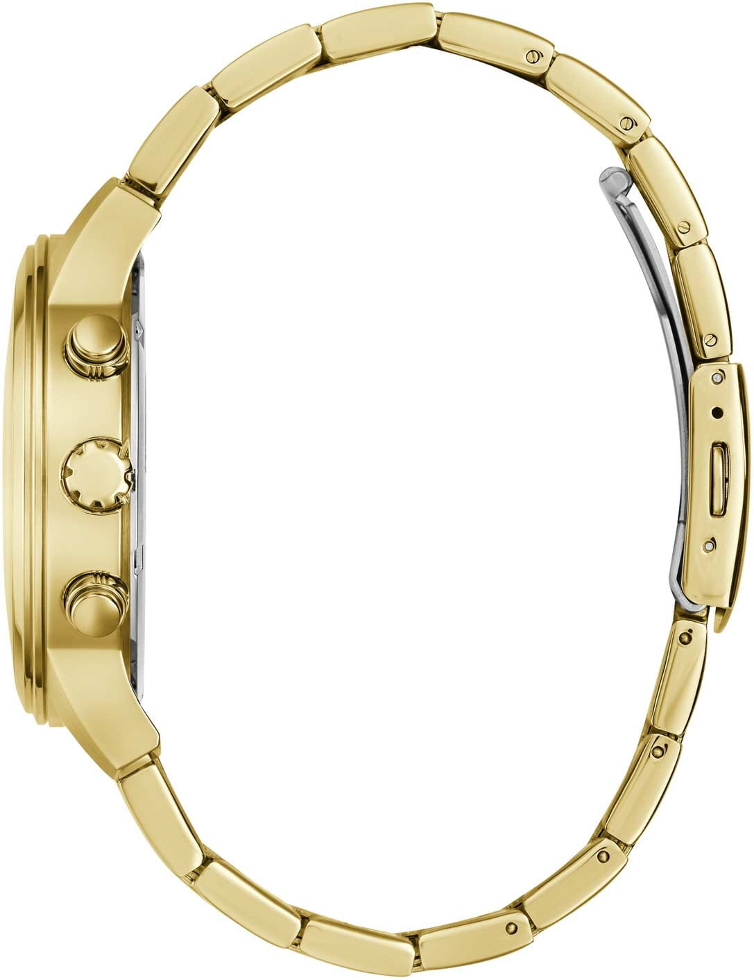 Часы Guess GW0917G2 — это стильный и функциональный аксессуар, который поможет вам всегда быть в курсе времени, независимо от обстоятельств. Эти мужские часы оснащены надежным кварцевым механизмом и имеют круглый стальной корпус с золотистым IP-покрытиемIP-покрытиеМетод ионного напыления. Демонстрирует повышенную устойчивость к истиранию, окислению и химическим веществам. Под воздействием высокого давления и температуры около 1500°C молекулы металла надёжно соединяются с частицами корпуса часов. диаметром 44 мм и толщиной 13 мм. Черный циферблат, выполненный по технологии Sunray, создает эффект солнечных лучей, добавляя глубину и элегантность дизайну. Циферблат оснащен метками в виде арабских цифр и поддерживает 12-ти и 24-х часовой формат времени, а окошко даты с днем недели, расположенное в позиции 3 часа, добавляет практичности. Отдельные циферблаты для отображения даты и дня недели делают использование часов особенно удобным. Люминесцентное покрытиеЛюминесцентное покрытиеПозволяет считывать показания времени в темноте. Производители наносят на стрелки, часовые индексы, безель или поверхность циферблата светонакопительный состав, дающий холодное свечение. на стрелках обеспечивает отличную видимость в темноте. Рифленая заводная головка обеспечивает дополнительный комфорт в эксплуатации. Стальной браслет с золотистым IP-покрытиемIP-покрытиеМетод ионного напыления. Демонстрирует повышенную устойчивость к истиранию, окислению и химическим веществам. Под воздействием высокого давления и температуры около 1500°C молекулы металла надёжно соединяются с частицами корпуса часов. и раскладной застежкойРаскладная застёжкаТакой тип застёжки используется только на браслетах из металла. Она никогда не раскрывается полностью, происходит разделение на 2 и более частей. Раскладывающая застёжка снизит вероятность потери часов к минимуму. гарантирует комфортное ношение и надежную фиксацию. Минеральное стеклоМинеральное стеклоМинеральное стекло представляет собой искусственно выращенный минерал кварца. Такое стекло отличается особой устойчивостью к повреждениям и царапинам. Уступает по некоторым качествам сапфировому стеклу. защищает циферблат от царапин и повреждений, а водозащита 50WR позволяет не беспокоиться о случайном попадании воды. Эти часы станут отличным дополнением вашего образа, подчеркивая ваш вкус и внимание к деталям.