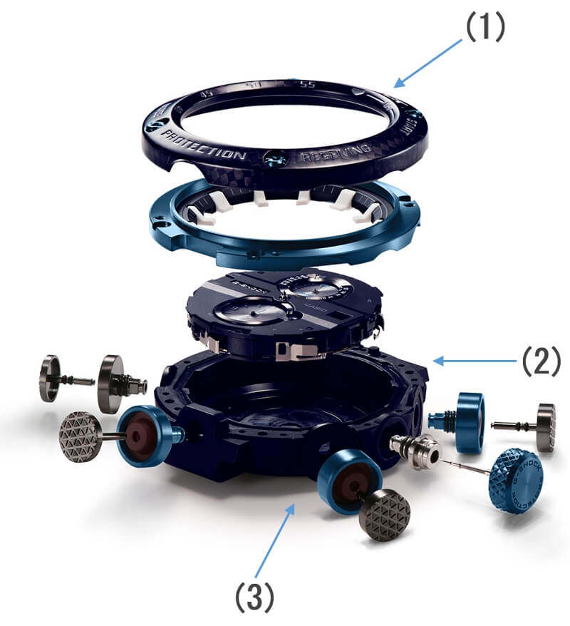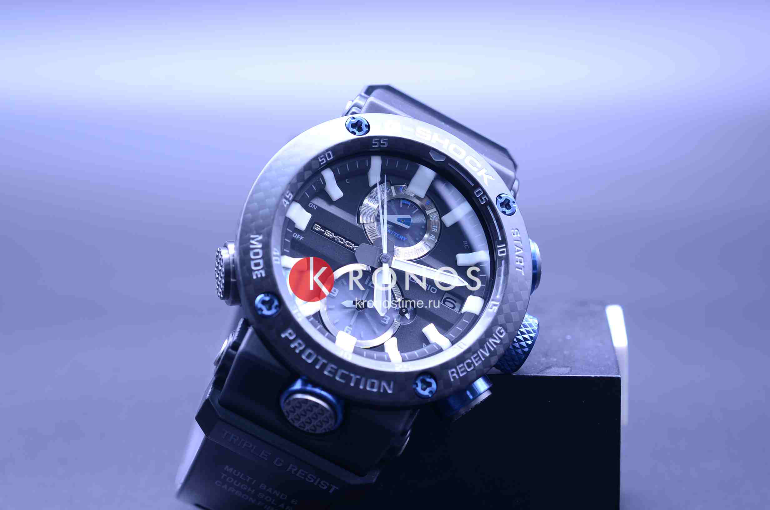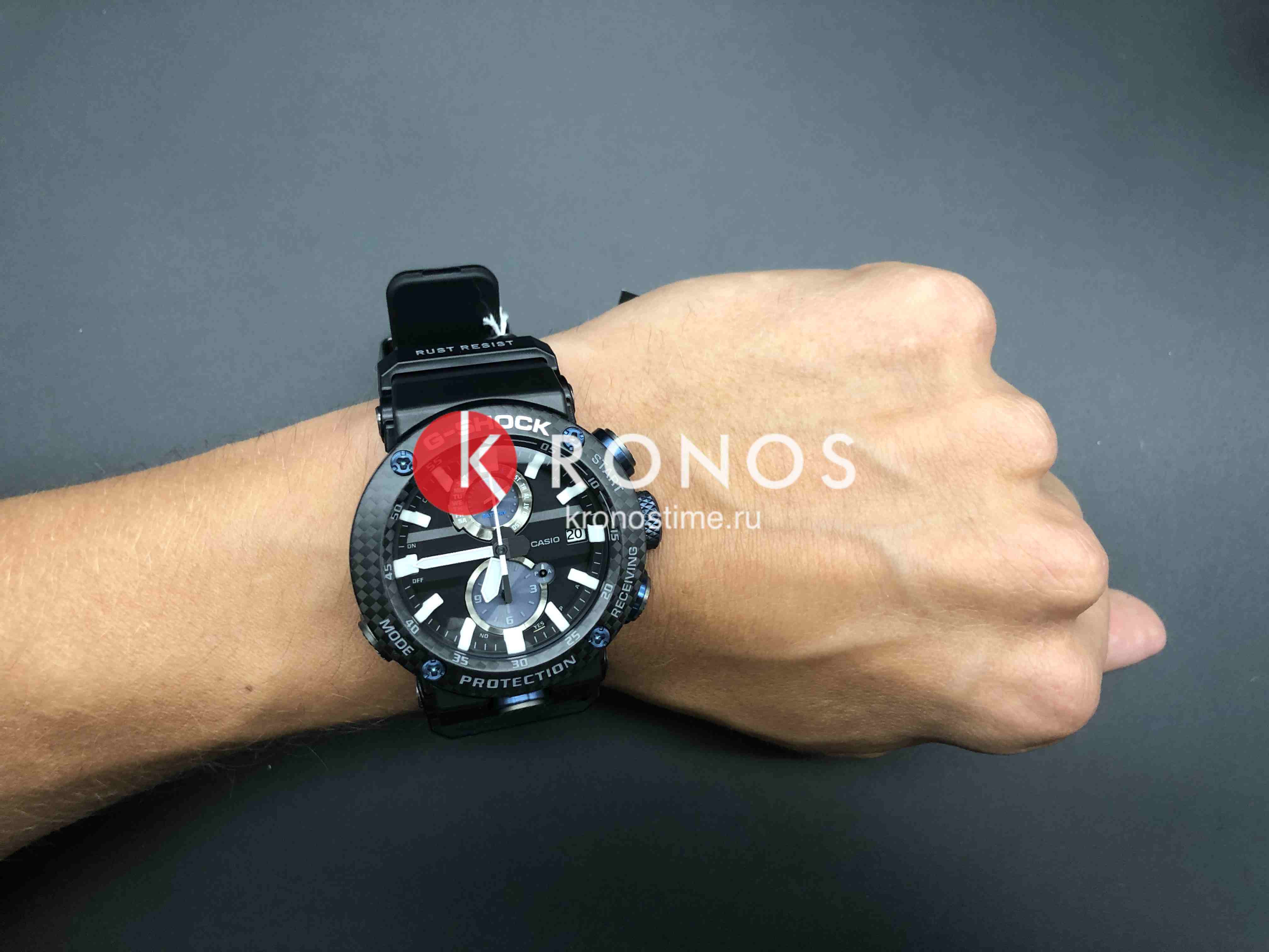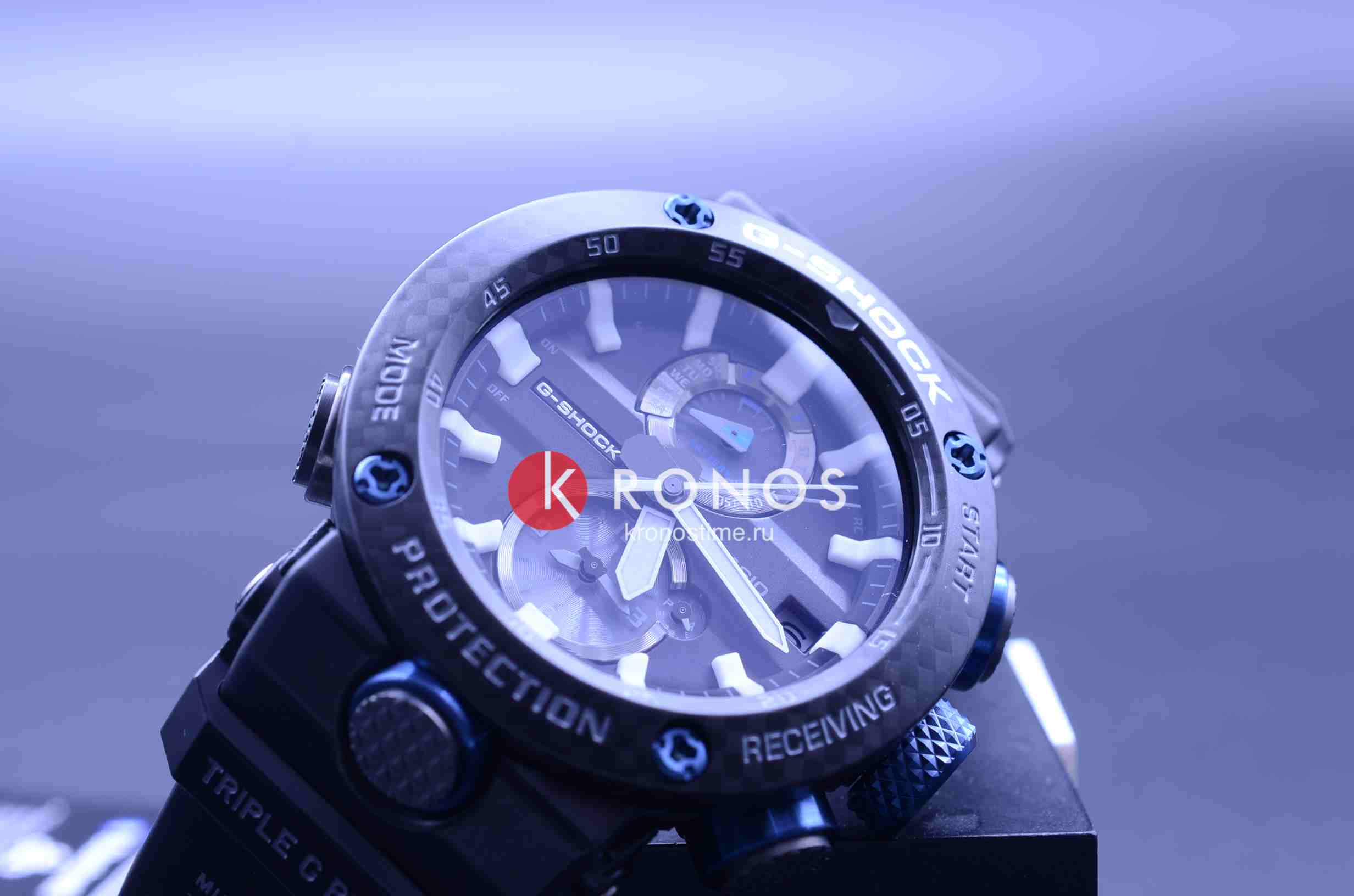 Внушительный аксессуар стильно смотрится на широком запястье, гармонично смотрятся крупные детали в голубом цвете. Задняя крышка здесь отсутствует, ударопрочный корпусУдаропрочный корпусМеханизм заключён в корпус, выполненный из современных материалов, устойчивых к ударам, механическим повреждениям и падению с высоты: инновационный пластик, карбон, нержавеющая сталь, титан. сделан из монолитного углеродного монокока, вдохновлённого конструкцией ранних самолётов. Он состоит из 52 карбоновых слоёв, уникальная текстура просматривается на боковых частях безеляБезельВнешний ободок, закрепляющий стекло. В спортивных часах так называется поворотное кольцо с делениями на циферблате, выполняет роль таймера – замеряет отрезки времени на шкале. Неподвижный безель – элемент декора. Однонаправленно вращающийся безель на дайверских часах позволяет фиксировать моменты погружения и выныривания на поверхность. – с успехом реализована технология Carbon Core GuardCarbon Core Guard Новейшая структура корпуса, разработанная Casio. Полиуретановая пластина дополнительно усилена карбоновыми вставками, что придаёт специальную защиту от механических повреждений. Карбон отличается лёгкостью и прочностью.. Полимерный ремешок тоже имеет усиление карбоновыми волокнами. Наручные часы обладают полезным функционалом: BluetoothBluetoothСовременная технология, позволяющая синхронизировать часы с телефоном и переносить данные. Часы с Bluetooth расширяют возможности вашего смартфона и делают его использование ещё более удобным., будильник, мировое времяМировое время Полезное часовое усложнение, отображающее время в основных городах и известных областях по всему миру, оно связано с часовыми поясами, удобно для путешественников и бизнесменов. , таймер, приём радиосигнала, питание от солнечной батареи . Сапфировое стекло с антибликовой обработкой. Яркая люминесцентная подсветкаЛюминесцентное покрытиеПозволяет считывать показания времени в темноте. Производители наносят на стрелки, часовые индексы, безель или поверхность циферблата светонакопительный состав, дающий холодное свечение.. Габариты: 50,1 x 46,4 x 16,9 мм.
