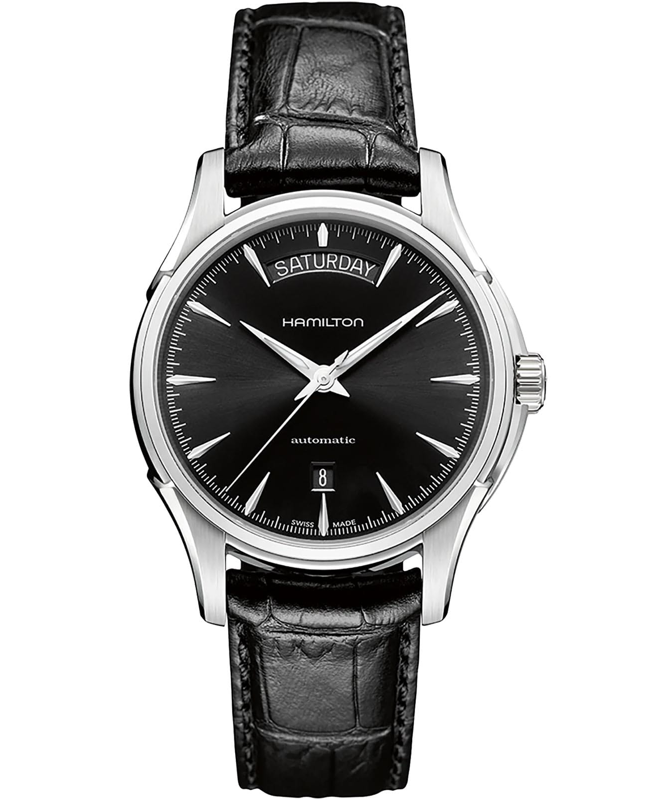 Мужские швейцарские механические часы с автоподзаводом Hamilton Jazzmaster Day Date Auto H32505731. Сапфировое стеклоСапфировое стеклоПрочный и надёжный материал из кристалла сапфира синтетического происхождения, характеризующийся особой твёрдостью и устойчивостью к царапинам и повреждениям. устойчивое к мелким механическим повреждениям. Корпус часов изготовлен из нержавеющей стали. Кожаный ремешок на стандартной застёжке. Класс водозащиты: 50 метров, позволит защитить корпус от случайных брызг или капель дождя. Стрелки и метки с люминесцентным покрытиемЛюминесцентное покрытиеПозволяет считывать показания времени в темноте. Производители наносят на стрелки, часовые индексы, безель или поверхность циферблата светонакопительный состав, дающий холодное свечение.. Окошко даты находится в положении 6 часов. Индикация дня недели в области 12 часов.
