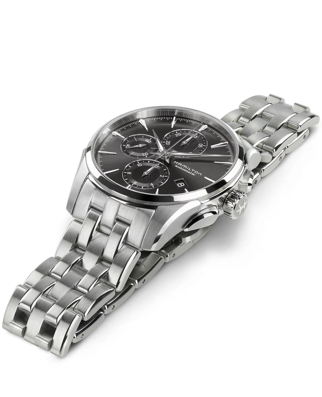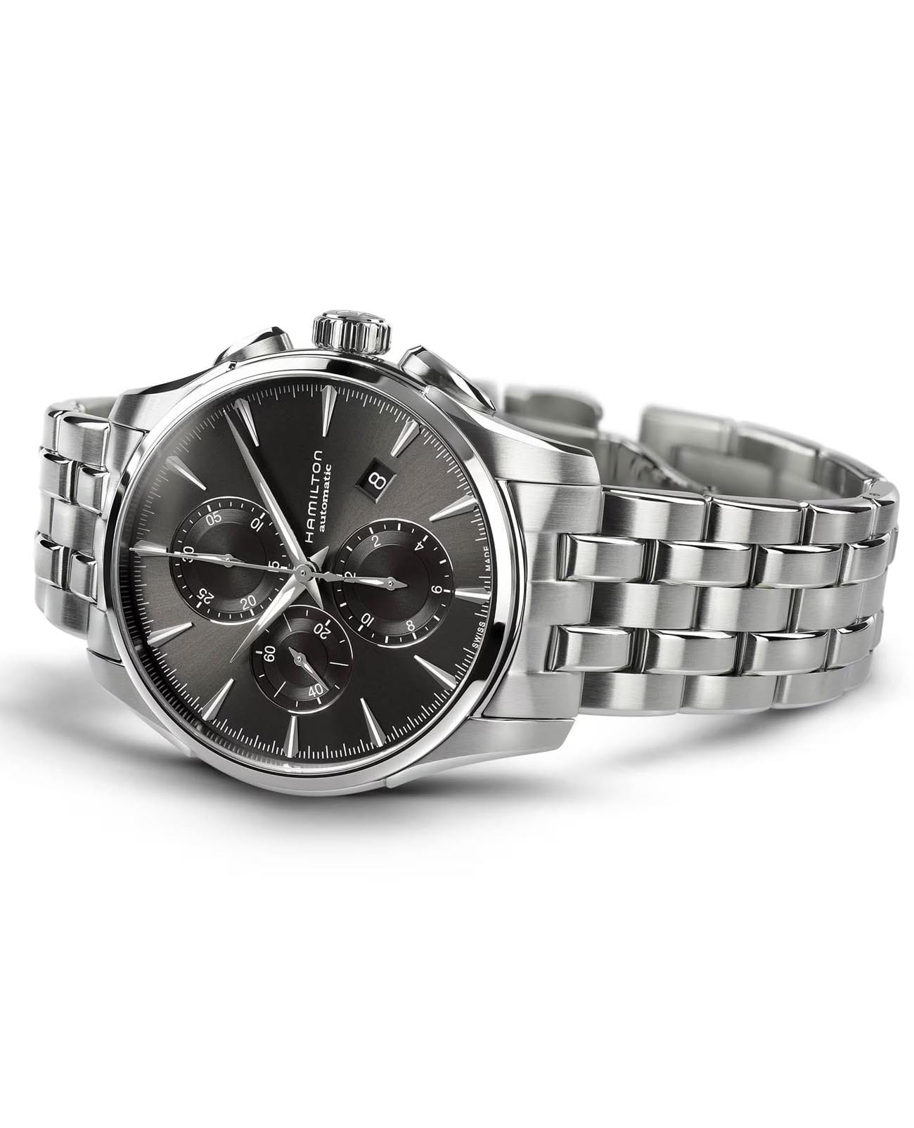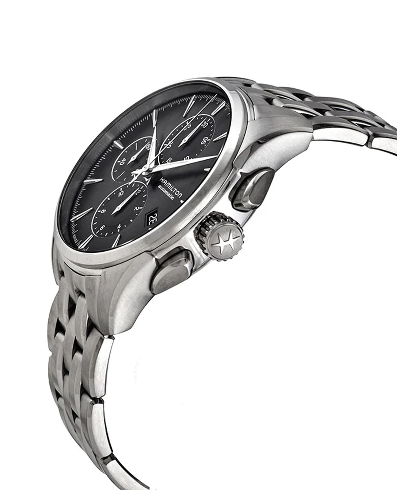 Jazzmaster Auto Chrono - это часы, которые легко приспосабливаются к ритмам современной жизни, продолжая при этом танцевать в такт собственному барабану. Для тех, кто любит традиции, но ценит инновации, модель H-21 с 60-часовым запасом хода выполнена в корпусе с плавными изгибами и чистыми линиями. Часы-хронографХронографФункция позволяет измерять отрезки времени с особой точностью: часы, минуты, секунды. Верным признаком хронографа является наличие на циферблате 3 дополнительных окошек-счётчиков. H32586181 с механическим механизмом (автоматический калибр) высокой точности. Сапфировое стеклоСапфировое стеклоПрочный и надёжный материал из кристалла сапфира синтетического происхождения, характеризующийся особой твёрдостью и устойчивостью к царапинам и повреждениям. устойчивое к появлению царапин, обладающее высокой прозрачностью. Класс водозащиты: 100 метров, позволит плавать, нырять и заниматься другими водными видами спорта. Корпус часов изготовлен из нержавеющей стали. Браслет с раскладной застёжкойРаскладная застёжкаТакой тип застёжки используется только на браслетах из металла. Она никогда не раскрывается полностью, происходит разделение на 2 и более частей. Раскладывающая застёжка снизит вероятность потери часов к минимуму.. Окошко даты находится в положении 4 часа.