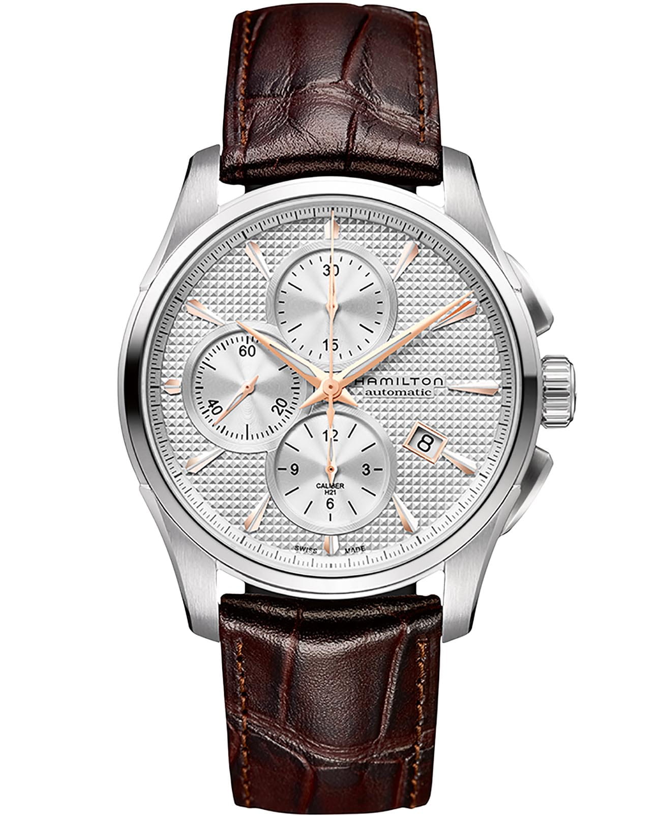 Часы-хронографХронографФункция позволяет измерять отрезки времени с особой точностью: часы, минуты, секунды. Верным признаком хронографа является наличие на циферблате 3 дополнительных окошек-счётчиков. Hamilton Jazzmaster Auto Chrono H32596551 с автоматическим механизмом высокой точности. Сапфировое стеклоСапфировое стеклоПрочный и надёжный материал из кристалла сапфира синтетического происхождения, характеризующийся особой твёрдостью и устойчивостью к царапинам и повреждениям. устойчивое к появлению царапин, обладающее высокой прозрачностью. Класс водозащиты: 100 метров, позволит плавать, нырять и заниматься другими водными видами спорта. Корпус часов изготовлен из нержавеющей стали. Кожаный ремешок на стандартной застёжке. Стрелки и метки с люминесцентным покрытиемЛюминесцентное покрытиеПозволяет считывать показания времени в темноте. Производители наносят на стрелки, часовые индексы, безель или поверхность циферблата светонакопительный состав, дающий холодное свечение.. Окошко даты находится в положении 4 часа.