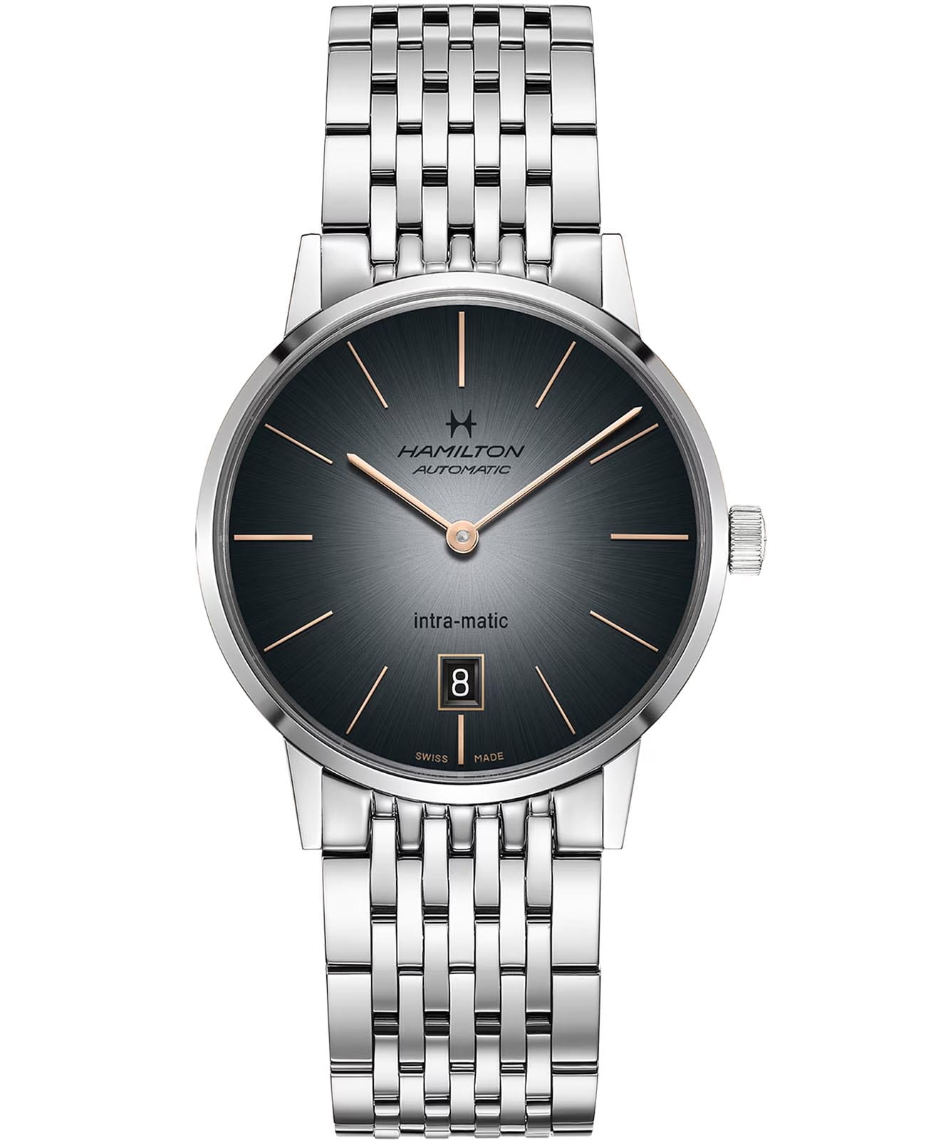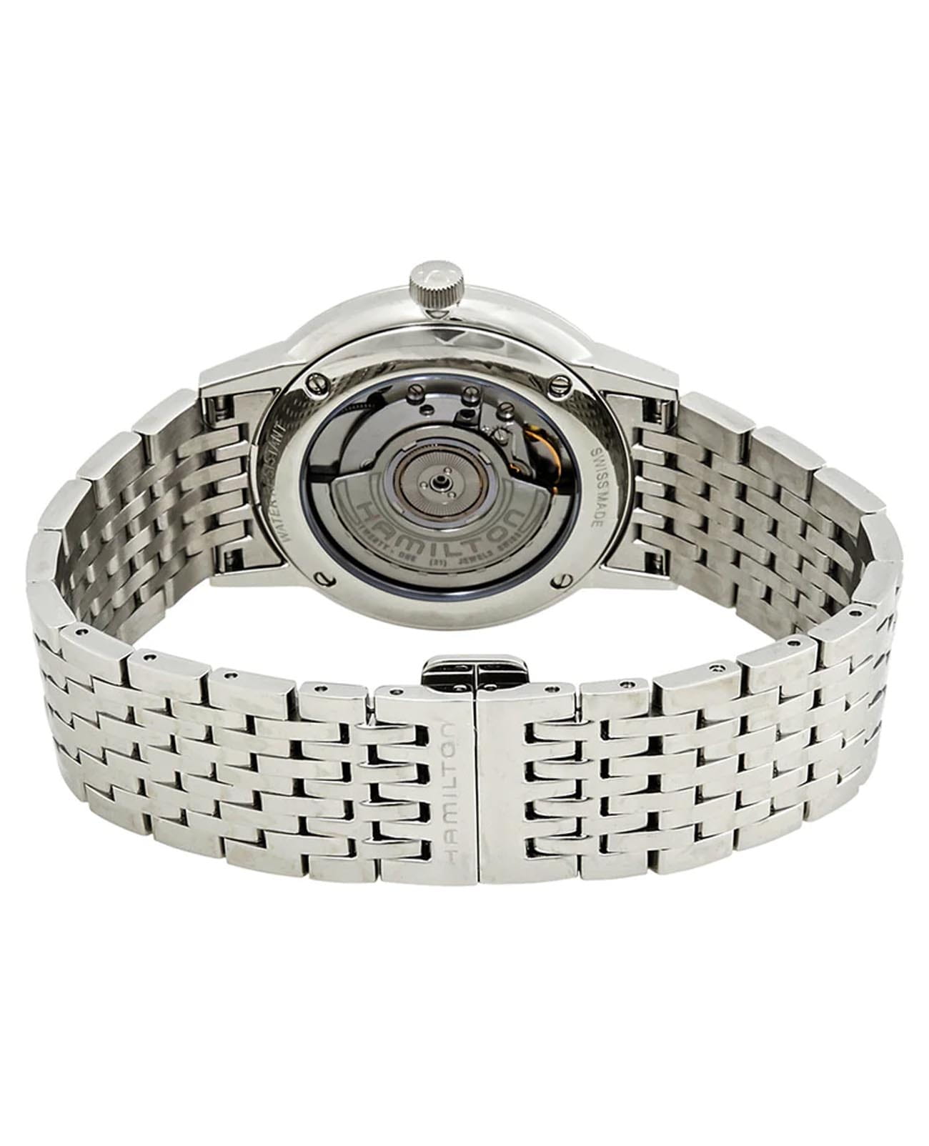 Мужские наручные часы Hamilton American Classic Intra-Matic Auto H38455181 с надёжным автоматическим механизмом. Корпус часов изготовлен из нержавеющей стали. Стальной браслет на застёжке-бабочке с кнопкамиЗастёжка "бабочка"Такой вид застёжки дополняется предохранителями, помогающими избежать случайного раскрытия браслета. Обладают изящным исполнением. . Сапфировое стеклоСапфировое стеклоПрочный и надёжный материал из кристалла сапфира синтетического происхождения, характеризующийся особой твёрдостью и устойчивостью к царапинам и повреждениям. с антибликовым покрытием. Окошко даты находится в положении 6 часов. Класс водозащиты: 50 метров, позволит защитить корпус от случайных брызг или капель дождя.
