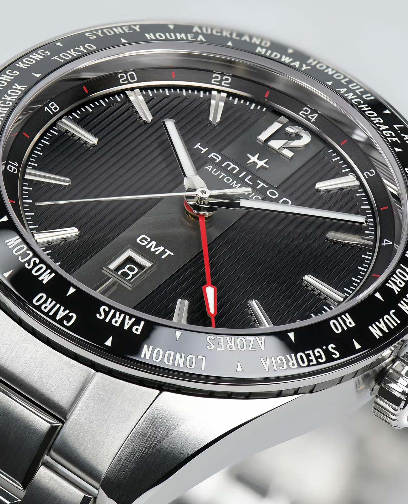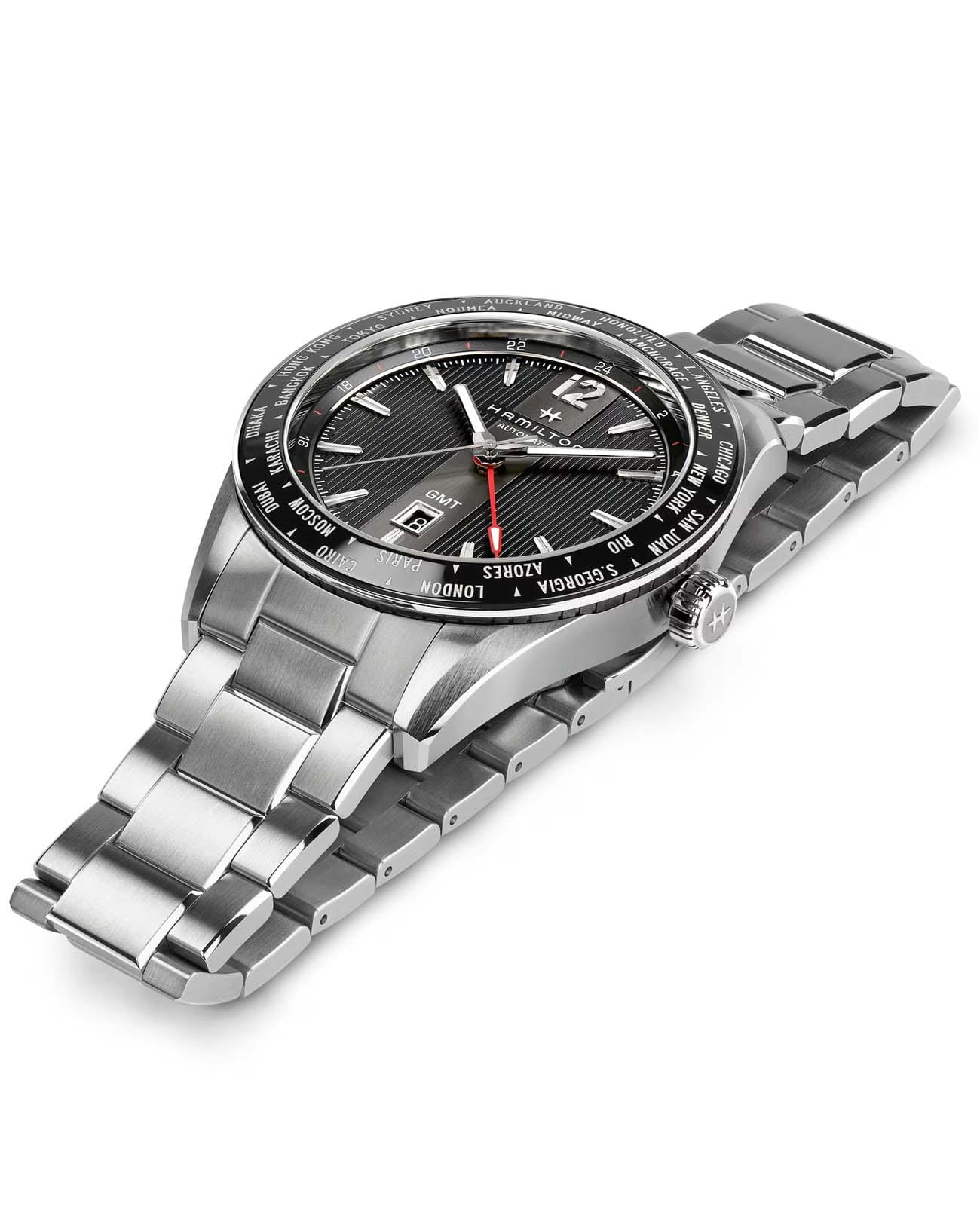Мужские механические швейцарские часы Hamilton Broadway GMTGMTОтображение времени второго часового пояса.Такая функция особенно актуальна для путешественников и бизнесменов,которые общаются с людьми из разных стран,теперь вы всегда будете знать,какой час у вашего партнёра или близкого человека. Limited Edition H43725131. Сапфировое стеклоСапфировое стеклоПрочный и надёжный материал из кристалла сапфира синтетического происхождения, характеризующийся особой твёрдостью и устойчивостью к царапинам и повреждениям. устойчивое к появлению царапин, обладающее высокой прозрачностью. Класс водозащиты: 50 метров, позволит защитить корпус от случайных брызг или капель дождя. Корпус часов изготовлен из стали. Стрелки и метки с люминесцентным покрытиемЛюминесцентное покрытиеПозволяет считывать показания времени в темноте. Производители наносят на стрелки, часовые индексы, безель или поверхность циферблата светонакопительный состав, дающий холодное свечение.. Стальной браслет на раскладной застёжкеРаскладная застёжкаТакой тип застёжки используется только на браслетах из металла. Она никогда не раскрывается полностью, происходит разделение на 2 и более частей. Раскладывающая застёжка снизит вероятность потери часов к минимуму.. Окошко даты находится в положении 6 часов. БезельБезельВнешний ободок, закрепляющий стекло. В спортивных часах так называется поворотное кольцо с делениями на циферблате, выполняет роль таймера – замеряет отрезки времени на шкале. Неподвижный безель – элемент декора. Однонаправленно вращающийся безель на дайверских часах позволяет фиксировать моменты погружения и выныривания на поверхность. с PVD-покрытиемPVDУльтратонкое покрытие наносится в технике вакуумного напыления, сочетает в себе нитрид титана особой прочности со слоем золота или оксида хрома. Несёт в себе декоративную или защитную функцию..
