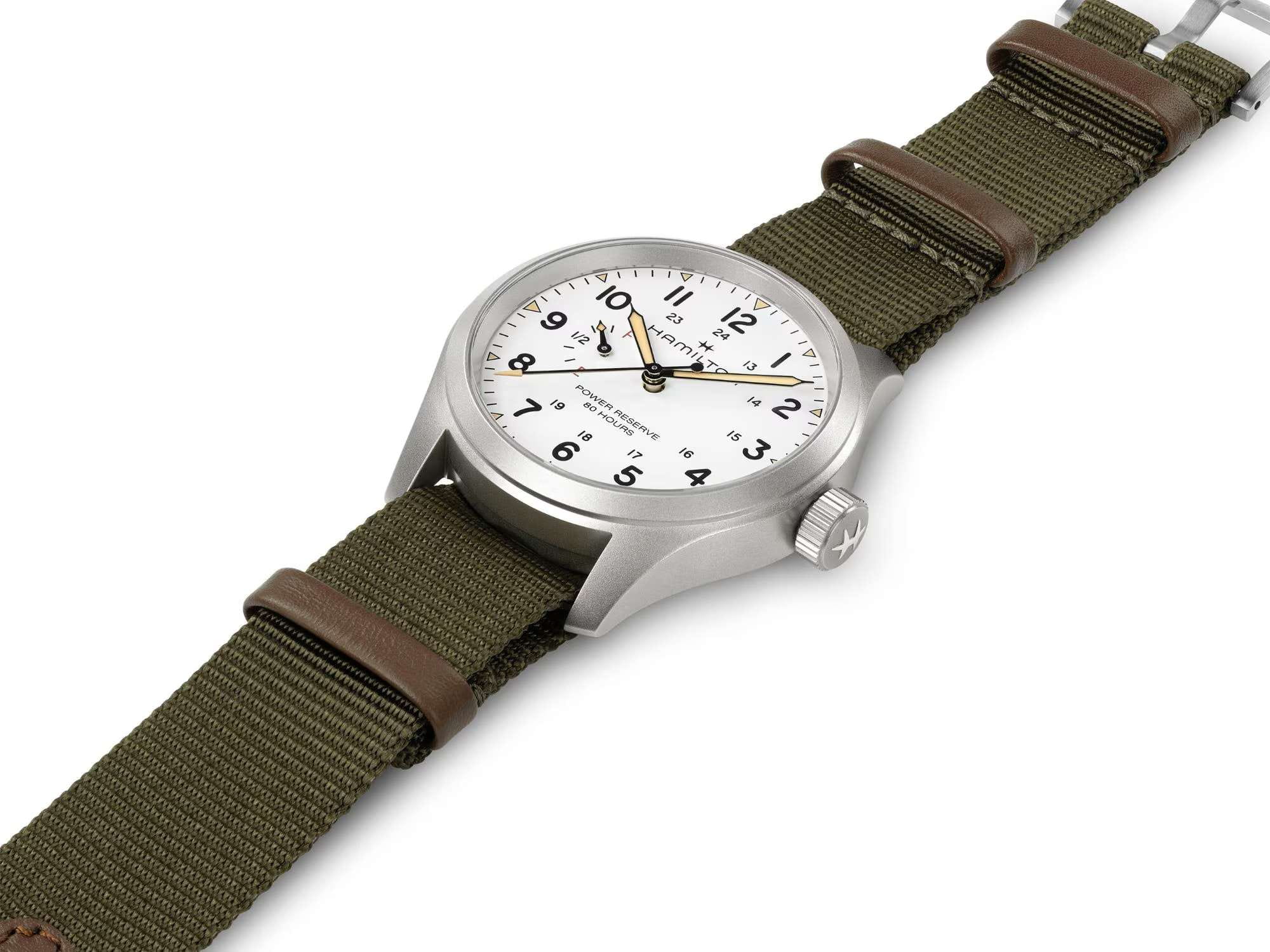 Мужские наручные часы Hamilton Khaki Field Mechanical Power Reserve 40mm H69509910 сочетают в себе спортивный стиль и элегантный дизайн. Модель обладает круглым корпусом диаметром 40 мм, изготовленным из нержавеющей стали, что обеспечивает высокую устойчивость к внешним воздействиям. Изысканный ремешок выполнен из ткани со стандартной застежкой, гарантирующей комфортное ношение и безопасность. Лаконичный циферблат оснащен крупными цифрами и стрелками с люминесцентным покрытиемЛюминесцентное покрытиеПозволяет считывать показания времени в темноте. Производители наносят на стрелки, часовые индексы, безель или поверхность циферблата светонакопительный состав, дающий холодное свечение. Super-LumiNova®, обеспечивающим превосходную видимость в темноте. Для защиты используется сапфировое стеклоСапфировое стеклоПрочный и надёжный материал из кристалла сапфира синтетического происхождения, характеризующийся особой твёрдостью и устойчивостью к царапинам и повреждениям., которое эффективно противостоит царапинам и имеет антибликовое покрытиеАнтибликовое покрытиеСлой оксида металла в 0,13-0,3 микрон, благодаря которому стекло часов не бликует и не отражает свет. Антибликовое покрытие уменьшает отражение света в 10 раз, обеспечивая отличную читаемость показателей циферблата.. Часы работают с помощью механизма H-23.  Механизм с пружиной баланса Nivachron™Nivachron™Специально разработанный инновационный сплав Nivachron™ повышает устойчивость часов к воздействию магнитных полей. гарантирует точность хода, устойчивость к магнитным полям. На циферблате также буквы «F» для обозначения полного заряда и «E» для обозначения пустого заряда, что подчеркивает эту исключительную и практичную функцию. Водонепроницаемость часов достигает 10 атмосфер (100 метров), делающая их подходящими для повседневного использования и активного отдыха. Это сочетание высокой прочности, точности и изысканного дизайна для уверенных в себе мужчин.