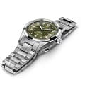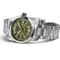 Hamilton Khaki Field Auto H70455160 — надёжные полевые часы с военным характером и швейцарской точностью, созданные для активного образа жизни. Корпус диаметром 38 мм выполнен из нержавеющей стали с сатинированной отделкой. Прозрачная задняя крышка позволяет наблюдать за работой механизма. Циферблат защищён выпуклым сапфировым стекломСапфировое стеклоПрочный и надёжный материал из кристалла сапфира синтетического происхождения, характеризующийся особой твёрдостью и устойчивостью к царапинам и повреждениям. с антибликовым покрытиемАнтибликовое покрытиеСлой оксида металла в 0,13-0,3 микрон, благодаря которому стекло часов не бликует и не отражает свет. Антибликовое покрытие уменьшает отражение света в 10 раз, обеспечивая отличную читаемость показателей циферблата.. Зелёный циферблат оформлен в классическом военном стиле: крупные арабские цифры, 24-часовая шкала по внутреннему кольцу и дата на позиции «3 часа». Стрелки и метки покрыты люминесцентным покрытиемЛюминесцентное покрытиеПозволяет считывать показания времени в темноте. Производители наносят на стрелки, часовые индексы, безель или поверхность циферблата светонакопительный состав, дающий холодное свечение., обеспечивая читаемость в любых условиях. Внутри установлен автоматический механизм H-10 с увеличенным запасом хода до 80 часов. Модель комплектуется браслетом из нержавеющей стали с раскладной застёжкойРаскладная застёжкаТакой тип застёжки используется только на браслетах из металла. Она никогда не раскрывается полностью, происходит разделение на 2 и более частей. Раскладывающая застёжка снизит вероятность потери часов к минимуму., обеспечивающей удобную и надёжную посадку. Водонепроницаемость 100 метров делает эту модель отличным выбором как для города, так и для активного отдыха. Hamilton Khaki Field Auto — идеальный баланс практичности, стиля и швейцарского качества.