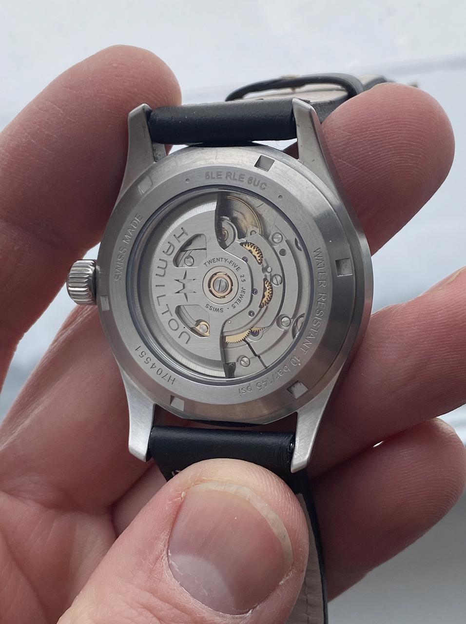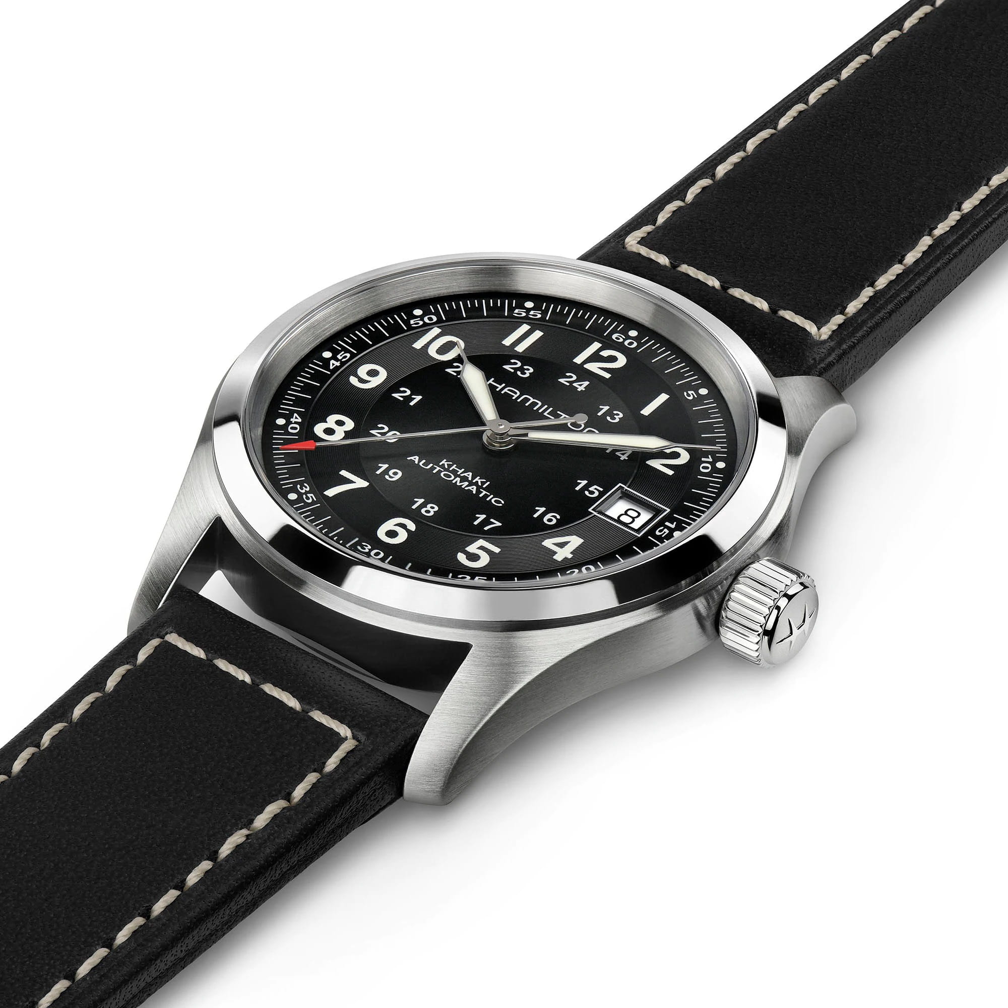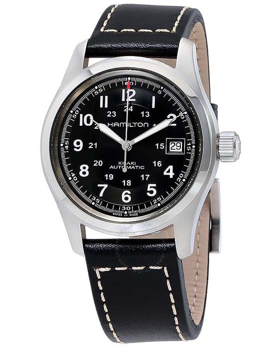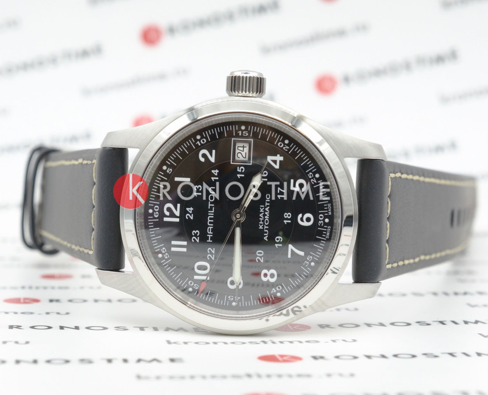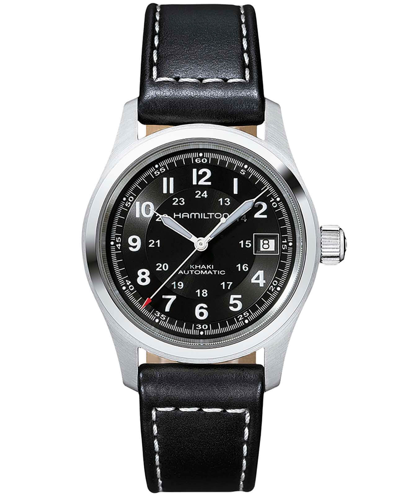 Мужские механические швейцарские часы Hamilton Khaki Field Auto H70455733, автоматический механизм с высокой точностью. Сапфировое стеклоСапфировое стеклоПрочный и надёжный материал из кристалла сапфира синтетического происхождения, характеризующийся особой твёрдостью и устойчивостью к царапинам и повреждениям. устойчивое к появлению царапин, обладающее высокой прозрачностью. Класс водозащиты: 100 метров, позволит плавать, нырять и заниматься другими водными видами спорта. Корпус часов изготовлен из стали. Стрелки с люминесцентным покрытиемЛюминесцентное покрытиеПозволяет считывать показания времени в темноте. Производители наносят на стрелки, часовые индексы, безель или поверхность циферблата светонакопительный состав, дающий холодное свечение.. Кожаный ремешок.