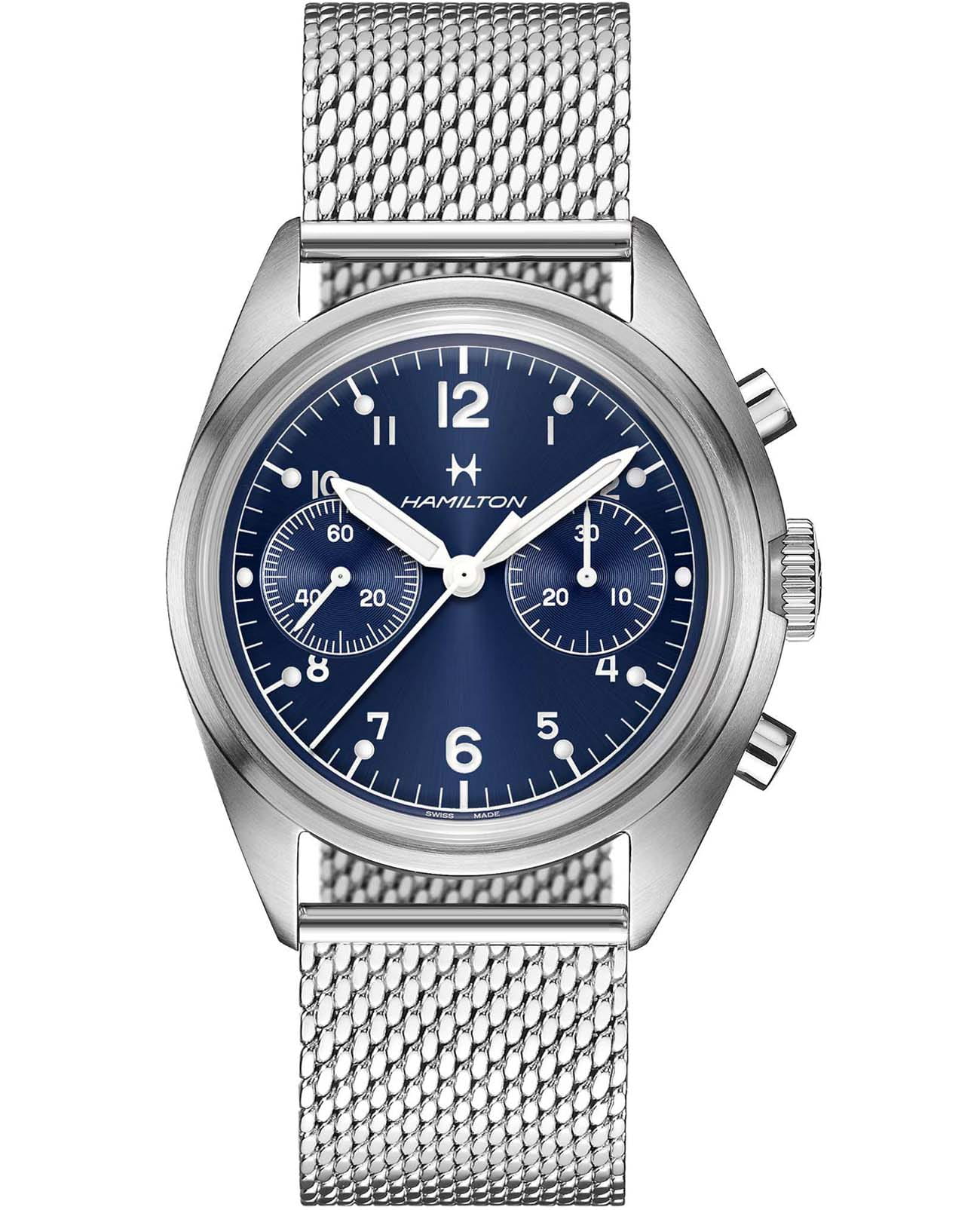 Мужские стильные швейцарские часы Hamilton Khaki Aviation Pilot Pioneer Mechanical Chronograph 40mm H76409140. Стальной корпус диаметром 40 мм и увеличенной толщиной 14,35 мм подчеркивает брутальность модели, а сапфировое стеклоСапфировое стеклоПрочный и надёжный материал из кристалла сапфира синтетического происхождения, характеризующийся особой твёрдостью и устойчивостью к царапинам и повреждениям. с антибликовым покрытиемАнтибликовое покрытиеСлой оксида металла в 0,13-0,3 микрон, благодаря которому стекло часов не бликует и не отражает свет. Антибликовое покрытие уменьшает отражение света в 10 раз, обеспечивая отличную читаемость показателей циферблата. обеспечивает превосходную читаемость матового синего циферблата со стрелками с люминесцентным покрытиемЛюминесцентное покрытиеПозволяет считывать показания времени в темноте. Производители наносят на стрелки, часовые индексы, безель или поверхность циферблата светонакопительный состав, дающий холодное свечение. Super-LumiNova®. Модель оснащена функцией хронографаХронографФункция позволяет измерять отрезки времени с особой точностью: часы, минуты, секунды. Верным признаком хронографа является наличие на циферблате 3 дополнительных окошек-счётчиков.. Механизм с ручным заводом H-51 оснащен кремниевой спиралью, обеспечивающей запас хода 60 часов и устойчивость к магнитным полям.  Модель укомплектована браслетом миланского плетения из нержавеющей стали с раскладным замкомРаскладной замокДанный вариант застежки используется только на часах с металлическим браслетом. Отличительная особенность такого крепления в том, что длина браслета становится универсальной и вы можете самостоятельно отрегулировать нужный вам размер – застежка просто двигается по браслету часов., обеспечивающий надёжную посадку. Водонепроницаемость часов достигает 10 атмосфер (100 метров), делающая их подходящими для повседневного использования и активного отдыха. Это сочетание высокой прочности, точности и изысканного дизайна для уверенных в себе мужчин.
