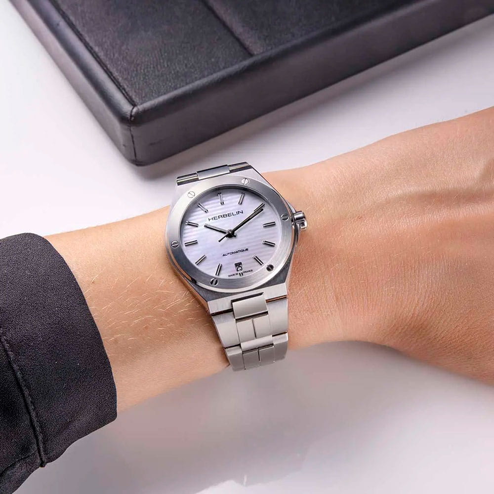 Женские механические часы с автоподзаводом Herbelin Cap Camarat 1545B19 – отражающий идеальное сочетание современного дизайна, надёжности и функциональности. Элегантный облик станет превосходным завершением образа, наделив его индивидуальным характером. Корпус из нержавеющей стали серебристого цвета, диаметром 37 мм, идеально сбалансирован и элегантен. Сапфировое стеклоСапфировое стеклоПрочный и надёжный материал из кристалла сапфира синтетического происхождения, характеризующийся особой твёрдостью и устойчивостью к царапинам и повреждениям. защищает циферблат от царапин и устойчивое к механическим повреждениям. БезельБезельВнешний ободок, закрепляющий стекло. В спортивных часах так называется поворотное кольцо с делениями на циферблате, выполняет роль таймера – замеряет отрезки времени на шкале. Неподвижный безель – элемент декора. Однонаправленно вращающийся безель на дайверских часах позволяет фиксировать моменты погружения и выныривания на поверхность. украшен винтами, заводная головка с защитой. Окошко даты находится в положении 6 часов. Стрелки и метки с люминесцентным покрытиемЛюминесцентное покрытиеПозволяет считывать показания времени в темноте. Производители наносят на стрелки, часовые индексы, безель или поверхность циферблата светонакопительный состав, дающий холодное свечение.. Стальной браслет на застёжке-бабочке с кнопкамиЗастёжка "бабочка"Такой вид застёжки дополняется предохранителями, помогающими избежать случайного раскрытия браслета. Обладают изящным исполнением. обеспечивает комфортное ношение. Водозащита 100 метров позволит плавать, нырять и заниматься другими водными видами спорта. Эта модель – отличный выбор для тех, кто ищет сочетание стиля, качества и функциональности. Часы станут не только полезным аксессуаром, но и выразительным элементом вашего имиджа.
