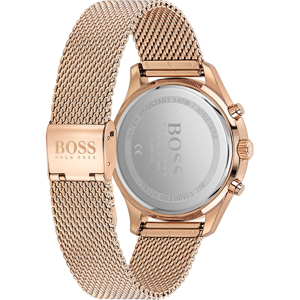 Мужские часы Hugo Boss Associate HB1513806 представлены в круглом 42-мм корпусе из нержавеющей стали 316L с золотистым PVD-покрытиемPVDУльтратонкое покрытие наносится в технике вакуумного напыления, сочетает в себе нитрид титана особой прочности со слоем золота или оксида хрома. Несёт в себе декоративную или защитную функцию.. Оснащены кварцевым механизмом с функциями хронографаХронографФункция позволяет измерять отрезки времени с особой точностью: часы, минуты, секунды. Верным признаком хронографа является наличие на циферблате 3 дополнительных окошек-счётчиков., секундомеромСекундомерСекундоме́р — прибор, способный измерять интервалы времени с точностью до долей секунды. и индикацией даты на позиции 4 часа. Циферблат с подсветкой стрелок защищен устойчивым к царапинам минеральным стекломМинеральное стеклоМинеральное стекло представляет собой искусственно выращенный минерал кварца. Такое стекло отличается особой устойчивостью к повреждениям и царапинам. Уступает по некоторым качествам сапфировому стеклу.. Стальной браслет дополнен раскладной застёжкойРаскладная застёжкаТакой тип застёжки используется только на браслетах из металла. Она никогда не раскрывается полностью, происходит разделение на 2 и более частей. Раскладывающая застёжка снизит вероятность потери часов к минимуму. с фиксатором для надежной посадки. Водонепроницаемость 50 метров (5 ATM) обеспечивает защиту от брызг и дождя.
