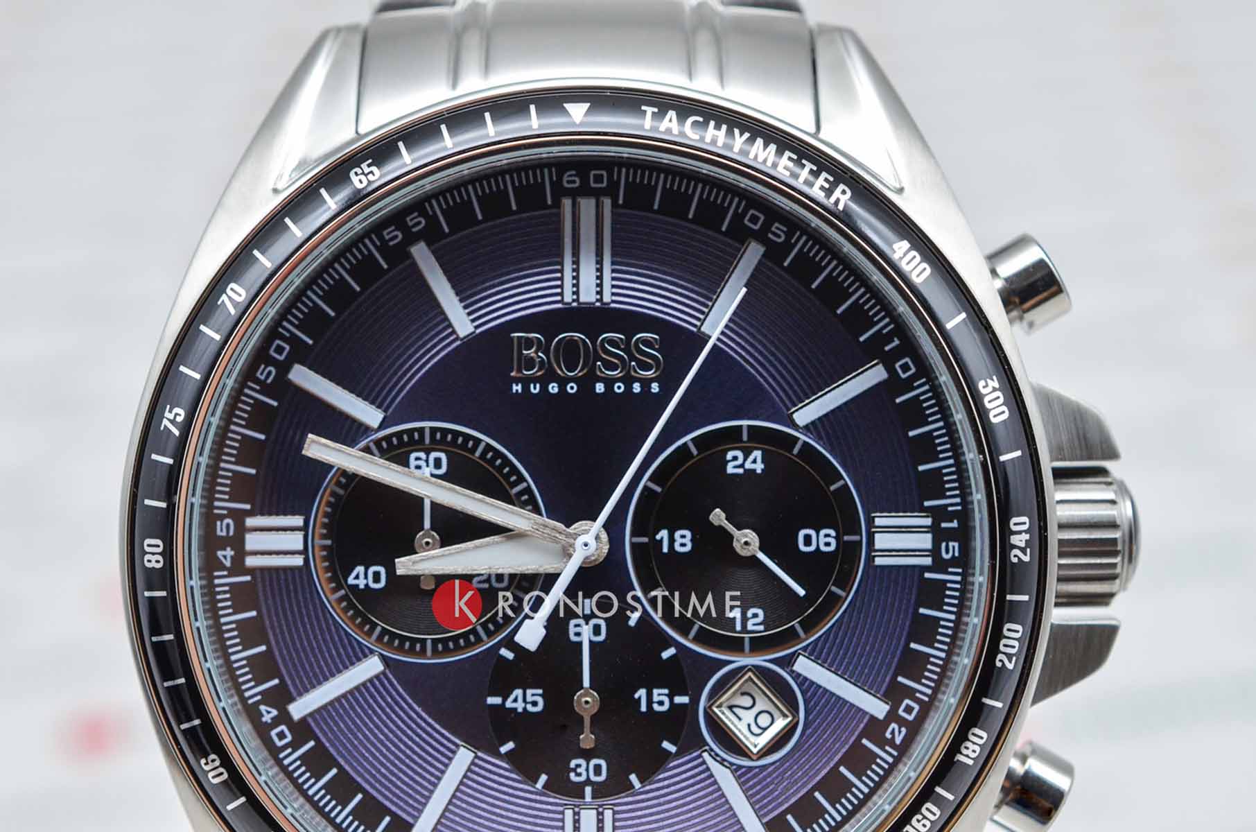 Мужские кварцевые часы Hugo Boss HB1513081 представляют собой стильный хронографХронографФункция позволяет измерять отрезки времени с особой точностью: часы, минуты, секунды. Верным признаком хронографа является наличие на циферблате 3 дополнительных окошек-счётчиков. с корпусом диаметром 45 мм из нержавеющей стали, дополненным синим циферблатом с серебристыми стрелками и индексами для оптимальной читаемости. Модель оснащена высокоточным кварцевым механизмом с функцией хронографаХронографФункция позволяет измерять отрезки времени с особой точностью: часы, минуты, секунды. Верным признаком хронографа является наличие на циферблате 3 дополнительных окошек-счётчиков., включая 60-минутный счетчик и 24-часовой индикатор, а также тахиметрической шкалой на неподвижном безелеБезельВнешний ободок, закрепляющий стекло. В спортивных часах так называется поворотное кольцо с делениями на циферблате, выполняет роль таймера – замеряет отрезки времени на шкале. Неподвижный безель – элемент декора. Однонаправленно вращающийся безель на дайверских часах позволяет фиксировать моменты погружения и выныривания на поверхность. с IP-покрытиемIP-покрытиеМетод ионного напыления. Демонстрирует повышенную устойчивость к истиранию, окислению и химическим веществам. Под воздействием высокого давления и температуры около 1500°C молекулы металла надёжно соединяются с частицами корпуса часов. для расчетов скорости. Циферблат защищен устойчивым к царапинам минеральным стекломМинеральное стеклоМинеральное стекло представляет собой искусственно выращенный минерал кварца. Такое стекло отличается особой устойчивостью к повреждениям и царапинам. Уступает по некоторым качествам сапфировому стеклу., а водонепроницаемость 5 ATM (50 метров) обеспечивает защиту от брызг и дождя, делая часы практичными для повседневного использования. Стальной браслет с застёжкой «бабочка»Застёжка "бабочка"Такой вид застёжки дополняется предохранителями, помогающими избежать случайного раскрытия браслета. Обладают изящным исполнением. обеспечивает надежную и комфортную посадку на запястье, подчеркивая спортивно-элегантный стиль модели. Люминесцентное покрытиеЛюминесцентное покрытиеПозволяет считывать показания времени в темноте. Производители наносят на стрелки, часовые индексы, безель или поверхность циферблата светонакопительный состав, дающий холодное свечение. на стрелках обеспечивает отличную видимость в темноте.