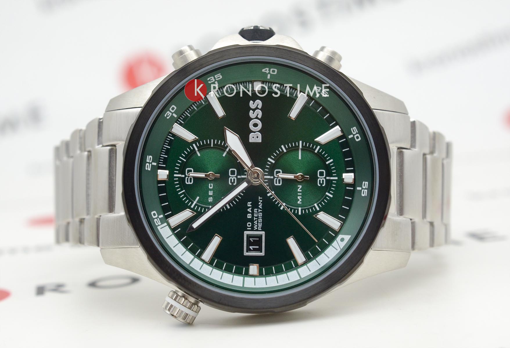 Мужские часы Hugo Boss Globetrotter HB 1513930 представлены в круглом 46-мм корпусе из нержавеющей стали с IP-покрытиемIP-покрытиеМетод ионного напыления. Демонстрирует повышенную устойчивость к истиранию, окислению и химическим веществам. Под воздействием высокого давления и температуры около 1500°C молекулы металла надёжно соединяются с частицами корпуса часов.. Оснащены кварцевым механизмом с функциями хронографаХронографФункция позволяет измерять отрезки времени с особой точностью: часы, минуты, секунды. Верным признаком хронографа является наличие на циферблате 3 дополнительных окошек-счётчиков. и секундомеромСекундомерСекундоме́р — прибор, способный измерять интервалы времени с точностью до долей секунды.. Зеленый циферблат защищен устойчивым к царапинам минеральным стекломМинеральное стеклоМинеральное стекло представляет собой искусственно выращенный минерал кварца. Такое стекло отличается особой устойчивостью к повреждениям и царапинам. Уступает по некоторым качествам сапфировому стеклу.. Стальной браслет серебристого цвета дополнен раскладной застёжкойРаскладная застёжкаТакой тип застёжки используется только на браслетах из металла. Она никогда не раскрывается полностью, происходит разделение на 2 и более частей. Раскладывающая застёжка снизит вероятность потери часов к минимуму., а стрелки покрыты люминесцентным составомЛюминесцентное покрытиеПозволяет считывать показания времени в темноте. Производители наносят на стрелки, часовые индексы, безель или поверхность циферблата светонакопительный состав, дающий холодное свечение. для видимости в темноте. Водонепроницаемость 100 метров (10 ATM) позволяет использовать часы для плавания.
