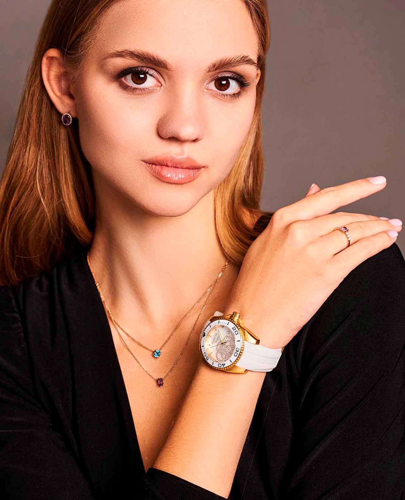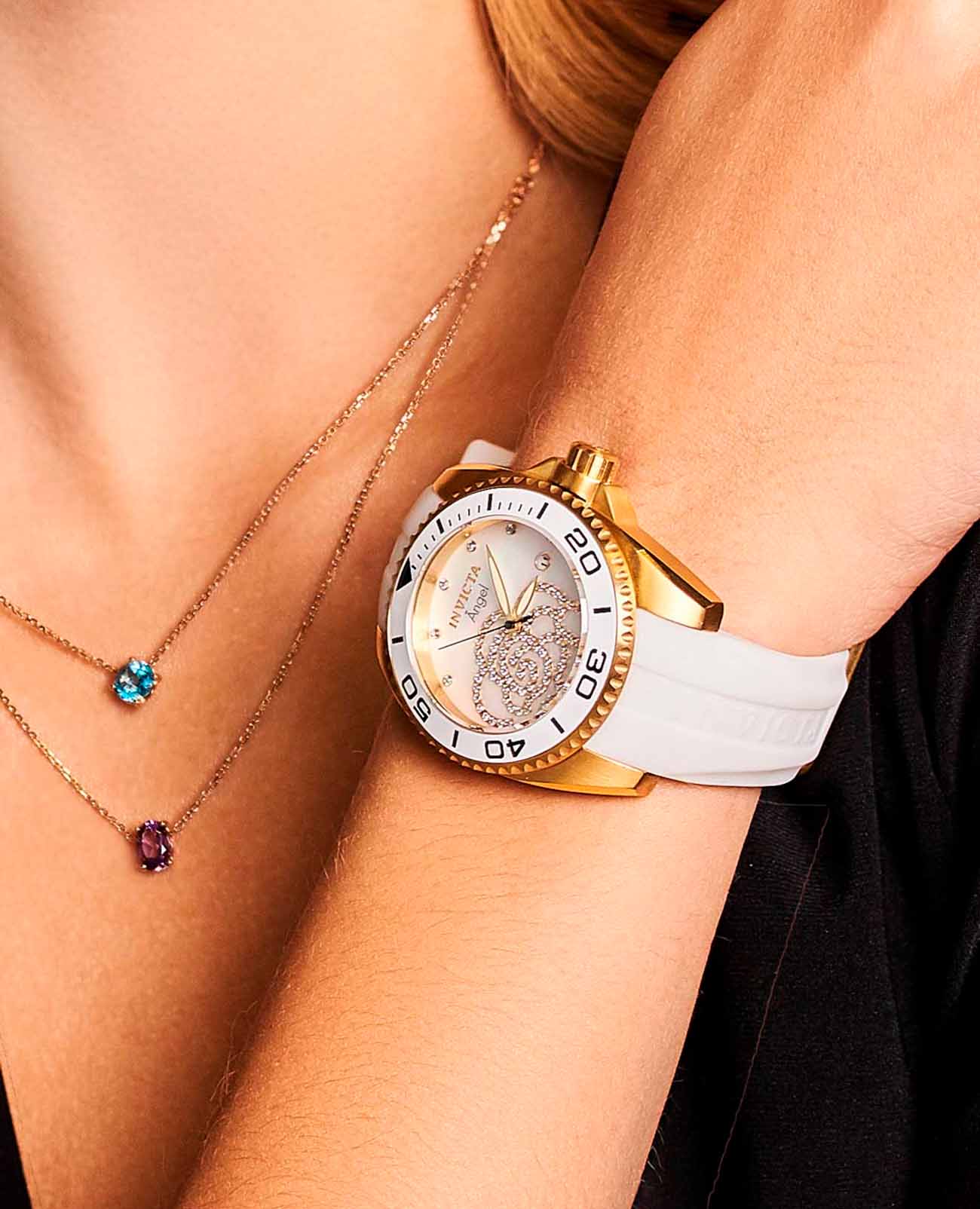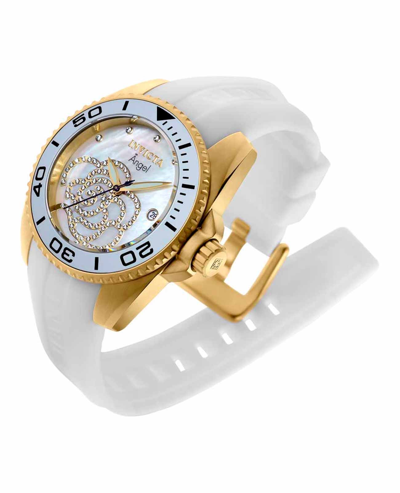 Женские наручные часы Invicta Angel модели IN0488 сочетают в себе элегантный дизайн и надежность современных технологий. Корпус выполнен из нержавеющей стали с IP-покрытиемIP-покрытиеМетод ионного напыления. Демонстрирует повышенную устойчивость к истиранию, окислению и химическим веществам. Под воздействием высокого давления и температуры около 1500°C молекулы металла надёжно соединяются с частицами корпуса часов., что придает часам изысканный вид, идеально подходящий для повседневной носки или особых случаев . БезельБезельВнешний ободок, закрепляющий стекло. В спортивных часах так называется поворотное кольцо с делениями на циферблате, выполняет роль таймера – замеряет отрезки времени на шкале. Неподвижный безель – элемент декора. Однонаправленно вращающийся безель на дайверских часах позволяет фиксировать моменты погружения и выныривания на поверхность. с IP-покрытиемIP-покрытиеМетод ионного напыления. Демонстрирует повышенную устойчивость к истиранию, окислению и химическим веществам. Под воздействием высокого давления и температуры около 1500°C молекулы металла надёжно соединяются с частицами корпуса часов.. Метки выполнены в виде штрихов и точек с люминесцентным покрытиемЛюминесцентное покрытиеПозволяет считывать показания времени в темноте. Производители наносят на стрелки, часовые индексы, безель или поверхность циферблата светонакопительный состав, дающий холодное свечение., что добавляет классический шарм . Часы оснащены минеральным стекломМинеральное стеклоМинеральное стекло представляет собой искусственно выращенный минерал кварца. Такое стекло отличается особой устойчивостью к повреждениям и царапинам. Уступает по некоторым качествам сапфировому стеклу., обеспечивающим прочную защиту от царапин и надежность в использовании. Силиконовый ремешок на стандартной застежке гарантирует комфортное ношение и безопасность . Модель имеет водонепроницаемость до 100 метров , которая позволит плавать, нырять и заниматься другими водными видами спорта. Механизм часов кварцевый, работающий на базе калибра TMI VJ32, что гарантирует высокую точность хода без необходимости подзаводки.