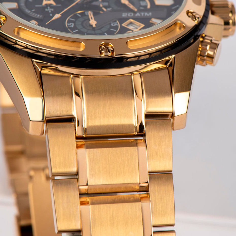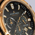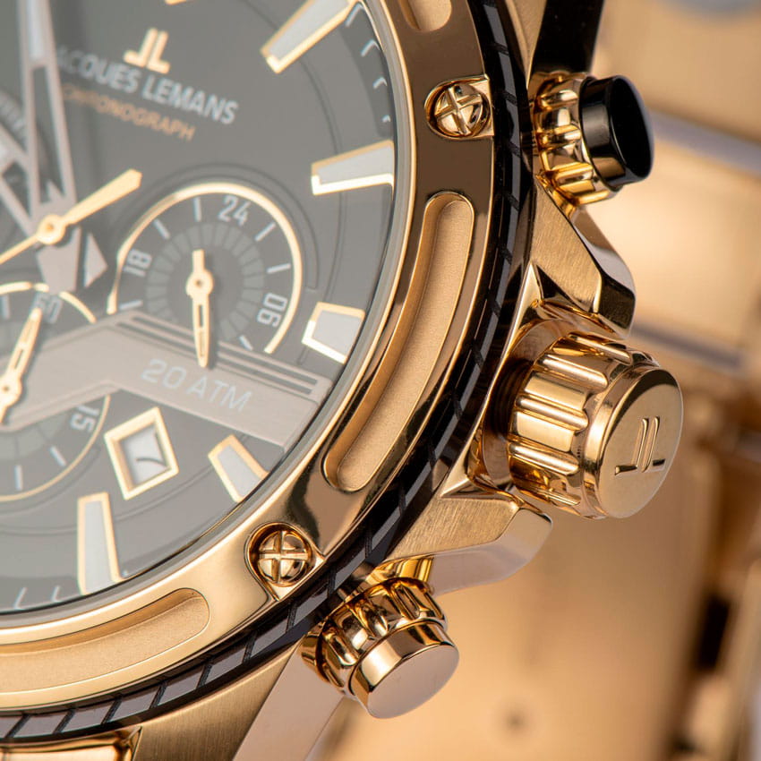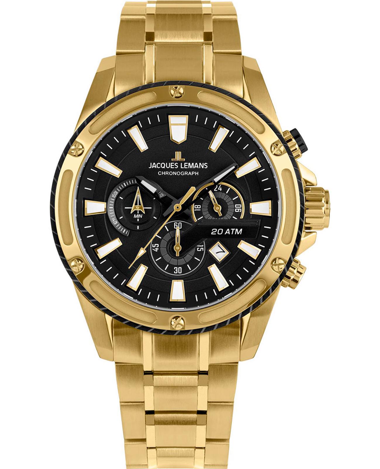 Мужские часы Jacques Lemans Liverpool 1-2141J с минеральным стекломМинеральное стеклоМинеральное стекло представляет собой искусственно выращенный минерал кварца. Такое стекло отличается особой устойчивостью к повреждениям и царапинам. Уступает по некоторым качествам сапфировому стеклу., кварцевый механизм с высокой точностью. Часы- хронографХронографФункция позволяет измерять отрезки времени с особой точностью: часы, минуты, секунды. Верным признаком хронографа является наличие на циферблате 3 дополнительных окошек-счётчиков. с секундомеромСекундомерСекундоме́р — прибор, способный измерять интервалы времени с точностью до долей секунды. представляют собой стильный аксессуар, отражающий идеальное сочетание современного дизайна, надёжности и функциональности. БезельБезельВнешний ободок, закрепляющий стекло. В спортивных часах так называется поворотное кольцо с делениями на циферблате, выполняет роль таймера – замеряет отрезки времени на шкале. Неподвижный безель – элемент декора. Однонаправленно вращающийся безель на дайверских часах позволяет фиксировать моменты погружения и выныривания на поверхность. из нержавеющей стали с PVDPVDУльтратонкое покрытие наносится в технике вакуумного напыления, сочетает в себе нитрид титана особой прочности со слоем золота или оксида хрома. Несёт в себе декоративную или защитную функцию. покрытием и с декоративными прорезями крепится к корпусу шестью винтами. На циферблате расположены три дополнительных индикатора и окошко даты. Стрелки и метки с люминесцентным покрытиемЛюминесцентное покрытиеПозволяет считывать показания времени в темноте. Производители наносят на стрелки, часовые индексы, безель или поверхность циферблата светонакопительный состав, дающий холодное свечение.. Класс водозащиты: 200 метров, позволит плавать, нырять и заниматься другими водными видами спорта.Корпус и браслет из нержавеющей стали с PVD-покрытиемPVDУльтратонкое покрытие наносится в технике вакуумного напыления, сочетает в себе нитрид титана особой прочности со слоем золота или оксида хрома. Несёт в себе декоративную или защитную функцию. на раскладной застёжкеРаскладная застёжкаТакой тип застёжки используется только на браслетах из металла. Она никогда не раскрывается полностью, происходит разделение на 2 и более частей. Раскладывающая застёжка снизит вероятность потери часов к минимуму..