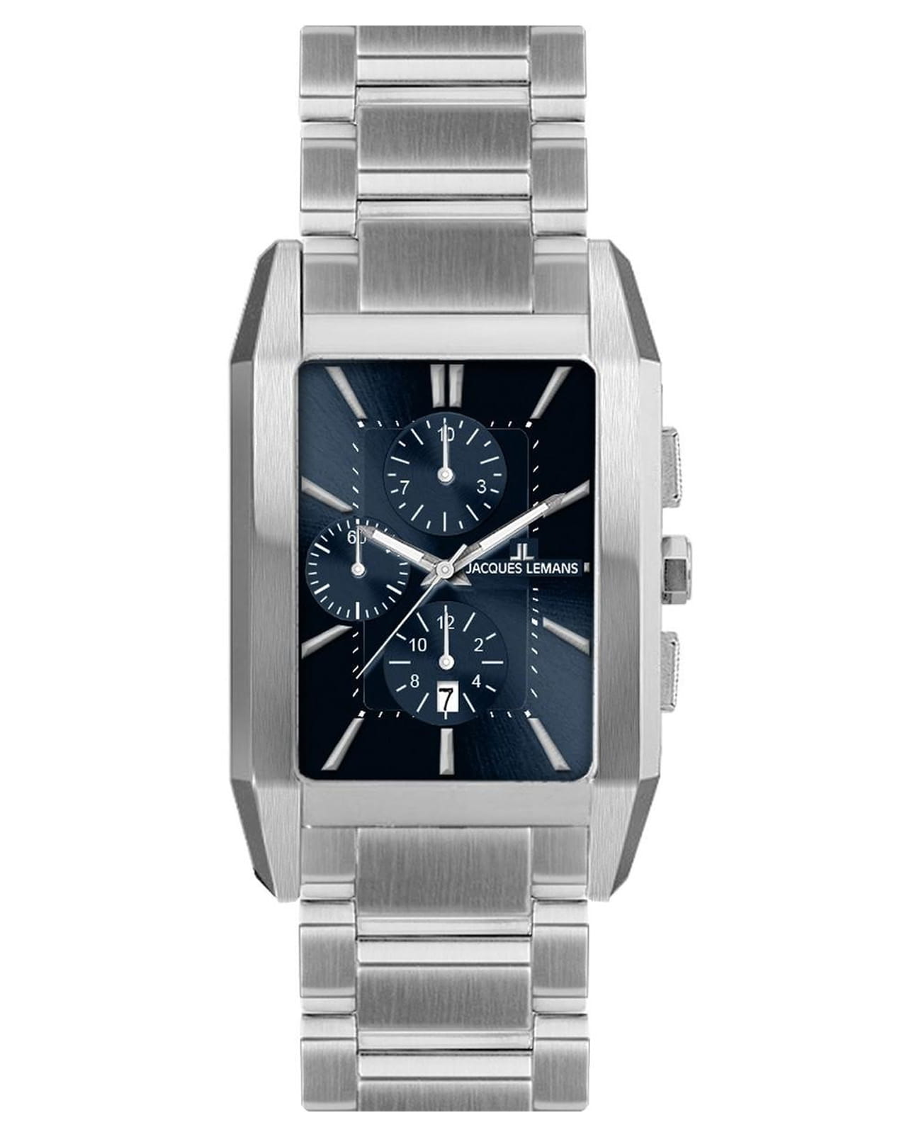 Мужские часы- хронографХронографФункция позволяет измерять отрезки времени с особой точностью: часы, минуты, секунды. Верным признаком хронографа является наличие на циферблате 3 дополнительных окошек-счётчиков. Jacques Lemans Classic 1-2161J, кварцевый механизм с высокой точностью.  Минеральное стеклоМинеральное стеклоМинеральное стекло представляет собой искусственно выращенный минерал кварца. Такое стекло отличается особой устойчивостью к повреждениям и царапинам. Уступает по некоторым качествам сапфировому стеклу. устойчивое к мелким механическим повреждениям. Корпус часов изготовлен из стали. Окошко даты находится в положении 6 часов. Стрелки с люминесцентным покрытиемЛюминесцентное покрытиеПозволяет считывать показания времени в темноте. Производители наносят на стрелки, часовые индексы, безель или поверхность циферблата светонакопительный состав, дающий холодное свечение.. Класс водозащиты: 50 метров, позволит плавать, нырять и заниматься другими водными видами спорта. Стальной браслет на раскладной застёжкеРаскладная застёжкаТакой тип застёжки используется только на браслетах из металла. Она никогда не раскрывается полностью, происходит разделение на 2 и более частей. Раскладывающая застёжка снизит вероятность потери часов к минимуму..