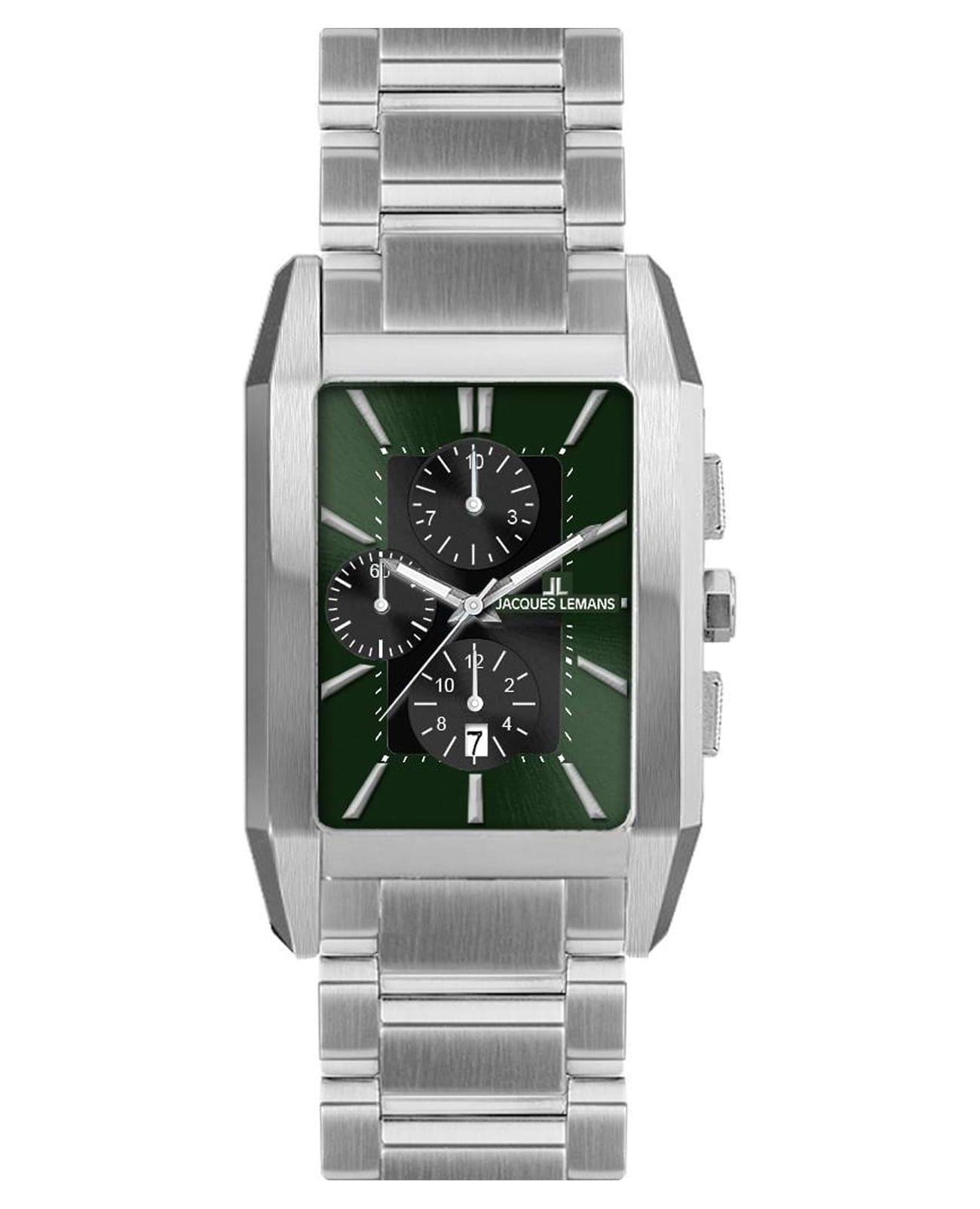 Мужские часы- хронографХронографФункция позволяет измерять отрезки времени с особой точностью: часы, минуты, секунды. Верным признаком хронографа является наличие на циферблате 3 дополнительных окошек-счётчиков. Jacques Lemans Classic 1-2161L, кварцевый механизм с высокой точностью.  Минеральное стеклоМинеральное стеклоМинеральное стекло представляет собой искусственно выращенный минерал кварца. Такое стекло отличается особой устойчивостью к повреждениям и царапинам. Уступает по некоторым качествам сапфировому стеклу. устойчивое к мелким механическим повреждениям. Корпус часов изготовлен из стали. Окошко даты находится в положении 6 часов. Стрелки с люминесцентным покрытиемЛюминесцентное покрытиеПозволяет считывать показания времени в темноте. Производители наносят на стрелки, часовые индексы, безель или поверхность циферблата светонакопительный состав, дающий холодное свечение.. Класс водозащиты: 50 метров, позволит плавать, нырять и заниматься другими водными видами спорта. Стальной браслет на раскладной застёжкеРаскладная застёжкаТакой тип застёжки используется только на браслетах из металла. Она никогда не раскрывается полностью, происходит разделение на 2 и более частей. Раскладывающая застёжка снизит вероятность потери часов к минимуму..