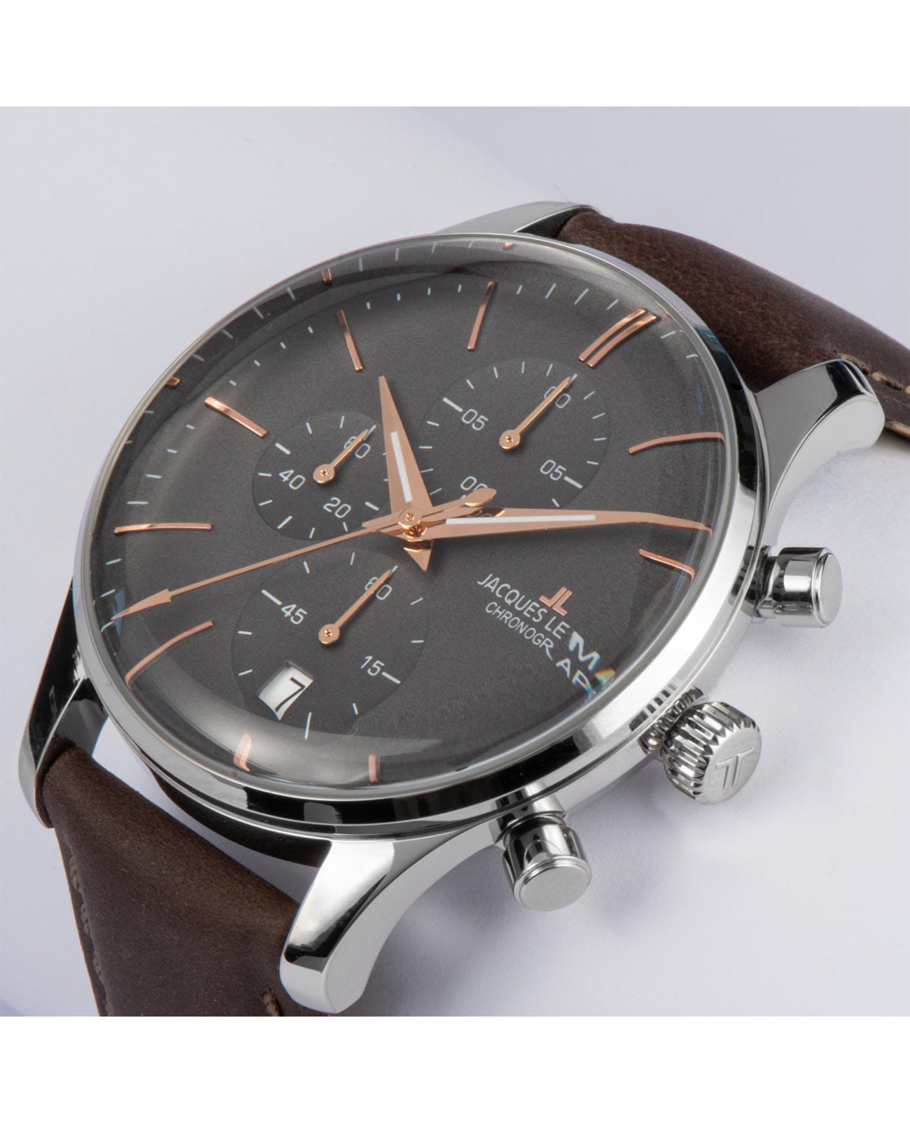Мужские часы-хронографХронографФункция позволяет измерять отрезки времени с особой точностью: часы, минуты, секунды. Верным признаком хронографа является наличие на циферблате 3 дополнительных окошек-счётчиков. с секундомеромСекундомерСекундоме́р — прибор, способный измерять интервалы времени с точностью до долей секунды. Jacques Lemans Classic 1-2163E, кварцевый механизм с высокой точностью. Минеральное стеклоМинеральное стеклоМинеральное стекло представляет собой искусственно выращенный минерал кварца. Такое стекло отличается особой устойчивостью к повреждениям и царапинам. Уступает по некоторым качествам сапфировому стеклу. устойчивое к мелким механическим повреждениям. Корпус часов изготовлен из стали. Окошко даты находится в положении 6 часов. Стрелки с люминесцентным покрытиемЛюминесцентное покрытиеПозволяет считывать показания времени в темноте. Производители наносят на стрелки, часовые индексы, безель или поверхность циферблата светонакопительный состав, дающий холодное свечение.. Класс водозащиты: 50 метров, позволит плавать, нырять и заниматься другими водными видами спорта. Кожаный ремешок на стандартной застёжке.