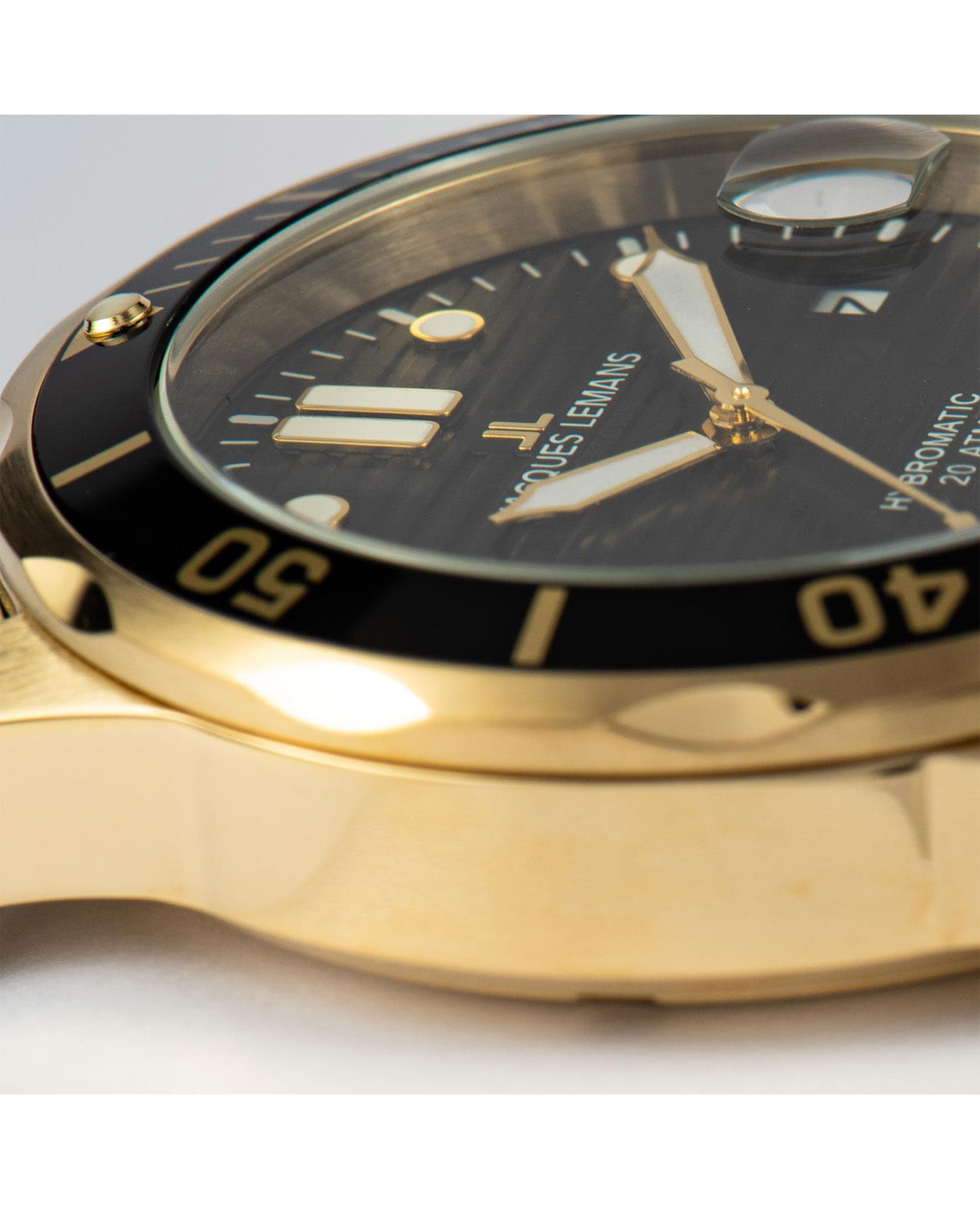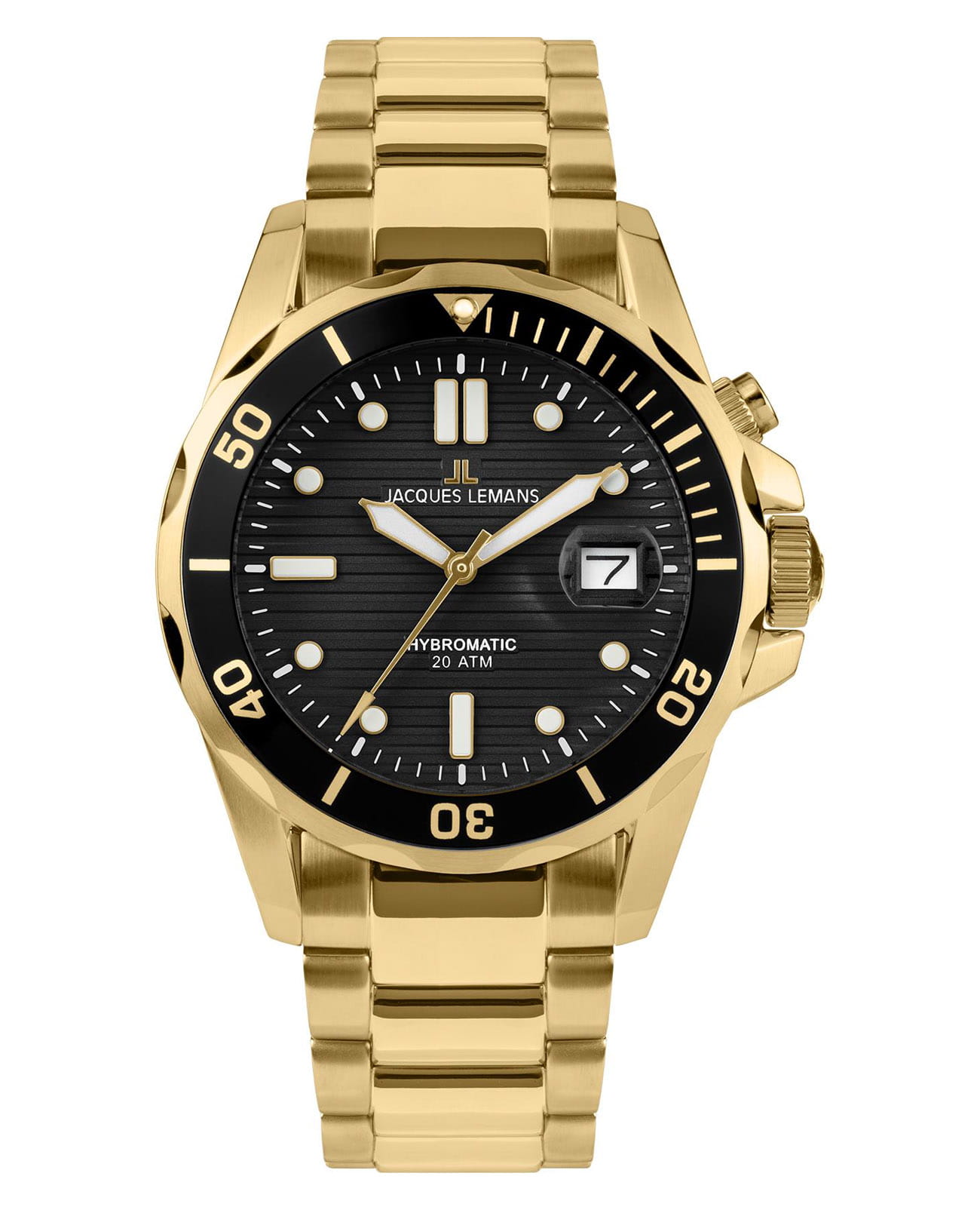 Мужские часы Jacques Lemans Hybromatic 1-2170M с минеральным стекломМинеральное стеклоМинеральное стекло представляет собой искусственно выращенный минерал кварца. Такое стекло отличается особой устойчивостью к повреждениям и царапинам. Уступает по некоторым качествам сапфировому стеклу., гибрид кварца и механики с автоподзаводом. Корпус выполенен из нержавеющей стали с PVD-покрытиемPVDУльтратонкое покрытие наносится в технике вакуумного напыления, сочетает в себе нитрид титана особой прочности со слоем золота или оксида хрома. Несёт в себе декоративную или защитную функцию.. Вращающийся безельБезельВнешний ободок, закрепляющий стекло. В спортивных часах так называется поворотное кольцо с делениями на циферблате, выполняет роль таймера – замеряет отрезки времени на шкале. Неподвижный безель – элемент декора. Однонаправленно вращающийся безель на дайверских часах позволяет фиксировать моменты погружения и выныривания на поверхность. из нержавеющей стали с PVDPVDУльтратонкое покрытие наносится в технике вакуумного напыления, сочетает в себе нитрид титана особой прочности со слоем золота или оксида хрома. Несёт в себе декоративную или защитную функцию. покрытием. Стрелки и метки с люминесцентным покрытиемЛюминесцентное покрытиеПозволяет считывать показания времени в темноте. Производители наносят на стрелки, часовые индексы, безель или поверхность циферблата светонакопительный состав, дающий холодное свечение.. Окошко даты находится в положении 3 часов. Класс водозащиты: 200 метров, позволит плавать, нырять и заниматься другими водными видами спорта. Стальной браслет с PVD-покрытиемPVDУльтратонкое покрытие наносится в технике вакуумного напыления, сочетает в себе нитрид титана особой прочности со слоем золота или оксида хрома. Несёт в себе декоративную или защитную функцию. на раскладной застёжкеРаскладная застёжкаТакой тип застёжки используется только на браслетах из металла. Она никогда не раскрывается полностью, происходит разделение на 2 и более частей. Раскладывающая застёжка снизит вероятность потери часов к минимуму..