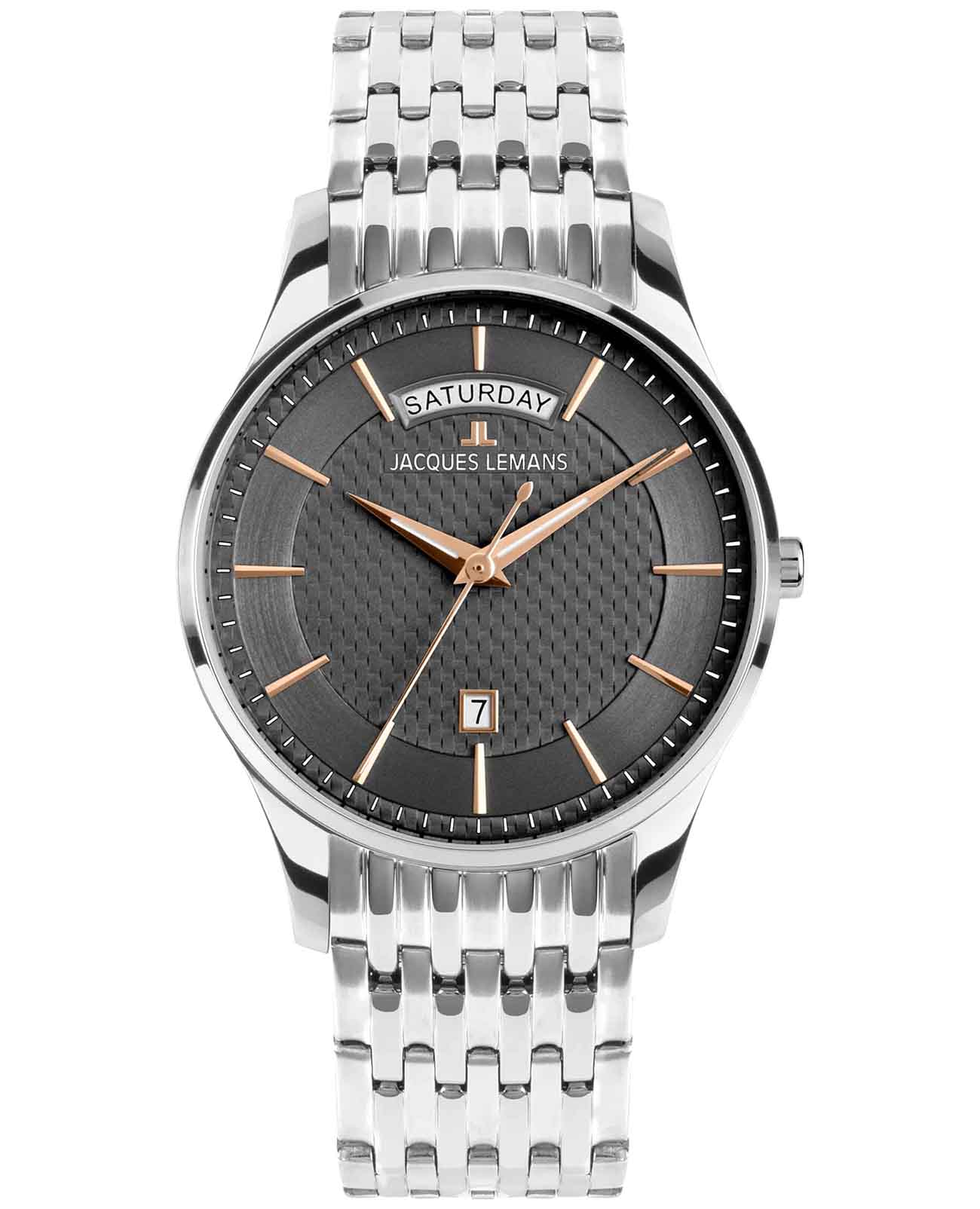 Мужские часы Jacques Lemans 1-2193I – лаконичная красота и изысканная элегантность. Корпус из нержавеющей стали диаметром 40 мм идеально сбалансирован и элегантен. Ударопрочное минеральное стеклоМинеральное стеклоМинеральное стекло представляет собой искусственно выращенный минерал кварца. Такое стекло отличается особой устойчивостью к повреждениям и царапинам. Уступает по некоторым качествам сапфировому стеклу. Crystex защищает циферблат от царапин. Стальной браслет на застёжке-бабочке с кнопкамиЗастёжка "бабочка"Такой вид застёжки дополняется предохранителями, помогающими избежать случайного раскрытия браслета. Обладают изящным исполнением. . Крупные накладные риски хорошо читаются благодаря PVD-покрытиюPVDУльтратонкое покрытие наносится в технике вакуумного напыления, сочетает в себе нитрид титана особой прочности со слоем золота или оксида хрома. Несёт в себе декоративную или защитную функцию. из розового золота. Водозащита 50 метров защищает часы от брызг и дождя, делая их подходящими для повседневного использования. Стрелки и метки с люминесцентным покрытиемЛюминесцентное покрытиеПозволяет считывать показания времени в темноте. Производители наносят на стрелки, часовые индексы, безель или поверхность циферблата светонакопительный состав, дающий холодное свечение. позволяющие легко определять время даже в темноте. Окошко даты находится в положении 6 часов. Широкое окошко дня недели в положении 12 часов позволяет показывать название дня недели полностью, без сокращений.