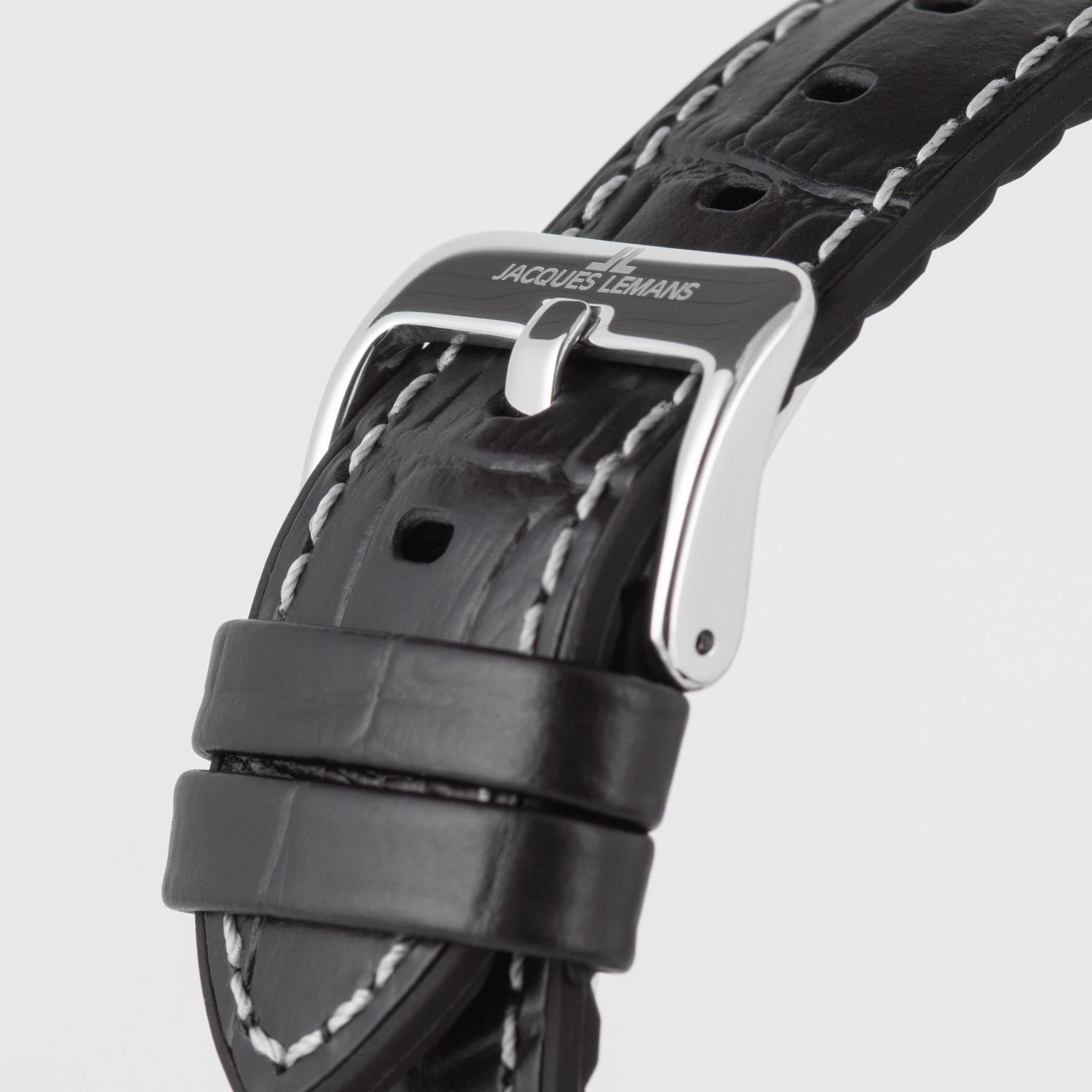 Мужские спортивные часы Jacques Lemans Liverpool Diver 1-2205G представляют собой стильный аксессуар, отражающий идеальное сочетание современного дизайна, надёжности и функциональности. Корпус из нержавеющей стали диаметром 41 мм идеально сбалансирован и элегантен. Ударопрочное минеральное стеклоМинеральное стеклоМинеральное стекло представляет собой искусственно выращенный минерал кварца. Такое стекло отличается особой устойчивостью к повреждениям и царапинам. Уступает по некоторым качествам сапфировому стеклу. Crystex защищает циферблат от царапин. Широкий безельБезельВнешний ободок, закрепляющий стекло. В спортивных часах так называется поворотное кольцо с делениями на циферблате, выполняет роль таймера – замеряет отрезки времени на шкале. Неподвижный безель – элемент декора. Однонаправленно вращающийся безель на дайверских часах позволяет фиксировать моменты погружения и выныривания на поверхность. с PVD-покрытиемPVDУльтратонкое покрытие наносится в технике вакуумного напыления, сочетает в себе нитрид титана особой прочности со слоем золота или оксида хрома. Несёт в себе декоративную или защитную функцию., на который вынесена дополнительная индикация секунд. Ремешок черного цвета состоит из двух частей: внутренняя сделана из силикона, материала, который не боится повышенной влажности, внешняя — из натуральной кожи. Водозащита 200 метров позволит плавать, нырять и заниматься другими водными видами спорта. Стрелки и метки с люминесцентным покрытиемЛюминесцентное покрытиеПозволяет считывать показания времени в темноте. Производители наносят на стрелки, часовые индексы, безель или поверхность циферблата светонакопительный состав, дающий холодное свечение. позволяющие легко определять время даже в темноте. Окошко даты находится в положении 6 часов. Это аксессуар для мужчины, который ценит классический стиль и функциональность.