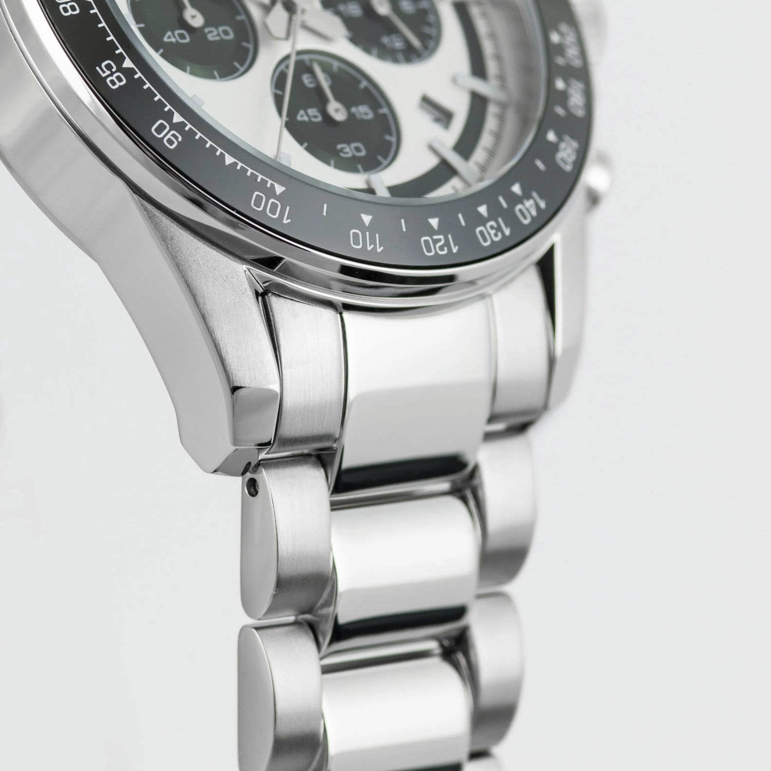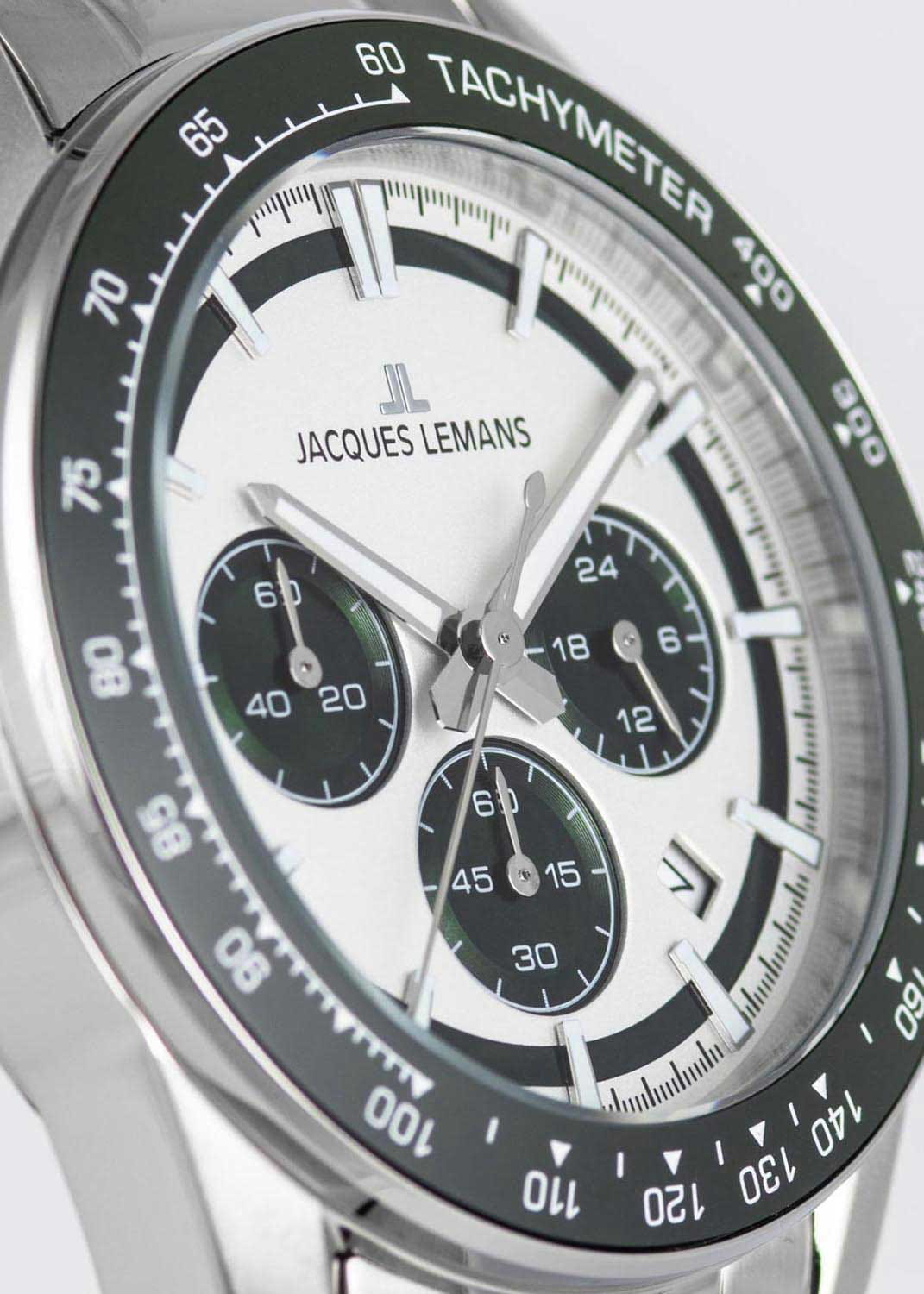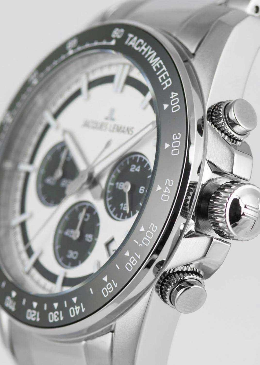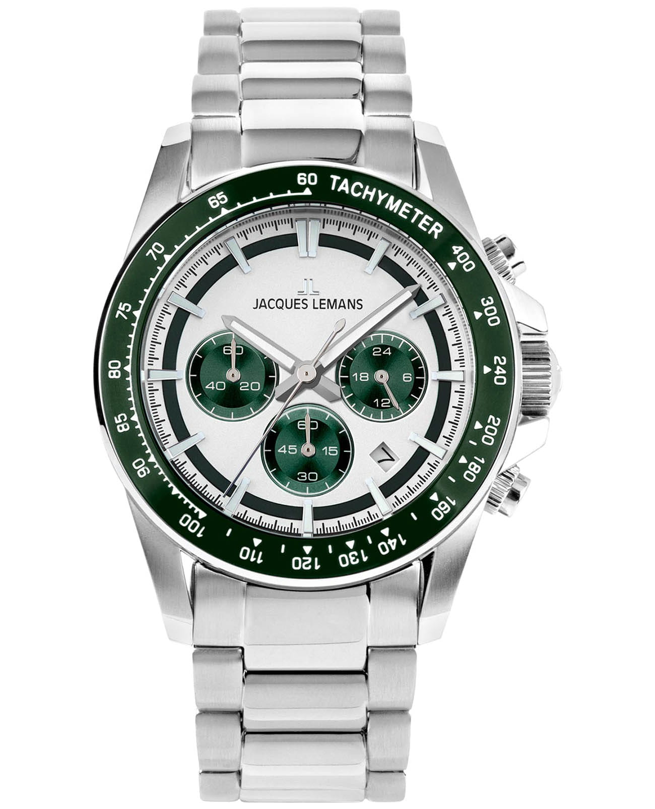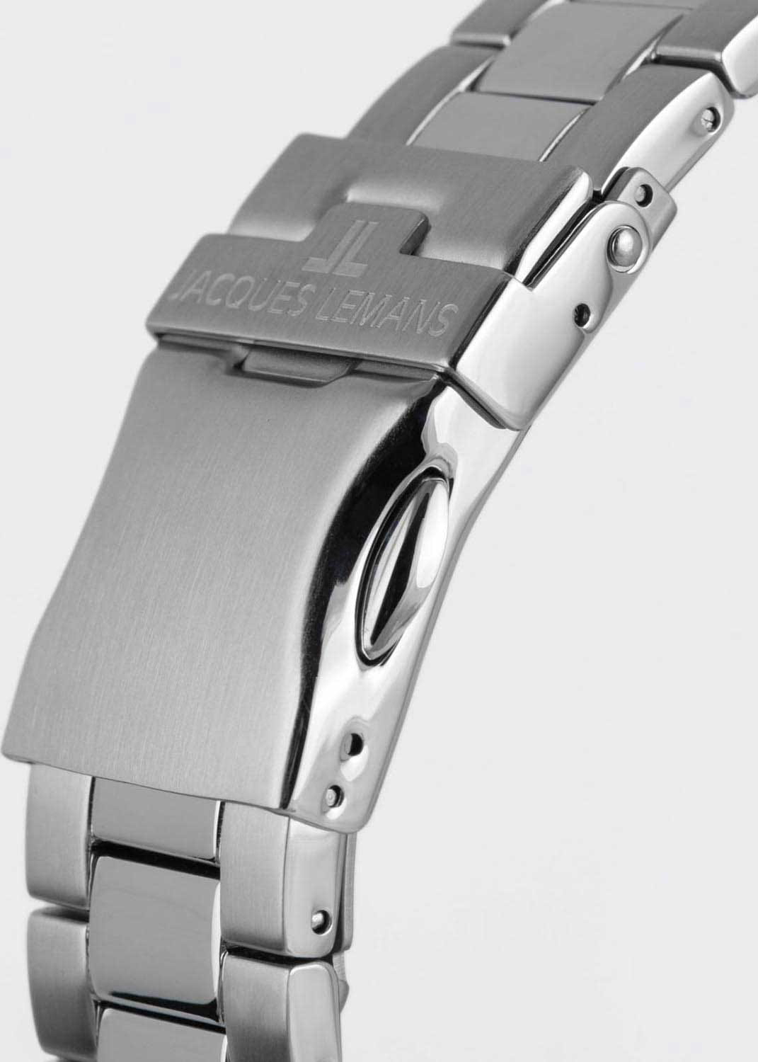Мужские кварцевые часы-хронографХронографФункция позволяет измерять отрезки времени с особой точностью: часы, минуты, секунды. Верным признаком хронографа является наличие на циферблате 3 дополнительных окошек-счётчиков. с секундомеромСекундомерСекундоме́р — прибор, способный измерять интервалы времени с точностью до долей секунды. Jacques Lemans 1-2207E – лаконичная красота и изысканная элегантность. Оригинальная модель с классическим оформлением станет превосходным завершением образа, наделив его индивидуальным характером. Корпус выполнен из нержавеющей стали серебристого цвета, диаметром 43 мм, что обеспечивает долговечность и утончённый внешний вид. Минеральное стеклоМинеральное стеклоМинеральное стекло представляет собой искусственно выращенный минерал кварца. Такое стекло отличается особой устойчивостью к повреждениям и царапинам. Уступает по некоторым качествам сапфировому стеклу. повышенной прочности Crystex защищает циферблат от царапин. Неподвижный безельБезельВнешний ободок, закрепляющий стекло. В спортивных часах так называется поворотное кольцо с делениями на циферблате, выполняет роль таймера – замеряет отрезки времени на шкале. Неподвижный безель – элемент декора. Однонаправленно вращающийся безель на дайверских часах позволяет фиксировать моменты погружения и выныривания на поверхность. с PVD-покрытиемPVDУльтратонкое покрытие наносится в технике вакуумного напыления, сочетает в себе нитрид титана особой прочности со слоем золота или оксида хрома. Несёт в себе декоративную или защитную функцию. и тахиметромТахиметрРазмеченная шкала, располагается на ободке или безеле часов. Тахиметр позволяет рассчитать скорость на определённом участке пути, расстояние измеряется в километрах или милях.. Стальной браслет на раскладной застёжке с фиксаторомРаскладная застёжкаТакой тип застёжки используется только на браслетах из металла. Она никогда не раскрывается полностью, происходит разделение на 2 и более частей. Раскладывающая застёжка снизит вероятность потери часов к минимуму. обеспечивает комфортное ношение Водозащита 200 метров позволит плавать, нырять и заниматься другими водными видами спорта. Стрелки и метки с люминесцентным покрытиемЛюминесцентное покрытиеПозволяет считывать показания времени в темноте. Производители наносят на стрелки, часовые индексы, безель или поверхность циферблата светонакопительный состав, дающий холодное свечение. позволяющие легко определять время даже в темноте. 12-ти и 24-х часовой формат времени. Окошко даты находится в положении между 4 и 5 часами. Рифленая заводная головка с защитой. Это аксессуар для мужчины, который ценит классический стиль и функциональность.