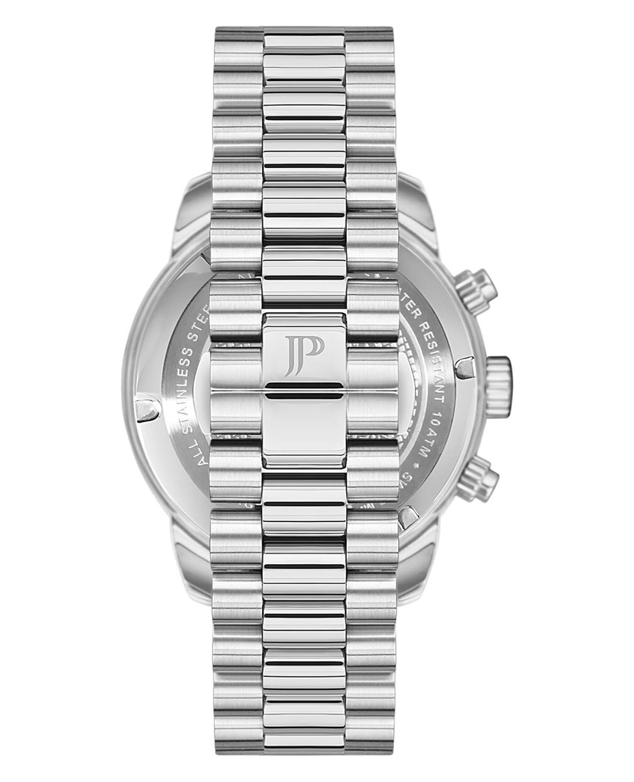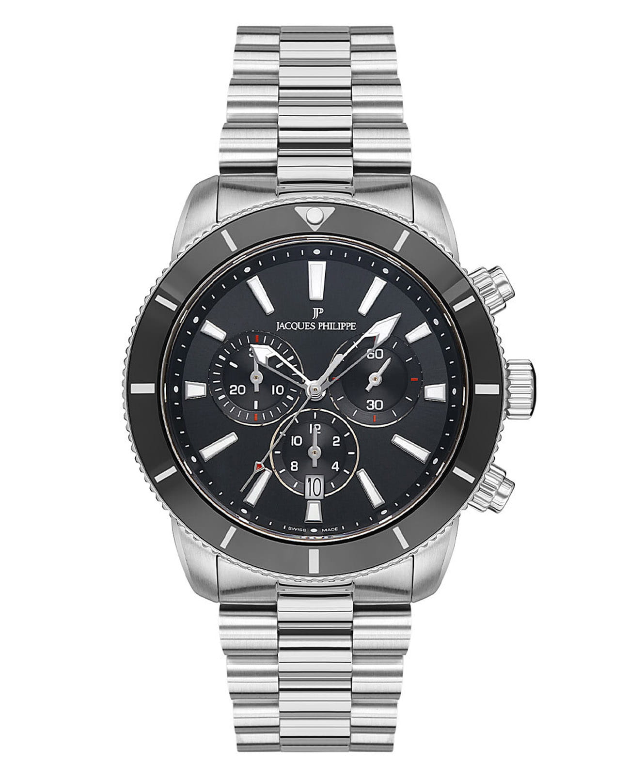 Швейцарские мужские часы-хронографХронографФункция позволяет измерять отрезки времени с особой точностью: часы, минуты, секунды. Верным признаком хронографа является наличие на циферблате 3 дополнительных окошек-счётчиков. с секундомеромСекундомерСекундоме́р — прибор, способный измерять интервалы времени с точностью до долей секунды. Jacques Philippe Victory JPQGC271316, кварцевый механизм с высокой точностью. Сапфировое стеклоСапфировое стеклоПрочный и надёжный материал из кристалла сапфира синтетического происхождения, характеризующийся особой твёрдостью и устойчивостью к царапинам и повреждениям. устойчивое к появлению царапин, обладающее высокой прозрачностью. Корпус часов изготовлен из нержавеющей стали. БезельБезельВнешний ободок, закрепляющий стекло. В спортивных часах так называется поворотное кольцо с делениями на циферблате, выполняет роль таймера – замеряет отрезки времени на шкале. Неподвижный безель – элемент декора. Однонаправленно вращающийся безель на дайверских часах позволяет фиксировать моменты погружения и выныривания на поверхность. из стали с IP-покрытиемIP-покрытиеМетод ионного напыления. Демонстрирует повышенную устойчивость к истиранию, окислению и химическим веществам. Под воздействием высокого давления и температуры около 1500°C молекулы металла надёжно соединяются с частицами корпуса часов.. На циферблате три дополнительных индикатора. Окошко даты находится в положении 6 часов. Стрелки с люминесцентным покрытиемЛюминесцентное покрытиеПозволяет считывать показания времени в темноте. Производители наносят на стрелки, часовые индексы, безель или поверхность циферблата светонакопительный состав, дающий холодное свечение.. Класс водозащиты: 100 метров, позволит плавать, нырять и заниматься другими водными видами спорта. Стальной браслет на застёжке «бабочка» с кнопкамиЗастёжка "бабочка"Такой вид застёжки дополняется предохранителями, помогающими избежать случайного раскрытия браслета. Обладают изящным исполнением. .