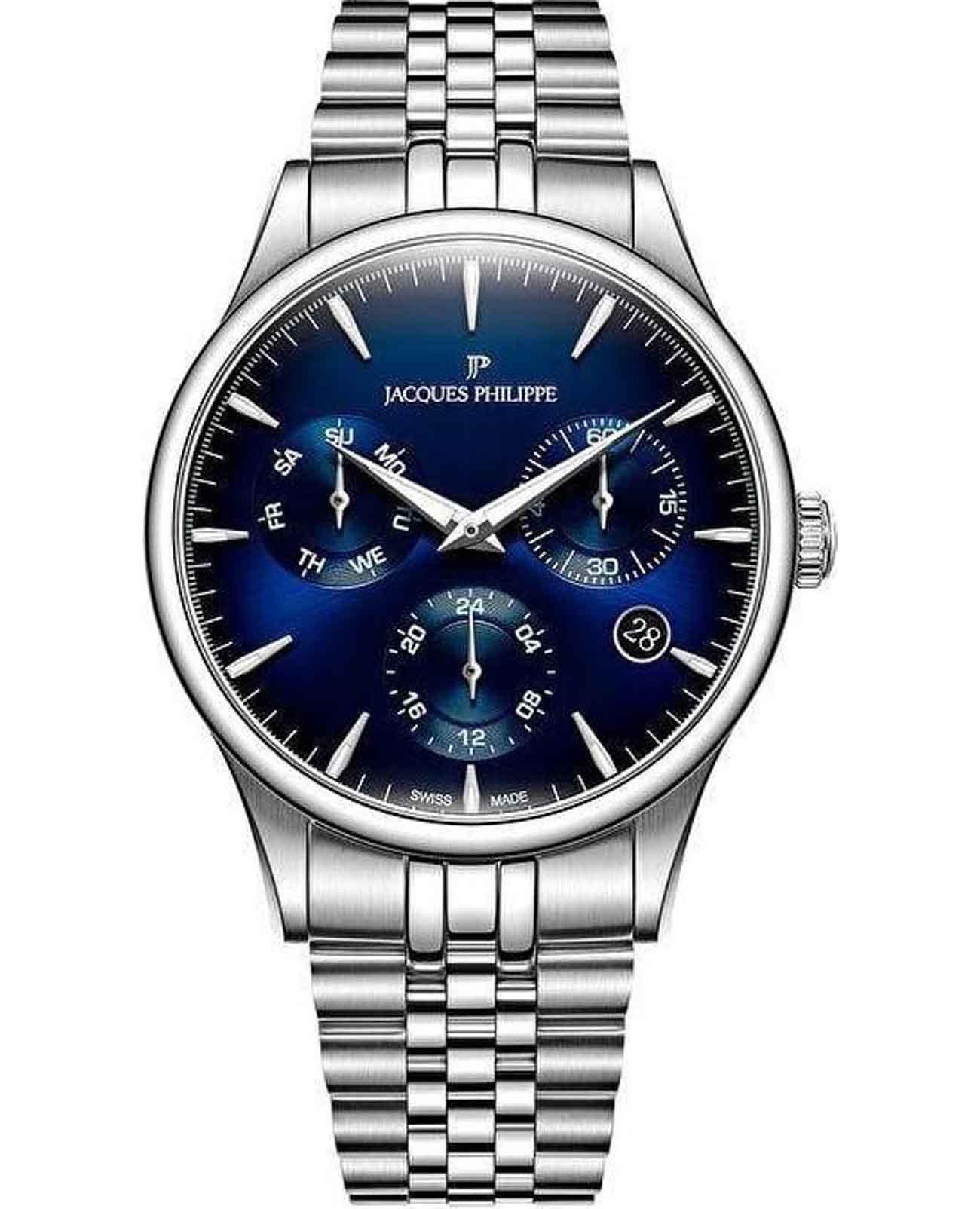 Швейцарские наручные часы Jacques Philippe Planum JPQGC671336 – это сочетание элегантности, точности и высокого качества исполнения. Корпус и браслет выполнены из нержавеющей стали 316L, что подчеркивает статус владельца и гарантирует долговечность. Классический синий циферблат с индикацией даты и дня недели делает модель не только стильной, но и практичной для ежедневного использования. Надежный кварцевый механизм обеспечивает точный ход, а сапфировое стеклоСапфировое стеклоПрочный и надёжный материал из кристалла сапфира синтетического происхождения, характеризующийся особой твёрдостью и устойчивостью к царапинам и повреждениям. защищает поверхность от царапин и механических повреждений. Стрелки имеют люминесцентное покрытиеЛюминесцентное покрытиеПозволяет считывать показания времени в темноте. Производители наносят на стрелки, часовые индексы, безель или поверхность циферблата светонакопительный состав, дающий холодное свечение. для удобства чтения времени в темноте. Диаметр корпуса составляет 40 мм, толщина – 12 мм, а стальной браслет шириной 20 мм с застежкой «бабочка»Застёжка "бабочка"Такой вид застёжки дополняется предохранителями, помогающими избежать случайного раскрытия браслета. Обладают изящным исполнением. обеспечивает удобную посадку на запястье. Водозащита 5 АТМ позволяет не беспокоиться о случайных брызгах и дожде.