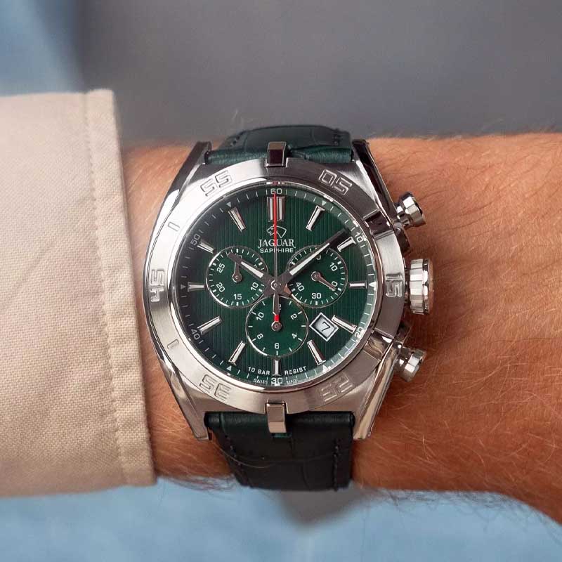 Мужские швейцарские часы-хронографХронографФункция позволяет измерять отрезки времени с особой точностью: часы, минуты, секунды. Верным признаком хронографа является наличие на циферблате 3 дополнительных окошек-счётчиков. Jaguar Executive Chrono J857/C. Кварцевый швейцарский калибр Ronda 5030d. Сапфировое стеклоСапфировое стеклоПрочный и надёжный материал из кристалла сапфира синтетического происхождения, характеризующийся особой твёрдостью и устойчивостью к царапинам и повреждениям. устойчивое к мелким механическим повреждениям. Корпус и браслет часов изготовлены из нержавеющей стали. Стрелки и метки с люминесцентным покрытиемЛюминесцентное покрытиеПозволяет считывать показания времени в темноте. Производители наносят на стрелки, часовые индексы, безель или поверхность циферблата светонакопительный состав, дающий холодное свечение.. Окошко даты находится в положении между «4» и «5 часами». Класс водозащиты: 100 метров, позволит плавать, нырять и заниматься другими водными видами спорта. Кожаный ремешок на стандартной застёжке.