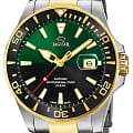 Мужские швейцарские часы Jaguar Executive Diver J863/4. Кварцевый швейцарский калибр Ronda 6003D. Сапфировое стеклоСапфировое стеклоПрочный и надёжный материал из кристалла сапфира синтетического происхождения, характеризующийся особой твёрдостью и устойчивостью к царапинам и повреждениям. устойчивое к мелким механическим повреждениям. Корпус и браслет часов изготовлены из нержавеющей стали. Стрелки и метки с люминесцентным покрытиемЛюминесцентное покрытиеПозволяет считывать показания времени в темноте. Производители наносят на стрелки, часовые индексы, безель или поверхность циферблата светонакопительный состав, дающий холодное свечение.. Окошко даты находится в положении 3 часа. Класс водозащиты: 200 метров, позволит плавать, нырять и заниматься другими водными видами спорта. Стальной браслет с частичным  PVD-покрытиемPVDУльтратонкое покрытие наносится в технике вакуумного напыления, сочетает в себе нитрид титана особой прочности со слоем золота или оксида хрома. Несёт в себе декоративную или защитную функцию. на раскладной застёжкеРаскладная застёжкаТакой тип застёжки используется только на браслетах из металла. Она никогда не раскрывается полностью, происходит разделение на 2 и более частей. Раскладывающая застёжка снизит вероятность потери часов к минимуму.. БезельБезельВнешний ободок, закрепляющий стекло. В спортивных часах так называется поворотное кольцо с делениями на циферблате, выполняет роль таймера – замеряет отрезки времени на шкале. Неподвижный безель – элемент декора. Однонаправленно вращающийся безель на дайверских часах позволяет фиксировать моменты погружения и выныривания на поверхность. с PVD-покрытиемPVDУльтратонкое покрытие наносится в технике вакуумного напыления, сочетает в себе нитрид титана особой прочности со слоем золота или оксида хрома. Несёт в себе декоративную или защитную функцию..