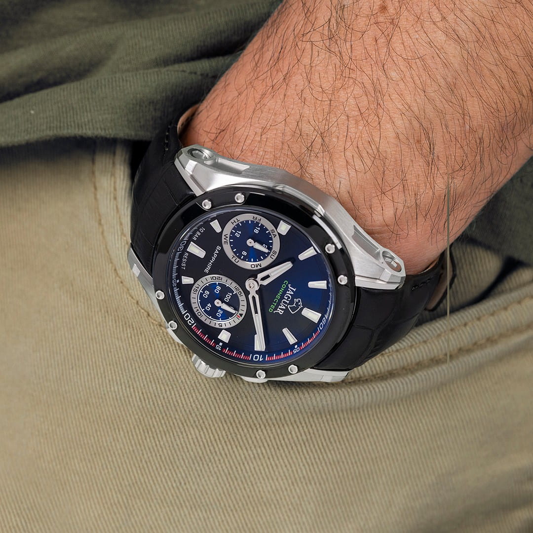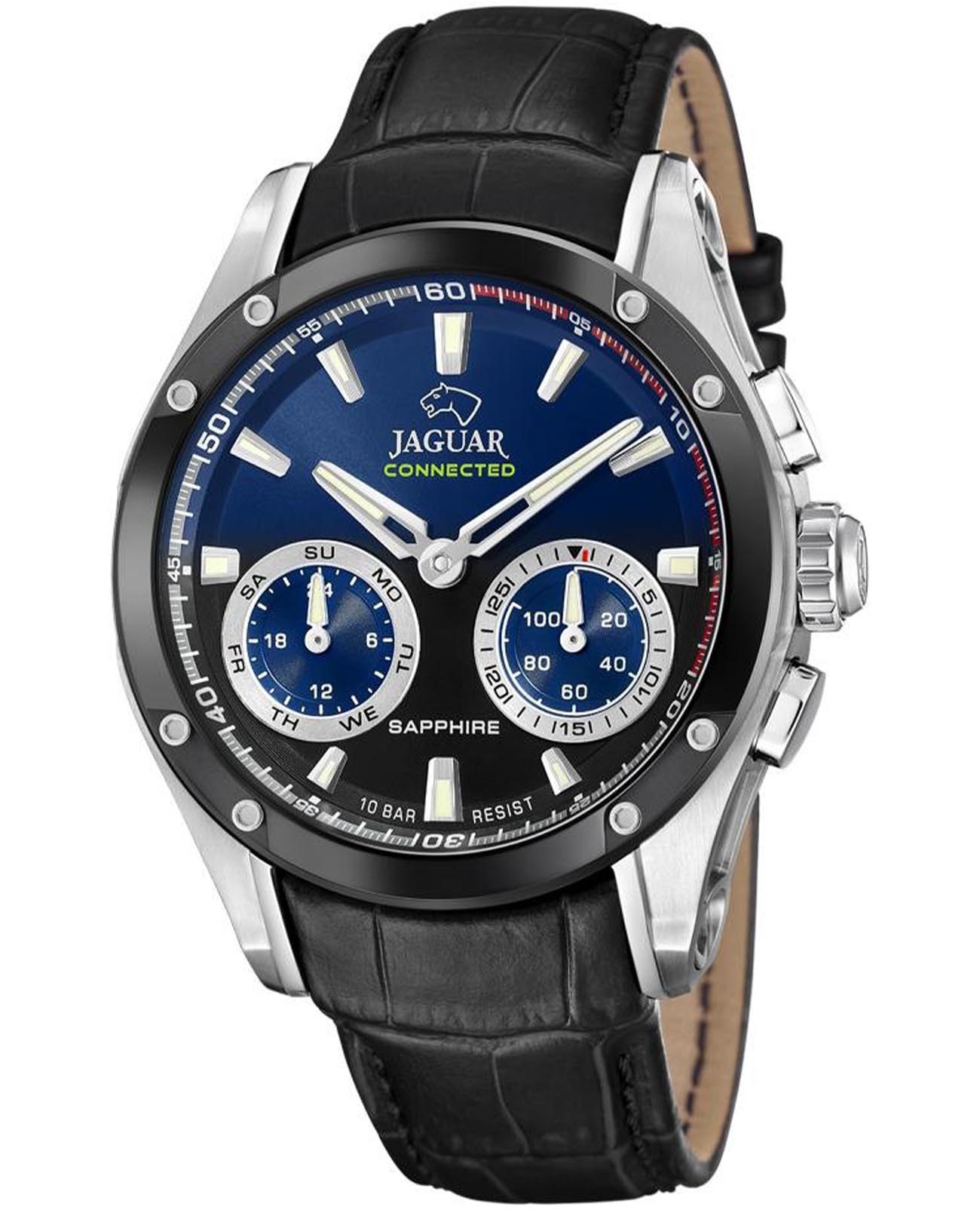 Мужские швейцарские часы Jaguar Connected J958/1. Сапфировое стеклоСапфировое стеклоПрочный и надёжный материал из кристалла сапфира синтетического происхождения, характеризующийся особой твёрдостью и устойчивостью к царапинам и повреждениям. устойчивое к мелким механическим повреждениям. Корпус часов изготовлен из нержавеющей стали. Стрелки и метки с люминесцентным покрытиемЛюминесцентное покрытиеПозволяет считывать показания времени в темноте. Производители наносят на стрелки, часовые индексы, безель или поверхность циферблата светонакопительный состав, дающий холодное свечение.. Календарь находится в положении 8 часов. Класс водозащиты: 100 метров, позволит плавать, нырять и заниматься другими водными видами спорта. Кожаный ремешок на стандартной застёжке. БезельБезельВнешний ободок, закрепляющий стекло. В спортивных часах так называется поворотное кольцо с делениями на циферблате, выполняет роль таймера – замеряет отрезки времени на шкале. Неподвижный безель – элемент декора. Однонаправленно вращающийся безель на дайверских часах позволяет фиксировать моменты погружения и выныривания на поверхность. с PVD-покрытиемPVDУльтратонкое покрытие наносится в технике вакуумного напыления, сочетает в себе нитрид титана особой прочности со слоем золота или оксида хрома. Несёт в себе декоративную или защитную функцию.. За точный ход работы часов, из коллекции Connected, отвечает кварцевый гибридный механизм швейцарского производства со Смарт-Модулем. Данный тип механизма обеспечивает возможность подключить часы к телефону через Bluetooth и управлять большим рядом дополнительных функций на выбор с помошью приложения Jaguar. Дополнительные функции: отображение даты и дня недели, секундомер, таймер, GMT, шагомер, поиск телефона, включение/выключение звука телефона при входящих вызовах, переключение музыки, вибро-уведомления.