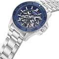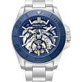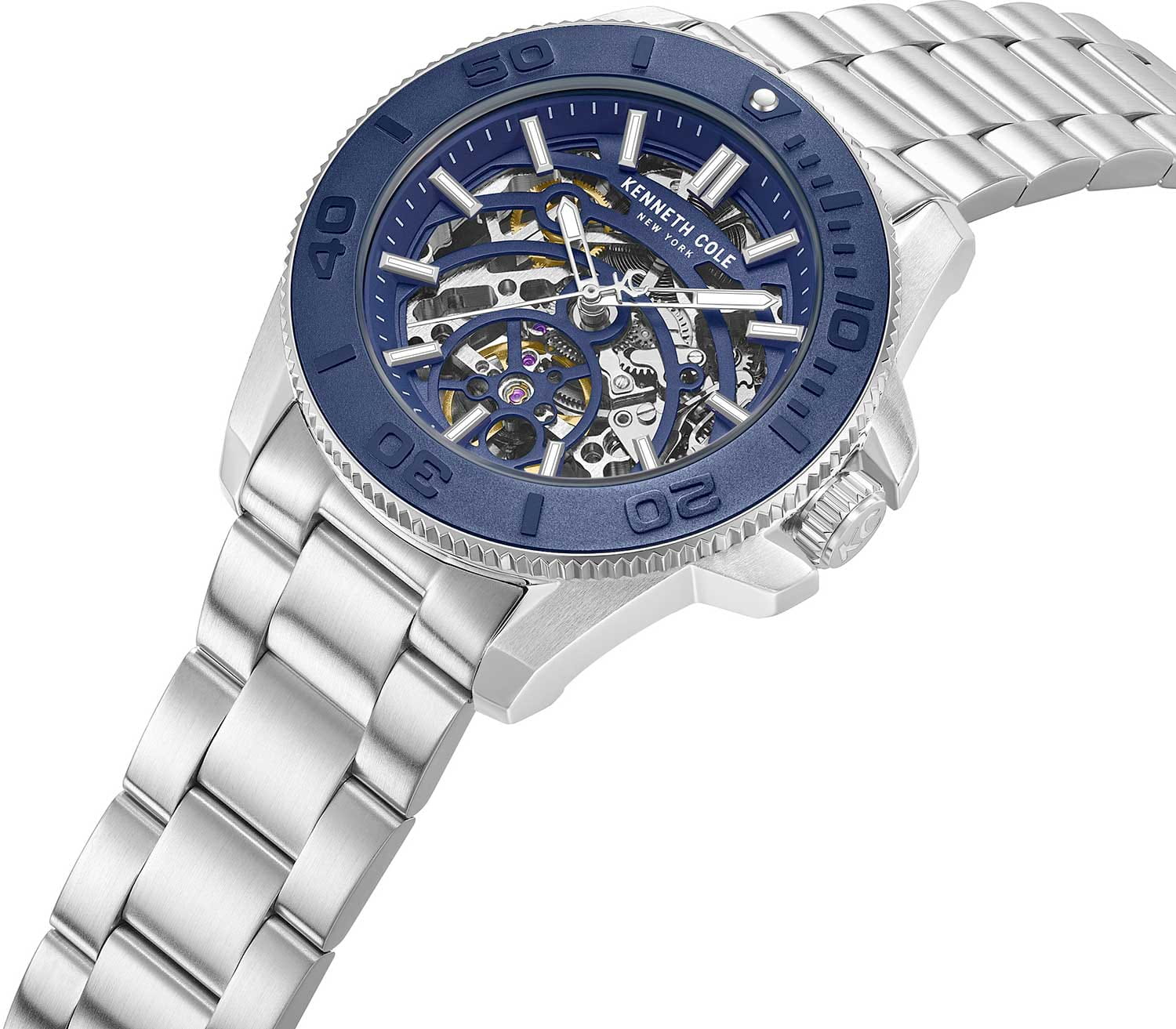 Мужские механические часы с автоподзаводом Kenneth Cole — это выразительный и элегантный аксессуар. Корпус диаметром 43 мм выполнен из нержавеющей стали 316L. БезельБезельВнешний ободок, закрепляющий стекло. В спортивных часах так называется поворотное кольцо с делениями на циферблате, выполняет роль таймера – замеряет отрезки времени на шкале. Неподвижный безель – элемент декора. Однонаправленно вращающийся безель на дайверских часах позволяет фиксировать моменты погружения и выныривания на поверхность. из нержавеющей стали с PVD-покрытиемPVDУльтратонкое покрытие наносится в технике вакуумного напыления, сочетает в себе нитрид титана особой прочности со слоем золота или оксида хрома. Несёт в себе декоративную или защитную функцию.. Циферблат синего цвета оформлен в стиле скелетон, что позволяет наблюдать за работой механизма. Циферблат защищён минеральным стекломМинеральное стеклоМинеральное стекло представляет собой искусственно выращенный минерал кварца. Такое стекло отличается особой устойчивостью к повреждениям и царапинам. Уступает по некоторым качествам сапфировому стеклу.. Механизм — автоматический с функцией подзавода от движения руки. Прозрачная задняя крышка открывает вид на механизм. Часы оснащены стальным браслетом на раскладной застёжкеРаскладная застёжкаТакой тип застёжки используется только на браслетах из металла. Она никогда не раскрывается полностью, происходит разделение на 2 и более частей. Раскладывающая застёжка снизит вероятность потери часов к минимуму.. Водонепроницаемость 50 м позволяет использовать часы в повседневных условиях. Идеальный выбор для тех, кто ценит стиль, технологии и американское качество.