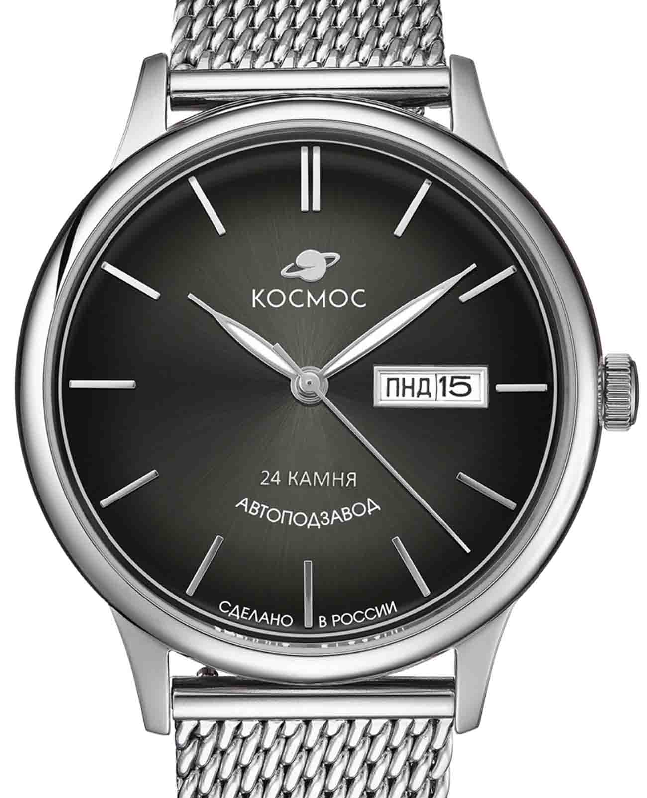 Российские мужские механические часы Космос K 043.10.31 с автоподзаводом оснащены корпусом из нержавеющей стали 316L диаметром 41 мм и защищены минеральным стекломМинеральное стеклоМинеральное стекло представляет собой искусственно выращенный минерал кварца. Такое стекло отличается особой устойчивостью к повреждениям и царапинам. Уступает по некоторым качествам сапфировому стеклу.. Дополнен функциями отображения даты и дня недели. Заводная головка декорирована логотипом бренда в виде стилизованного изображения планеты. Часы имеют водонепроницаемость 50 метров, позволит защитить корпус от случайных брызг или капель дождя. Модель комплектуется браслетом из нержавеющей стали 316L с миланским плетением на раскладном замкеРаскладной замокДанный вариант застежки используется только на часах с металлическим браслетом. Отличительная особенность такого крепления в том, что длина браслета становится универсальной и вы можете самостоятельно отрегулировать нужный вам размер – застежка просто двигается по браслету часов.. Специальные крепежи позволяют легко заменить браслет на часах самостоятельно. Прочный корпус и надежный механизм делают эти часы универсальным аксессуаром для повседневного использования. Уникальный дизайн и высокое качество материалов подчеркивают индивидуальность владельца.
