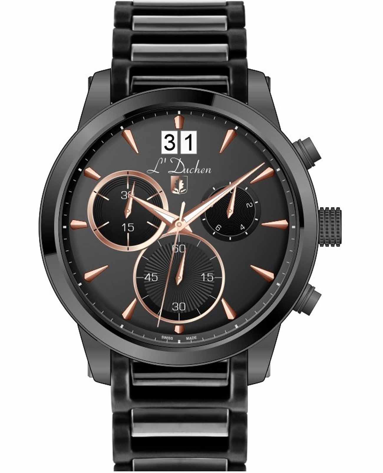 Мужские швейцарские часы-хронографХронографФункция позволяет измерять отрезки времени с особой точностью: часы, минуты, секунды. Верным признаком хронографа является наличие на циферблате 3 дополнительных окошек-счётчиков. L'Duchen Aerostat Chrono D 232.70.35, кварцевый механизм с высокой точностью. Сапфировое стеклоСапфировое стеклоПрочный и надёжный материал из кристалла сапфира синтетического происхождения, характеризующийся особой твёрдостью и устойчивостью к царапинам и повреждениям. устойчивое к появлению царапин, обладающее высокой прозрачностью. Корпус часов выполнен из нержавеющей стали с PVD-покрытиемPVDУльтратонкое покрытие наносится в технике вакуумного напыления, сочетает в себе нитрид титана особой прочности со слоем золота или оксида хрома. Несёт в себе декоративную или защитную функцию.. БезельБезельВнешний ободок, закрепляющий стекло. В спортивных часах так называется поворотное кольцо с делениями на циферблате, выполняет роль таймера – замеряет отрезки времени на шкале. Неподвижный безель – элемент декора. Однонаправленно вращающийся безель на дайверских часах позволяет фиксировать моменты погружения и выныривания на поверхность. из керамики. Стрелки с люминесцентным покрытиемЛюминесцентное покрытиеПозволяет считывать показания времени в темноте. Производители наносят на стрелки, часовые индексы, безель или поверхность циферблата светонакопительный состав, дающий холодное свечение.. Класс водозащиты: 100 метров, позволит плавать, нырять и заниматься другими водными видами спорта. Стальной браслет с PVD-покрытиемPVDУльтратонкое покрытие наносится в технике вакуумного напыления, сочетает в себе нитрид титана особой прочности со слоем золота или оксида хрома. Несёт в себе декоративную или защитную функцию. и керамическими вставками на застёжке «бабочка» с кнопкамиЗастёжка "бабочка"Такой вид застёжки дополняется предохранителями, помогающими избежать случайного раскрытия браслета. Обладают изящным исполнением. .