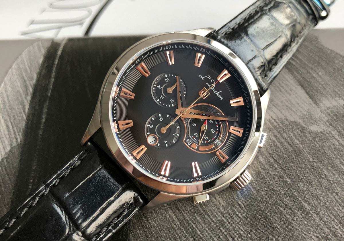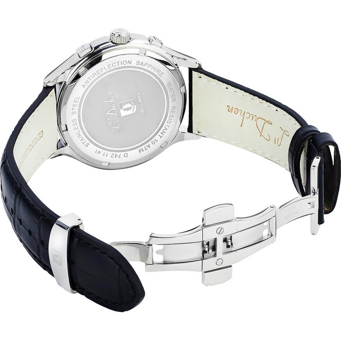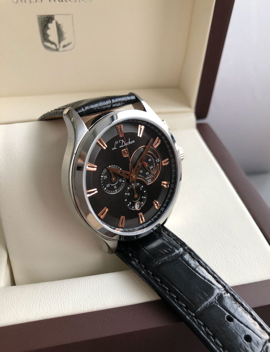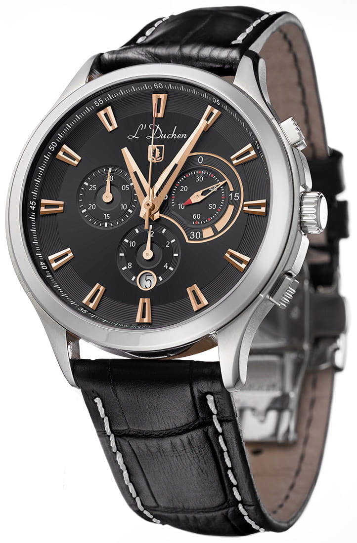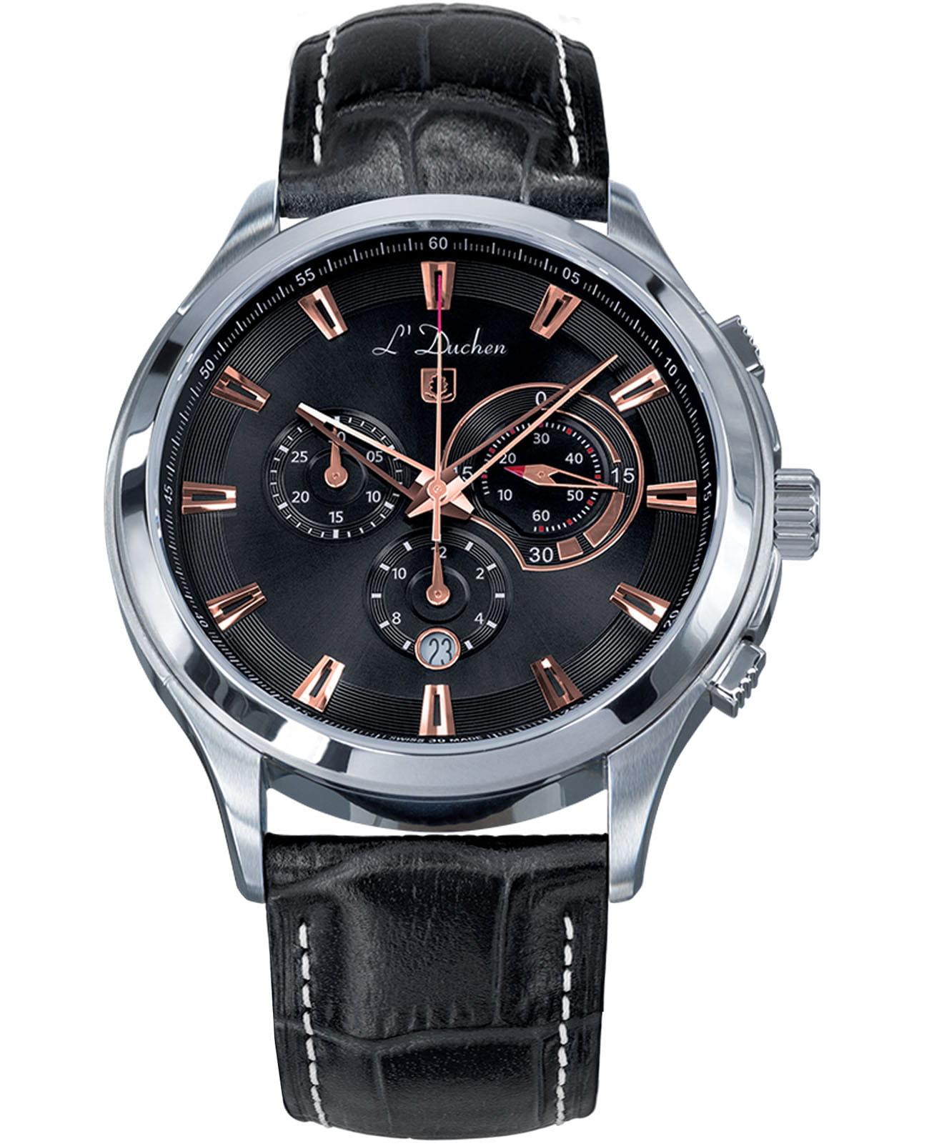 Мужские швейцарские часы- хронографХронографФункция позволяет измерять отрезки времени с особой точностью: часы, минуты, секунды. Верным признаком хронографа является наличие на циферблате 3 дополнительных окошек-счётчиков. L'Duchen Pilotage D 742.11.35, кварцевый механизм с высокой точностью. Сапфировое стеклоСапфировое стеклоПрочный и надёжный материал из кристалла сапфира синтетического происхождения, характеризующийся особой твёрдостью и устойчивостью к царапинам и повреждениям. устойчивое к появлению царапин, обладающее высокой прозрачностью. Корпус часов выполнен из нержавеющей стали. Класс водозащиты: 50 метров, позволит защитить корпус от случайных брызг или капель дождя. Кожаный ремешок на застёжке-бабочке с кнопкамиЗастёжка "бабочка"Такой вид застёжки дополняется предохранителями, помогающими избежать случайного раскрытия браслета. Обладают изящным исполнением. .