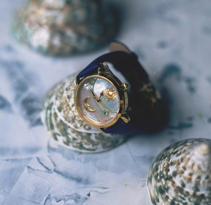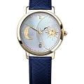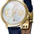 Женские кварцевые часы L'Duchen из коллекции Day & Night — это изысканный аксессуар, вдохновлённый сменой времени суток. Корпус диаметром 34 мм выполнен из нержавеющей стали с PVD-покрытиемPVDУльтратонкое покрытие наносится в технике вакуумного напыления, сочетает в себе нитрид титана особой прочности со слоем золота или оксида хрома. Несёт в себе декоративную или защитную функцию. жёлтого золота. Циферблат белого цвета изготовлен из натурального перламутра и условно разделён на две части: одна символизирует день с объёмным солнцем и декором в виде гильоше, другая — ночь с объёмным изображением луны. Окошко даты расположено в положении 6 часов. Циферблат защищён сапфировым стекломСапфировое стеклоПрочный и надёжный материал из кристалла сапфира синтетического происхождения, характеризующийся особой твёрдостью и устойчивостью к царапинам и повреждениям.. Часы оснащены ремешком из натуральной кожи синего цвета с сафьяновым тиснением и застёжкой «бабочка» с кнопкамиЗастёжка "бабочка"Такой вид застёжки дополняется предохранителями, помогающими избежать случайного раскрытия браслета. Обладают изящным исполнением. , украшенной логотипом бренда — дубовым листом, символом мудрости и долговечности. Заводная головка — восьмигранной формы. Водонепроницаемость 50 м позволяет использовать часы в повседневных условиях.
