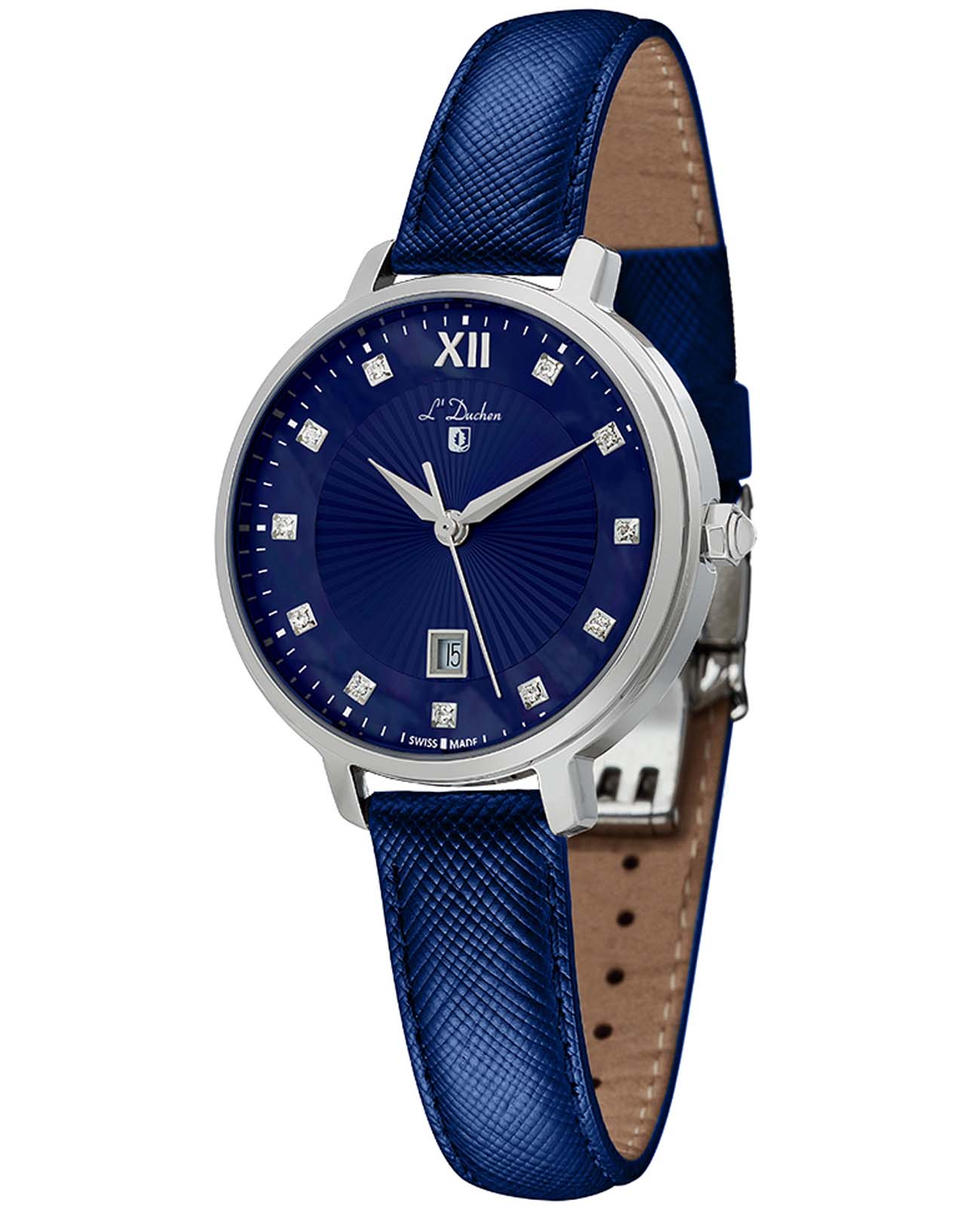 Женские швейцарские часы L'Duchen Eternity D 811.13.37, кварцевый механизм с высокой точностью. Сапфировое стеклоСапфировое стеклоПрочный и надёжный материал из кристалла сапфира синтетического происхождения, характеризующийся особой твёрдостью и устойчивостью к царапинам и повреждениям. устойчивое к появлению царапин, обладающее высокой прозрачностью. Корпус часов выполнен из нержавеющей стали. Окошко даты находится в положении 6 часов. Класс водозащиты: 50 метров, позволит защитить корпус от случайных брызг или капель дождя. Кожаный ремешок на застёжке «бабочка» с кнопкамиЗастёжка "бабочка"Такой вид застёжки дополняется предохранителями, помогающими избежать случайного раскрытия браслета. Обладают изящным исполнением. .