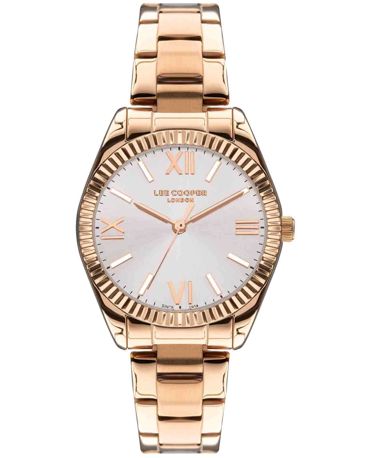 Женские наручные часы Lee Cooper LC07459.430 — это элегантная модель с утончённым дизайном. Корпус диаметром 32 мм выполнен из суперметалла с IP-покрытиемIP-покрытиеМетод ионного напыления. Демонстрирует повышенную устойчивость к истиранию, окислению и химическим веществам. Под воздействием высокого давления и температуры около 1500°C молекулы металла надёжно соединяются с частицами корпуса часов., что придаёт часам изысканный вид. Серебристый циферблат украшен изящными римскими цифрами и стрелками обеспечивая удобное считывание времени. Циферблат защищён минеральным стекломМинеральное стеклоМинеральное стекло представляет собой искусственно выращенный минерал кварца. Такое стекло отличается особой устойчивостью к повреждениям и царапинам. Уступает по некоторым качествам сапфировому стеклу., устойчивым к царапинам. Часы работают на кварцевом механизме, обеспечивая точность хода. Браслет из нержавеющей стали с раскладной застёжкойРаскладная застёжкаТакой тип застёжки используется только на браслетах из металла. Она никогда не раскрывается полностью, происходит разделение на 2 и более частей. Раскладывающая застёжка снизит вероятность потери часов к минимуму. гарантирует комфортное ношение и надёжную фиксацию на запястье. Водозащита 30 метров защищает часы от случайных брызг и дождя, делая их подходящими для повседневного использования. Метки покрыты люминесцентным покрытиемЛюминесцентное покрытиеПозволяет считывать показания времени в темноте. Производители наносят на стрелки, часовые индексы, безель или поверхность циферблата светонакопительный состав, дающий холодное свечение., обеспечивая удобное считывание показаний в условиях недостаточного освещения.