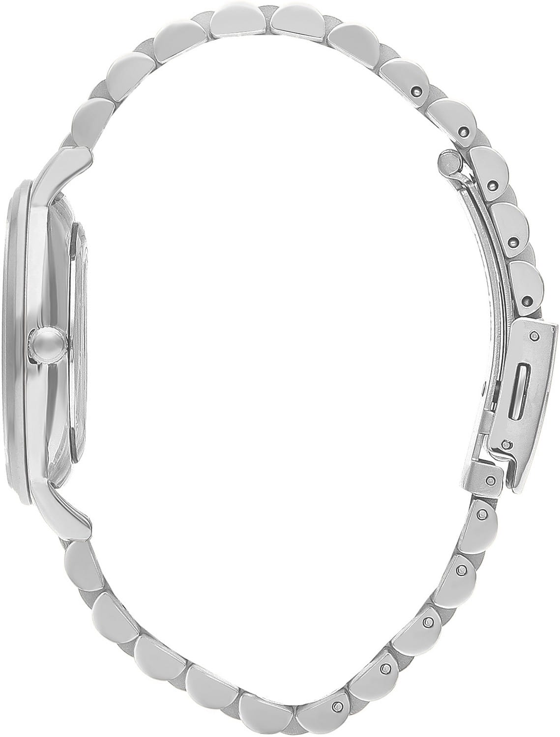 Женские часы Lee Cooper LC07548.320 — это стильное сочетание элегантности и современного дизайна. Круглый корпус диаметром 36 мм выполнен из суперметалла серебристого цвета, что придает модели особый блеск. Циферблат защищен минеральным стекломМинеральное стеклоМинеральное стекло представляет собой искусственно выращенный минерал кварца. Такое стекло отличается особой устойчивостью к повреждениям и царапинам. Уступает по некоторым качествам сапфировому стеклу., обеспечивающим устойчивость к царапинам и украшен цирконами в виде меток. Часы оснащены надежным кварцевым механизмом, а металлический браслет на раскладной застёжкеРаскладная застёжкаТакой тип застёжки используется только на браслетах из металла. Она никогда не раскрывается полностью, происходит разделение на 2 и более частей. Раскладывающая застёжка снизит вероятность потери часов к минимуму. гарантирует комфортную посадку на запястье. Водозащита 30 метров защищает модель от случайных брызг и дождя. Lee Cooper — отличный выбор для тех, кто ценит утонченность и качество.