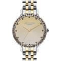 Женские часы Lee Cooper LC07590.210 — это стильное сочетание элегантности и современного дизайна. Круглый корпус диаметром 34 мм выполнен из суперметалла серебристого цвета. Неподвижный безельБезельВнешний ободок, закрепляющий стекло. В спортивных часах так называется поворотное кольцо с делениями на циферблате, выполняет роль таймера – замеряет отрезки времени на шкале. Неподвижный безель – элемент декора. Однонаправленно вращающийся безель на дайверских часах позволяет фиксировать моменты погружения и выныривания на поверхность. инкрустирован цирконами, что придает модели особый блеск. Градиентный циферблат с минималистичными метками в виде точек придает часам элегантность и утонченность, делая их идеальным аксессуаром для любой женщины, а минеральное стеклоМинеральное стеклоМинеральное стекло представляет собой искусственно выращенный минерал кварца. Такое стекло отличается особой устойчивостью к повреждениям и царапинам. Уступает по некоторым качествам сапфировому стеклу., обеспечивает устойчивость к царапинам. Центральные часовая, минутная и секундная стрелки. Часы оснащены надежным кварцевым механизмом, источник питания - батарейка. Металлический браслет с частичным IP-покрытиемIP-покрытиеМетод ионного напыления. Демонстрирует повышенную устойчивость к истиранию, окислению и химическим веществам. Под воздействием высокого давления и температуры около 1500°C молекулы металла надёжно соединяются с частицами корпуса часов. на раскладной застёжкеРаскладная застёжкаТакой тип застёжки используется только на браслетах из металла. Она никогда не раскрывается полностью, происходит разделение на 2 и более частей. Раскладывающая застёжка снизит вероятность потери часов к минимуму. гарантирует комфортную посадку на запястье. Водозащита 30 метров защищает модель от случайных брызг и дождя. Lee Cooper  — отличный выбор для тех, кто ценит утонченность и качество.