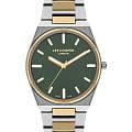 Женские кварцевые часы Lee Cooper LC07609.270 — это классический аксессуар с современным акцентом. Корпус диаметром 34 мм выполнен из суперметалла с частичным IP-покрытиемIP-покрытиеМетод ионного напыления. Демонстрирует повышенную устойчивость к истиранию, окислению и химическим веществам. Под воздействием высокого давления и температуры около 1500°C молекулы металла надёжно соединяются с частицами корпуса часов. жёлтого золота. Циферблат зелёного цвета оформлен индексами, а стрелки и метки оснащены люминесцентным покрытиемЛюминесцентное покрытиеПозволяет считывать показания времени в темноте. Производители наносят на стрелки, часовые индексы, безель или поверхность циферблата светонакопительный состав, дающий холодное свечение., обеспечивающим хорошую читаемость в темноте. Циферблат защищён минеральным стекломМинеральное стеклоМинеральное стекло представляет собой искусственно выращенный минерал кварца. Такое стекло отличается особой устойчивостью к повреждениям и царапинам. Уступает по некоторым качествам сапфировому стеклу.. Часы оснащены двухцветным стальным браслетом с частичным IP-покрытием на раскладной застёжкеРаскладная застёжкаТакой тип застёжки используется только на браслетах из металла. Она никогда не раскрывается полностью, происходит разделение на 2 и более частей. Раскладывающая застёжка снизит вероятность потери часов к минимуму.. Водонепроницаемость 30 м позволяет использовать часы в повседневных условиях, защищая от случайных брызг и капель дождя. Сочетание лаконичного дизайна и надёжного исполнения делает эти часы универсальным выбором на каждый день.