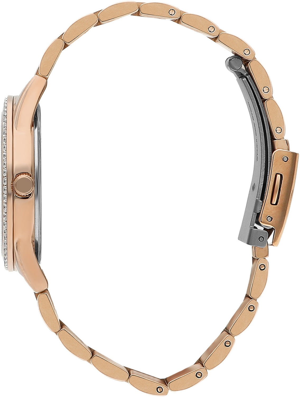 Женские наручные часы Lee Cooper LC07679.430 — это элегантная модель с утончённым дизайном. Корпус диаметром 35 мм выполнен из суперметалла с IP-покрытиемIP-покрытиеМетод ионного напыления. Демонстрирует повышенную устойчивость к истиранию, окислению и химическим веществам. Под воздействием высокого давления и температуры около 1500°C молекулы металла надёжно соединяются с частицами корпуса часов., что придаёт часам изысканный вид. Лаконичный циферблат украшен изящными метками и стрелками, обеспечивая удобное считывание времени. Циферблат защищён минеральным стекломМинеральное стеклоМинеральное стекло представляет собой искусственно выращенный минерал кварца. Такое стекло отличается особой устойчивостью к повреждениям и царапинам. Уступает по некоторым качествам сапфировому стеклу., устойчивым к царапинам. Изысканный безельБезельВнешний ободок, закрепляющий стекло. В спортивных часах так называется поворотное кольцо с делениями на циферблате, выполняет роль таймера – замеряет отрезки времени на шкале. Неподвижный безель – элемент декора. Однонаправленно вращающийся безель на дайверских часах позволяет фиксировать моменты погружения и выныривания на поверхность. украшен вставками из циркония. Часы работают на кварцевом механизме, обеспечивая точность хода. Браслет из нержавеющей стали с IP-покрытиемIP-покрытиеМетод ионного напыления. Демонстрирует повышенную устойчивость к истиранию, окислению и химическим веществам. Под воздействием высокого давления и температуры около 1500°C молекулы металла надёжно соединяются с частицами корпуса часов. имеет раскладную застёжкуРаскладная застёжкаТакой тип застёжки используется только на браслетах из металла. Она никогда не раскрывается полностью, происходит разделение на 2 и более частей. Раскладывающая застёжка снизит вероятность потери часов к минимуму., гарантирующую комфортное ношение и надёжную фиксацию на запястье. Водозащита WR30 защищает часы от случайных брызг и дождя, делая их подходящими для повседневного использования.