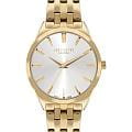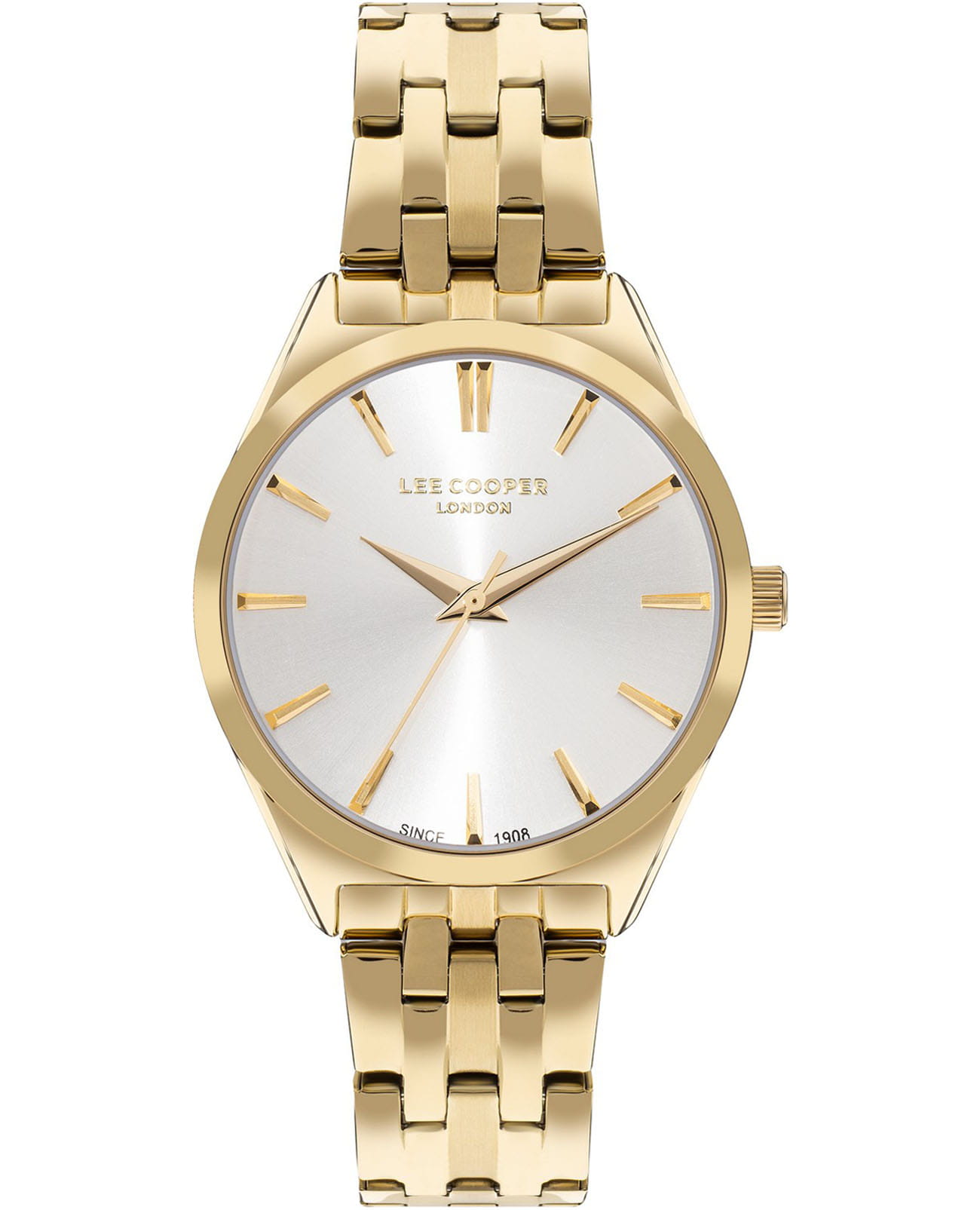 Женские часы Lee Cooper LC07833.130 — это стильное сочетание элегантности и современного дизайна. Изысканный круглый корпус диаметром 34 мм выполнен из суперметалла с IP-покрытиемIP-покрытиеМетод ионного напыления. Демонстрирует повышенную устойчивость к истиранию, окислению и химическим веществам. Под воздействием высокого давления и температуры около 1500°C молекулы металла надёжно соединяются с частицами корпуса часов. золотого цвета, что придает модели особый блеск. Серебристый циферблат защищен минеральным стекломМинеральное стеклоМинеральное стекло представляет собой искусственно выращенный минерал кварца. Такое стекло отличается особой устойчивостью к повреждениям и царапинам. Уступает по некоторым качествам сапфировому стеклу., обеспечивающим устойчивость к царапинам. Метки в виде лаконичных штрихов. Часы оснащены надежным кварцевым механизмом, а изящный стальной браслет с IP-покрытиемIP-покрытиеМетод ионного напыления. Демонстрирует повышенную устойчивость к истиранию, окислению и химическим веществам. Под воздействием высокого давления и температуры около 1500°C молекулы металла надёжно соединяются с частицами корпуса часов. на раскладной застёжкеРаскладная застёжкаТакой тип застёжки используется только на браслетах из металла. Она никогда не раскрывается полностью, происходит разделение на 2 и более частей. Раскладывающая застёжка снизит вероятность потери часов к минимуму. гарантирует комфортную посадку на запястье. Водозащита 30 метров защищает модель от случайных брызг и дождя. Lee Cooper  — отличный выбор для тех, кто ценит утонченность и качество.