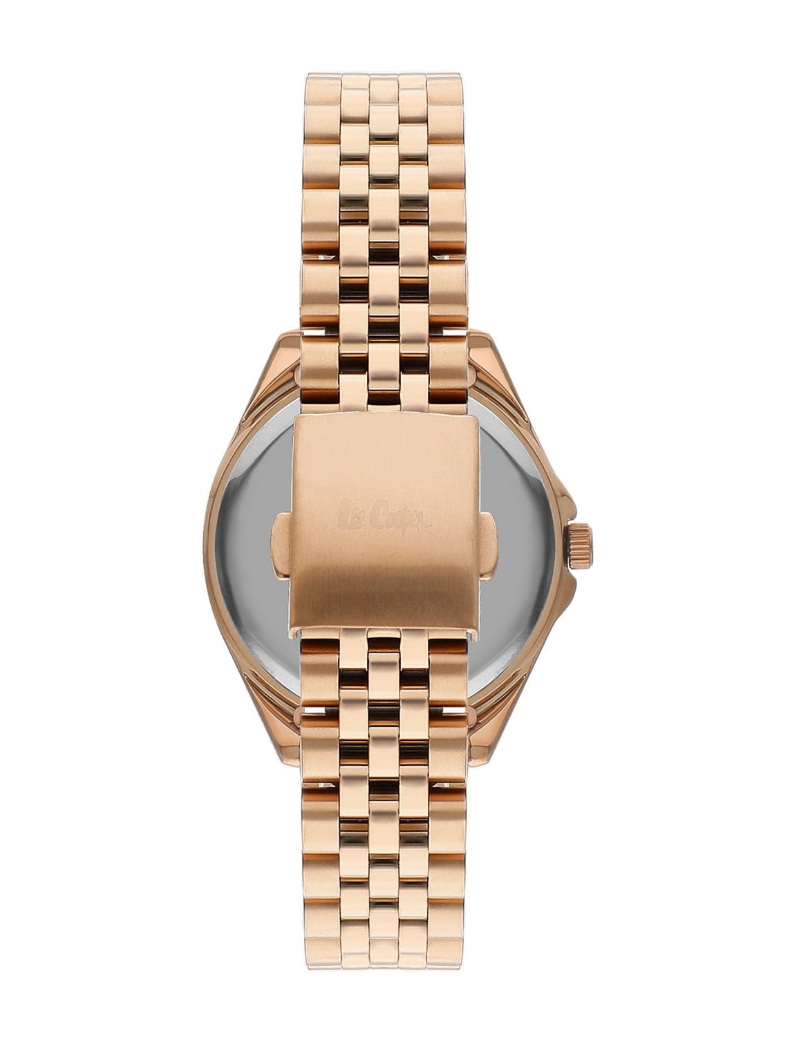 Женские часы Lee Cooper LC07837.430 — это стильное сочетание элегантности и современного дизайна. Корпус диаметром 36 мм выполнен из суперметалла с IP-покрытиемIP-покрытиеМетод ионного напыления. Демонстрирует повышенную устойчивость к истиранию, окислению и химическим веществам. Под воздействием высокого давления и температуры около 1500°C молекулы металла надёжно соединяются с частицами корпуса часов. золотого цвета, придающий модели особый блеск. Изысканный циферблат защищен минеральным стекломМинеральное стеклоМинеральное стекло представляет собой искусственно выращенный минерал кварца. Такое стекло отличается особой устойчивостью к повреждениям и царапинам. Уступает по некоторым качествам сапфировому стеклу., обеспечивающим устойчивость к царапинам. Метки в виде штрихов. Вынесенный циферблат с 24-х часовым указателем времени, индикацией даты и дня недели. Стрелки и метки с люминесцентным покрытиемЛюминесцентное покрытиеПозволяет считывать показания времени в темноте. Производители наносят на стрелки, часовые индексы, безель или поверхность циферблата светонакопительный состав, дающий холодное свечение. позволяют легко считывать время даже в условиях недостаточного освещения. Часы оснащены надежным кварцевым механизмом, а стальной браслет с IP-покрытиемIP-покрытиеМетод ионного напыления. Демонстрирует повышенную устойчивость к истиранию, окислению и химическим веществам. Под воздействием высокого давления и температуры около 1500°C молекулы металла надёжно соединяются с частицами корпуса часов. на раскладной застёжкеРаскладная застёжкаТакой тип застёжки используется только на браслетах из металла. Она никогда не раскрывается полностью, происходит разделение на 2 и более частей. Раскладывающая застёжка снизит вероятность потери часов к минимуму. гарантирует комфортную посадку на запястье. Водозащита 50 метров защищает модель от случайных брызг и дождя. Lee Cooper — отличный выбор для тех, кто ценит утонченность и качество.