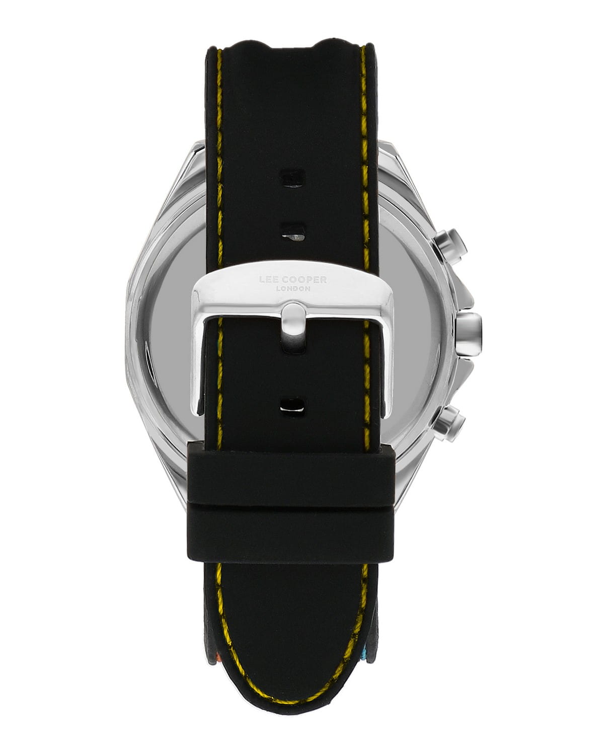Мужские часы Lee Cooper LC07848.311 выполнены в классическом стиле и сочетают строгий дизайн с надёжным механизмом. Модель оснащена кварцевым механизмом, обеспечивающим точность хода и минимальное обслуживание. Корпус имеет размер 45 мм, изготовлен из суперметалла с поворотным безелемБезельВнешний ободок, закрепляющий стекло. В спортивных часах так называется поворотное кольцо с делениями на циферблате, выполняет роль таймера – замеряет отрезки времени на шкале. Неподвижный безель – элемент декора. Однонаправленно вращающийся безель на дайверских часах позволяет фиксировать моменты погружения и выныривания на поверхность.. Циферблат желтого цвета дополнен индексами для чёткого отсчёта времени, а также функциями отображения даты, дня недели, 24-часового индикатора и второго часового поясаВторой часовой поясФункция, позволяющая отображать время двух часовых поясов одновременно.. Защиту циферблата обеспечивает минеральное стеклоМинеральное стеклоМинеральное стекло представляет собой искусственно выращенный минерал кварца. Такое стекло отличается особой устойчивостью к повреждениям и царапинам. Уступает по некоторым качествам сапфировому стеклу., устойчивое к мелким механическим повреждениям. Циферблат украшен стрелками и метками с люминесцентным покрытиемЛюминесцентное покрытиеПозволяет считывать показания времени в темноте. Производители наносят на стрелки, часовые индексы, безель или поверхность циферблата светонакопительный состав, дающий холодное свечение., гармонично дополняющим общий дизайн модели. Ремень из каучука оснащен стандартной застежкой, обеспечивающим комфортное и безопасное ношение. Водозащита 5 АТМ позволяет использовать часы в повседневных условиях без риска повреждения от случайных брызг воды. Это сочетание классического дизайна, прочности материалов и качества исполнения для уверенных в себе мужчин.