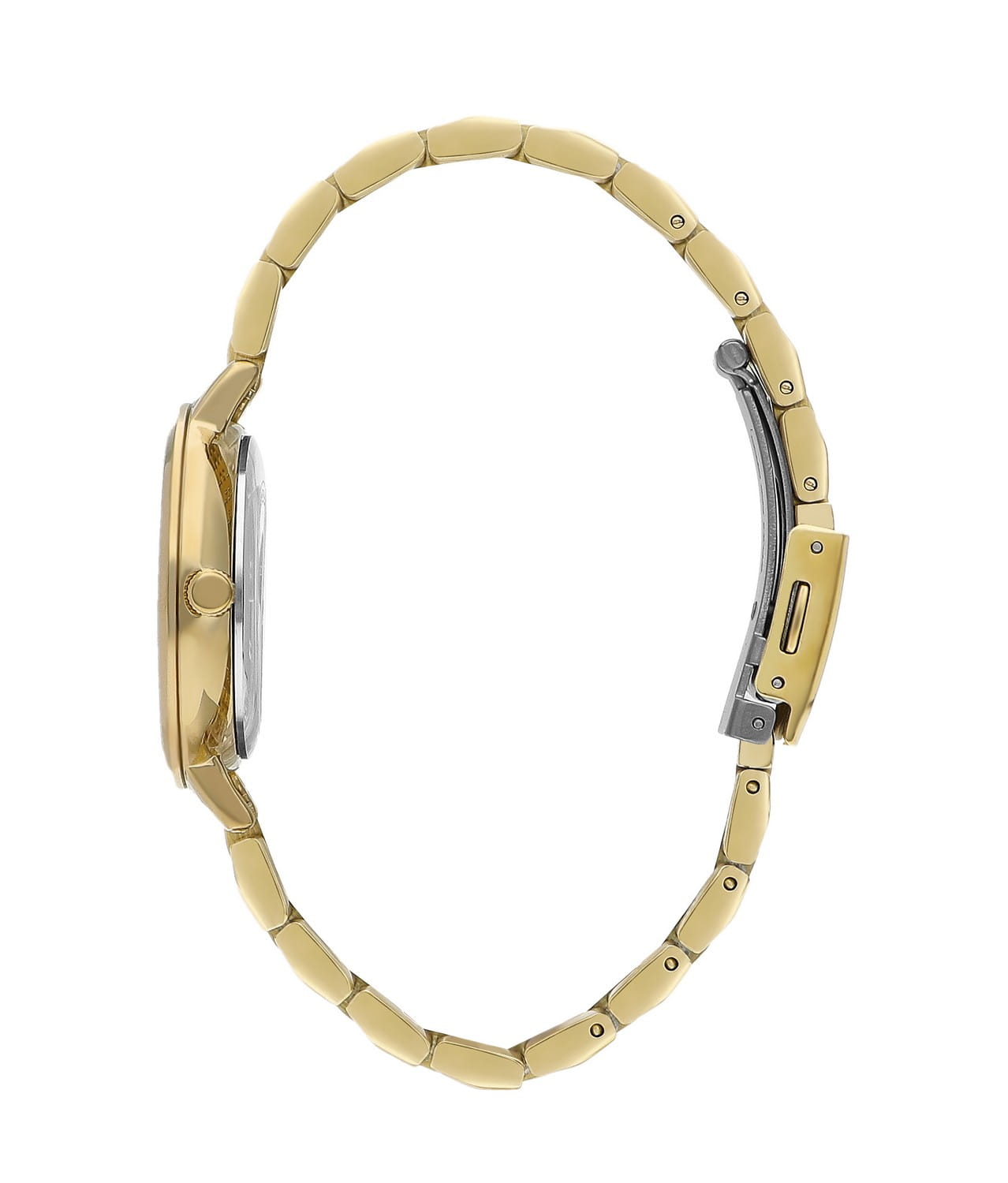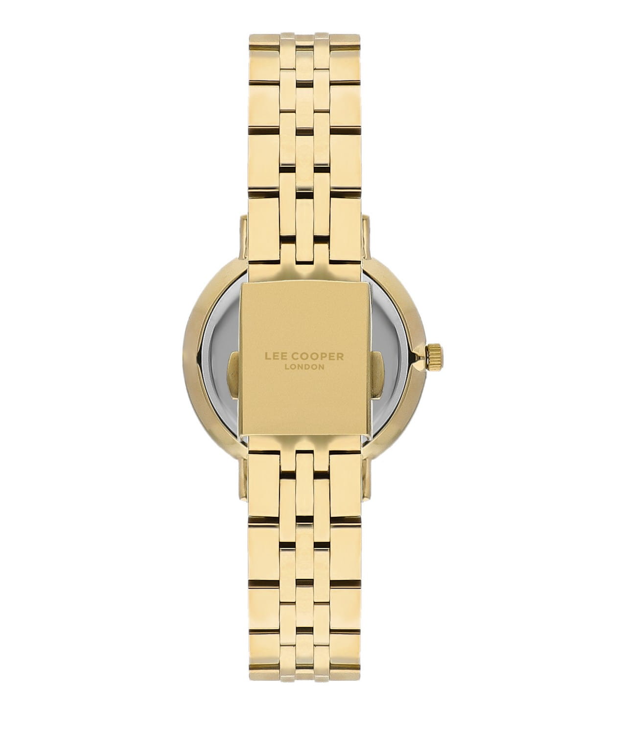 Женские часы Lee Cooper LC07857.120 — это стильное сочетание элегантности и современного дизайна. Изящный круглый корпус диаметром 34 мм выполнен из суперметалла с IP-покрытиемIP-покрытиеМетод ионного напыления. Демонстрирует повышенную устойчивость к истиранию, окислению и химическим веществам. Под воздействием высокого давления и температуры около 1500°C молекулы металла надёжно соединяются с частицами корпуса часов. золотого цвета, что придает модели особый блеск. Перламутровый циферблат защищен минеральным стекломМинеральное стеклоМинеральное стекло представляет собой искусственно выращенный минерал кварца. Такое стекло отличается особой устойчивостью к повреждениям и царапинам. Уступает по некоторым качествам сапфировому стеклу., обеспечивающим устойчивость к царапинам. Метки в виде штрихов. Часы оснащены надежным кварцевым механизмом, а стальной браслет с IP-покрытиемIP-покрытиеМетод ионного напыления. Демонстрирует повышенную устойчивость к истиранию, окислению и химическим веществам. Под воздействием высокого давления и температуры около 1500°C молекулы металла надёжно соединяются с частицами корпуса часов. на раскладной застёжкеРаскладная застёжкаТакой тип застёжки используется только на браслетах из металла. Она никогда не раскрывается полностью, происходит разделение на 2 и более частей. Раскладывающая застёжка снизит вероятность потери часов к минимуму. гарантирует комфортную посадку на запястье. Водозащита 30 метров защищает модель от случайных брызг и дождя. В комплекте к часам идет дополнительный браслет в цвет часов. Lee Cooper  — отличный выбор для тех, кто ценит утонченность и качество.