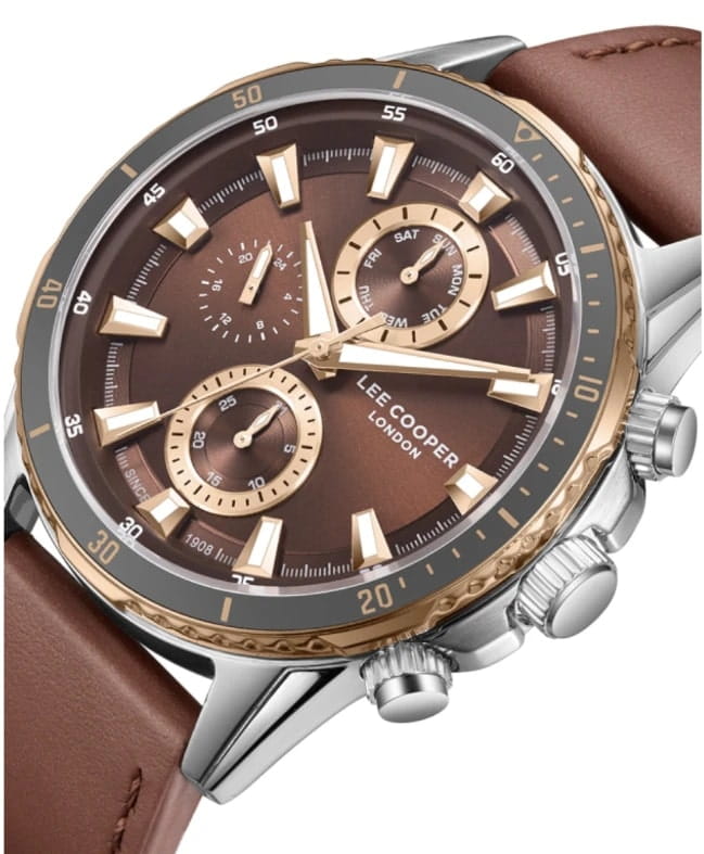Мужские наручные часы Lee Cooper LC08001.551 — это стильная модель из коллекции Contemporary, сочетающая в себе современный дизайн и функциональность. Часы оснащены кварцевым механизмом японского производства, который обеспечивает высокую точность хода и минимальное энергопотребление. Корпус часов изготовлен из высококачественного суперметалла серебристого цвета, что делает их устойчивыми к внешним воздействиям и придает благородный вид. Коричневый циферблат украшен стрелками и индексами серебристого цвета, гармонично дополняющими общий дизайн модели. Для защиты циферблата используется минеральное стеклоМинеральное стеклоМинеральное стекло представляет собой искусственно выращенный минерал кварца. Такое стекло отличается особой устойчивостью к повреждениям и царапинам. Уступает по некоторым качествам сапфировому стеклу.,  устойчивое к царапинам и механическим повреждениям. Корпус имеет круглую форму с диаметром 43 мм, что делает часы заметными и подходящими для повседневной носки. Ремешок изготовлен из натуральной кожи. Застежка классическая. Модель обладает водонепроницаемостью до 30 метров (3 АТМ), что позволяет использовать часы в повседневной жизни, включая контакт с водой при мытье рук или дожде. Эти часы станут идеальным выбором для мужчин, ценящих стиль, качество и функциональность.