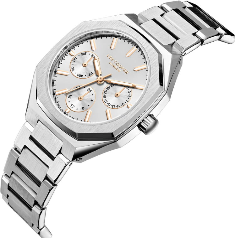 Женские наручные часы LEE COOPER LC08046.330 из коллекции Contemporary оснащены точным кварцевым механизмом, обеспечивающим высокую надежность и точность хода. Корпус часов изготовлен из суперметалла, что гарантирует долговечность и устойчивость к повреждениям. Три субдисплея с золотистой окантовкой отображают дату, день недели и 24-часовой формат времени, что добавляет функциональности и практичности. Для защиты циферблата используется , устойчивое к царапинам и механическим повреждениям. Интегрированный браслет изготовлен из нержавеющей стали, которая славится своей долговечностью и возможностью полировки. Браслет гармонично дополняет дизайн часов и обеспечивает комфортное ношение в течение дня благодаря раскладной застёжкеРаскладная застёжкаТакой тип застёжки используется только на браслетах из металла. Она никогда не раскрывается полностью, происходит разделение на 2 и более частей. Раскладывающая застёжка снизит вероятность потери часов к минимуму.. Эти часы сочетают в себе стиль и функциональность, что делает их универсальным аксессуаром, подходящим к любому образу. Модель станет прекрасным подарком. Часы обладают водонепроницаемостью до 30 метров (3 АТМ), что позволяет использовать их в повседневной жизни, включая контакт с водой при мытье рук или дожде.