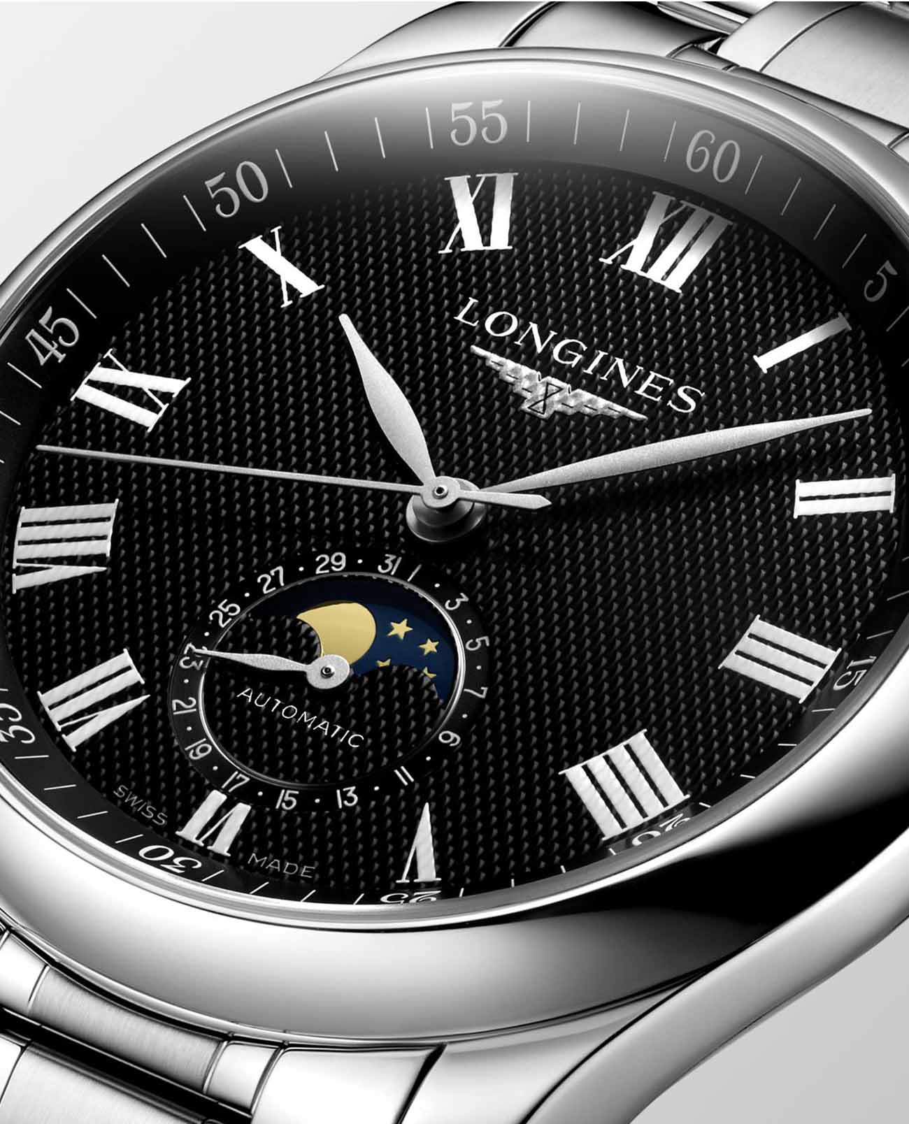 Черный циферблат с узором «barleycorn» выполнен в классическом стиле. Швейцарский автоматический механизм L899 с запасом хода на 64 часа надёжно защищён корпусом из нержавеющей стали 316L. Элегантный браслет выполнен из нержавеющей стали. Сапфировое стекло устойчиво к царапинам. Функции: календарь, индикация лунных фаз.