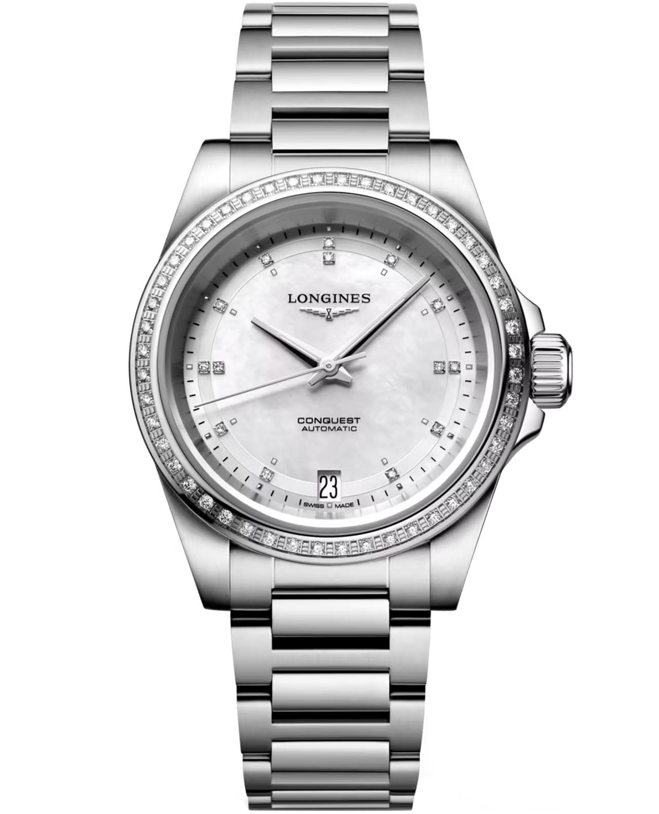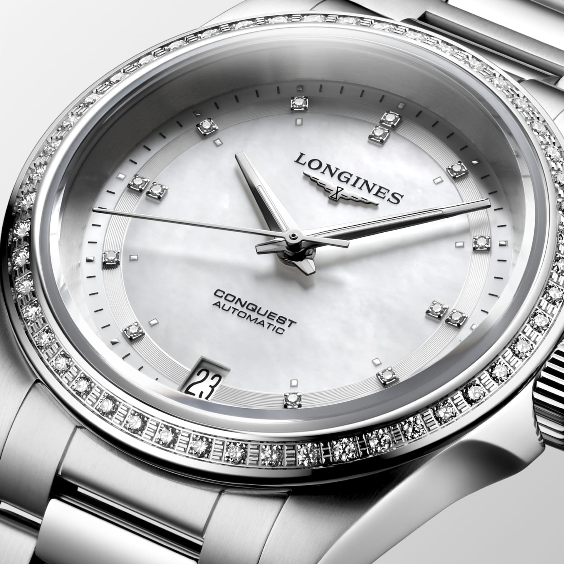 Женские швейцарские механические часы с автоподзаводом Longines Conquest L3.430.0.87.6. Сапфировое стеклоСапфировое стеклоПрочный и надёжный материал из кристалла сапфира синтетического происхождения, характеризующийся особой твёрдостью и устойчивостью к царапинам и повреждениям. устойчивое к появлению царапин, обладающее высокой прозрачностью. Корпус часов изготовлен из нержавеющей стали. Циферблат выполнен по технологии Sunray (солнечные лучи). Циферблат и безельБезельВнешний ободок, закрепляющий стекло. В спортивных часах так называется поворотное кольцо с делениями на циферблате, выполняет роль таймера – замеряет отрезки времени на шкале. Неподвижный безель – элемент декора. Однонаправленно вращающийся безель на дайверских часах позволяет фиксировать моменты погружения и выныривания на поверхность. украшены бриллиантами группы Top Wesselton VS-SI. Стрелки с люминесцентным покрытиемЛюминесцентное покрытиеПозволяет считывать показания времени в темноте. Производители наносят на стрелки, часовые индексы, безель или поверхность циферблата светонакопительный состав, дающий холодное свечение. Super-LumiNova. Окошко даты в положении 6 часов. Прозрачная задняя крышка. Класс водозащиты: 100 метров, позволит плавать, нырять и заниматься другими водными видами спорта. Стальной браслет на раскладной застёжкеРаскладная застёжкаТакой тип застёжки используется только на браслетах из металла. Она никогда не раскрывается полностью, происходит разделение на 2 и более частей. Раскладывающая застёжка снизит вероятность потери часов к минимуму..